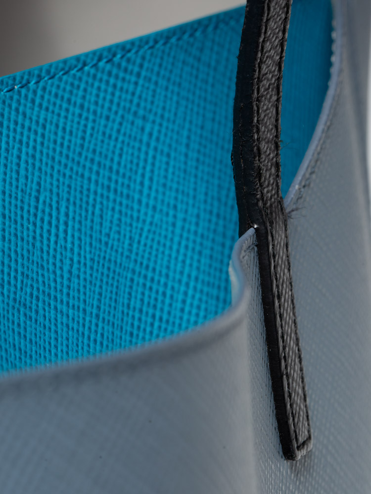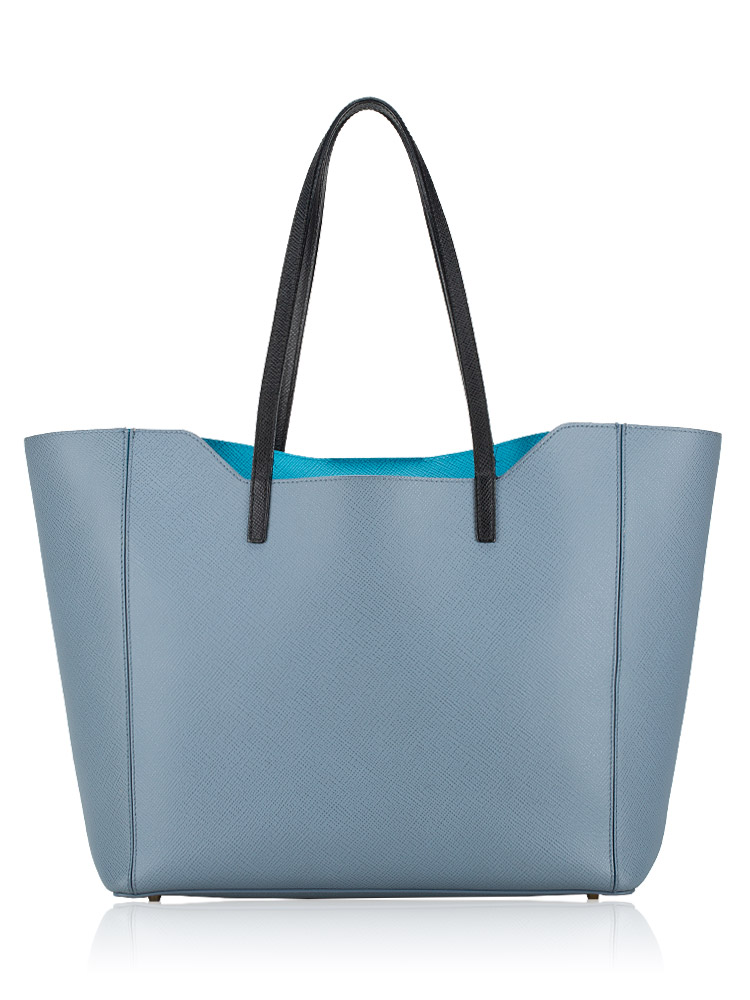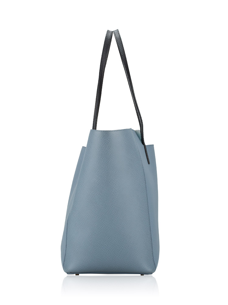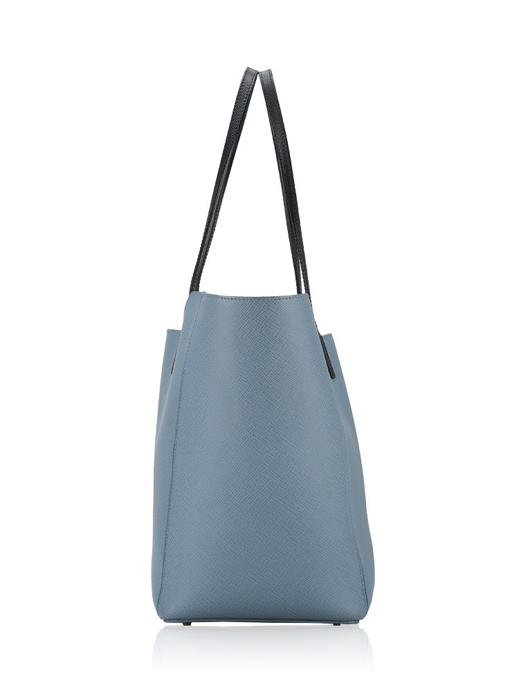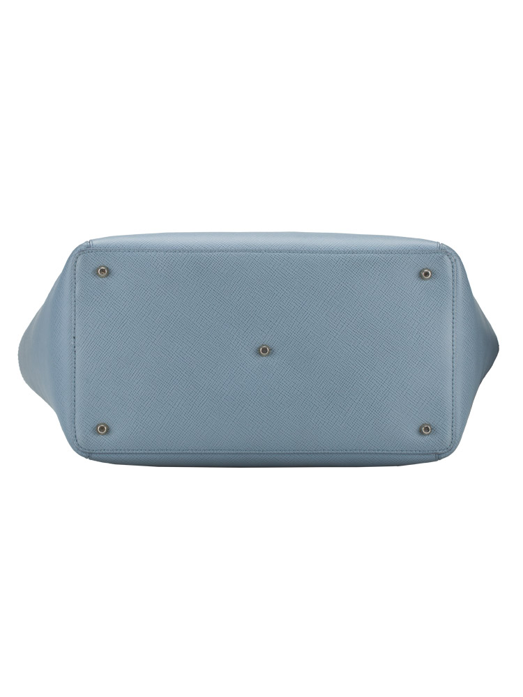 Made of saffiano leather. The bag features a magnetic closure that opens to smooth leather lining with exterior two slip pockets.