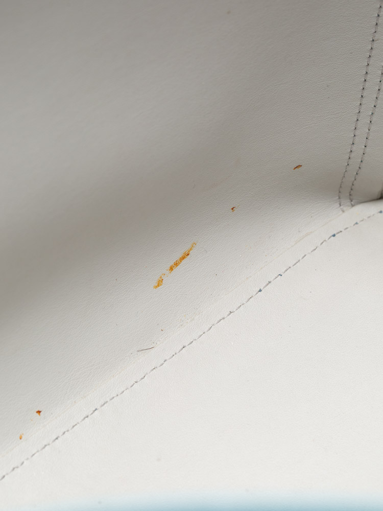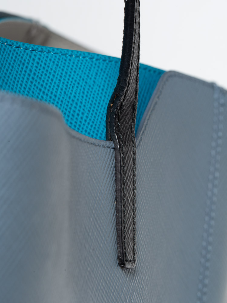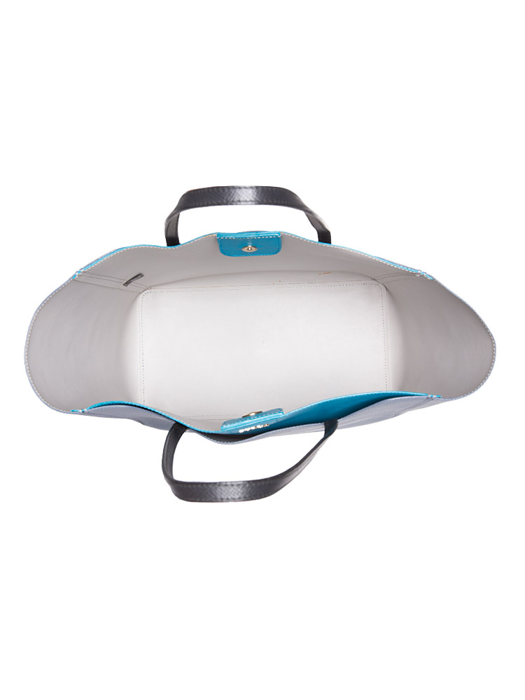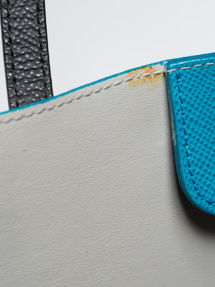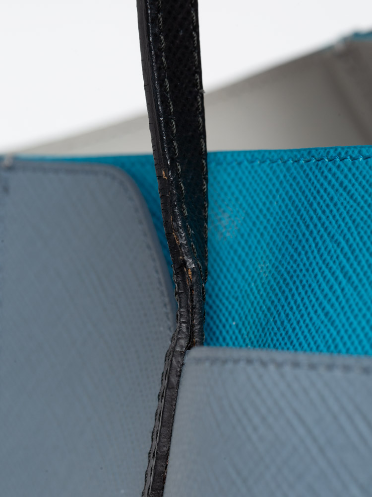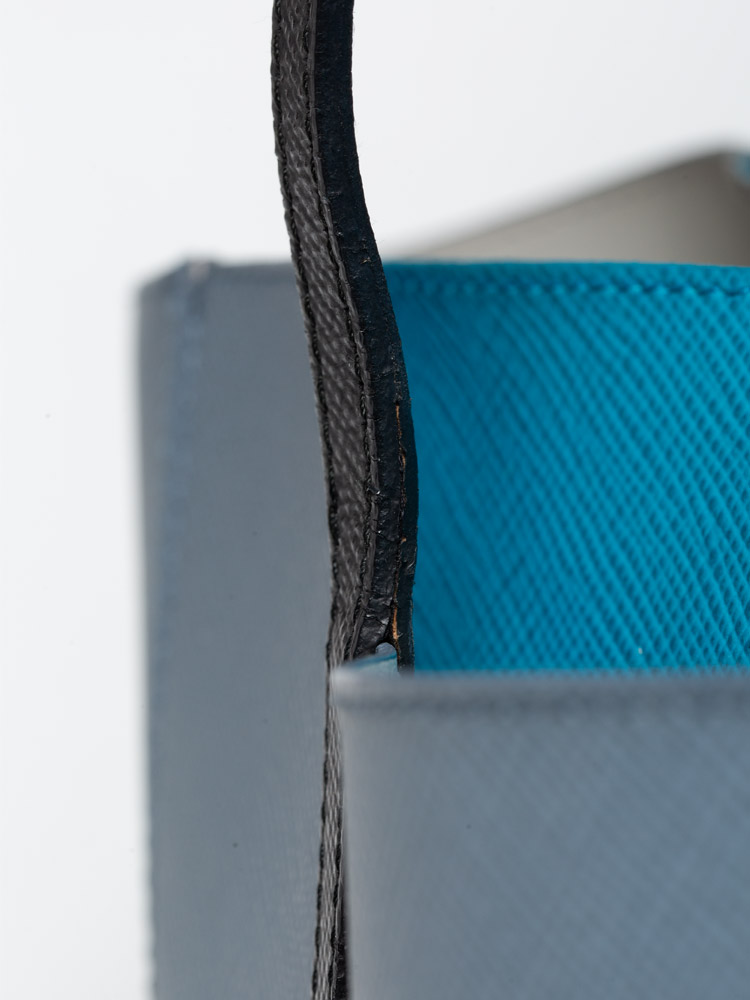 Made of saffiano leather. The bag features a magnetic closure that opens to smooth leather lining with exterior two slip pockets.