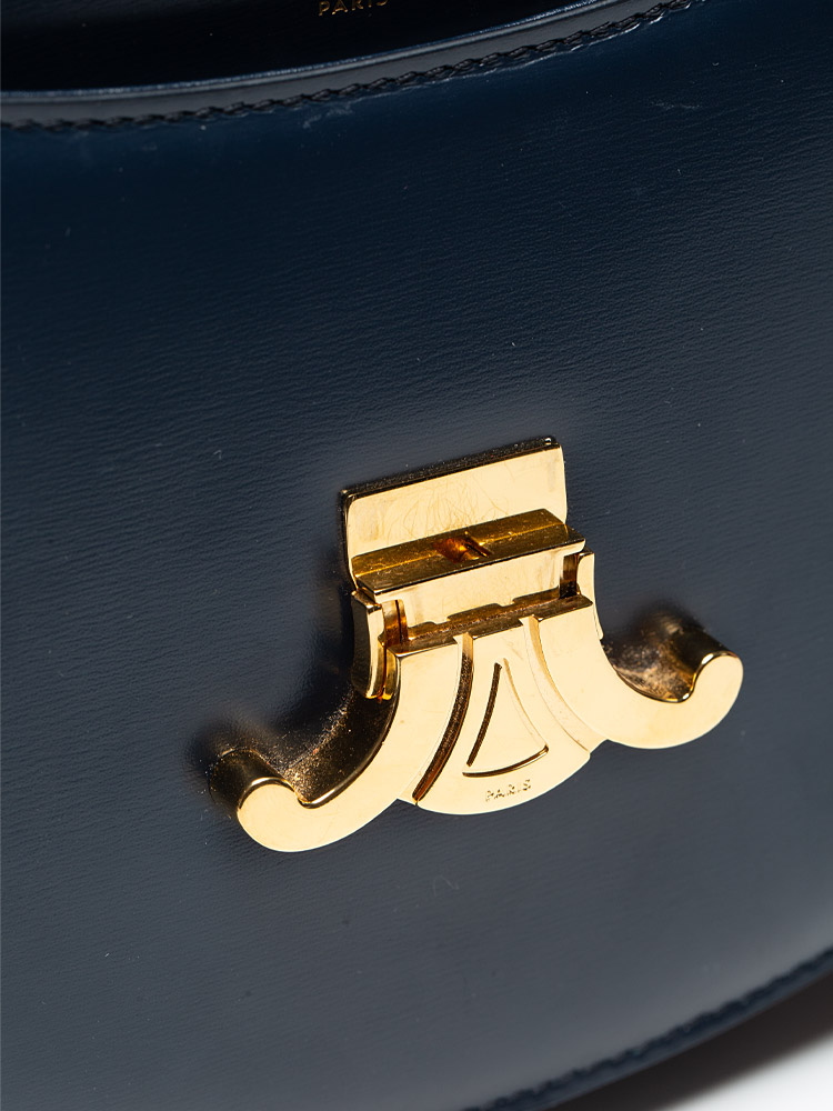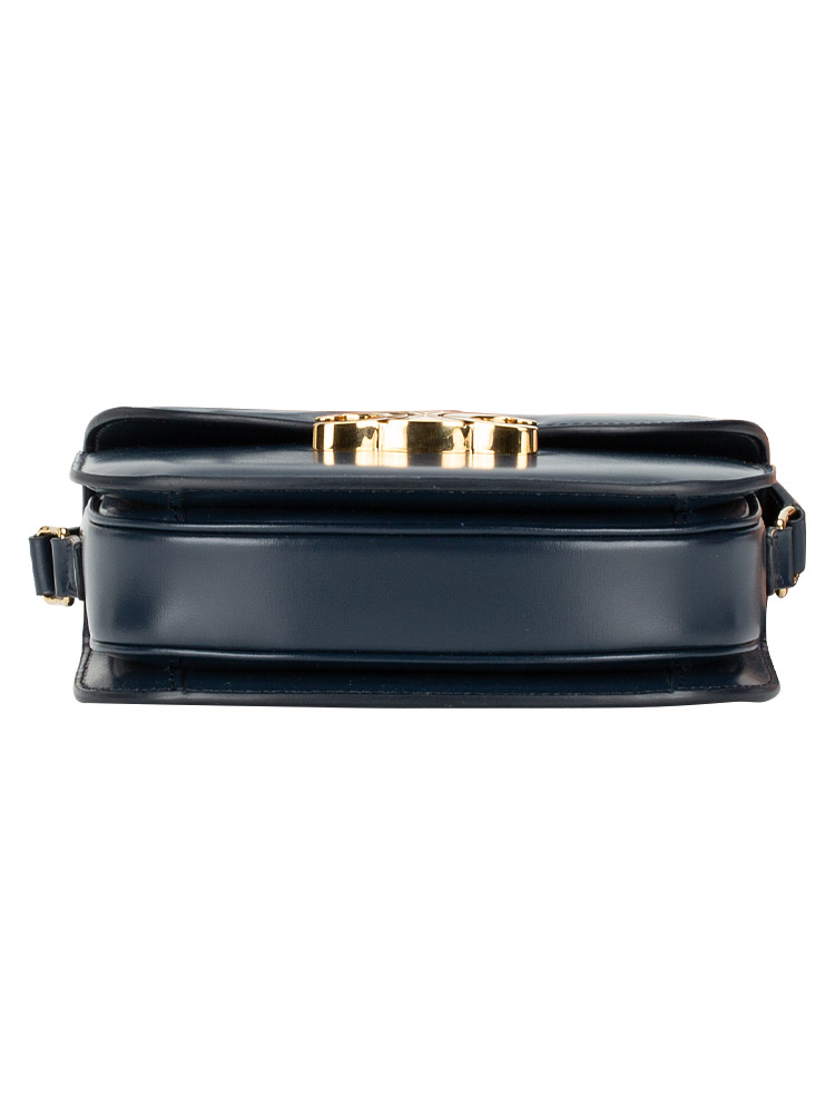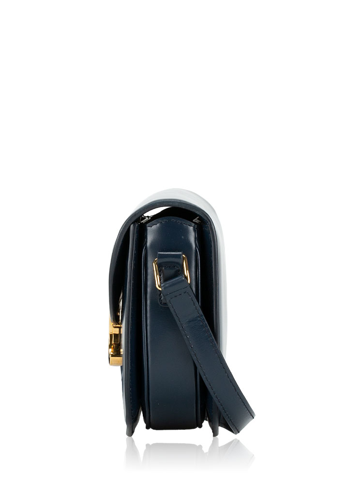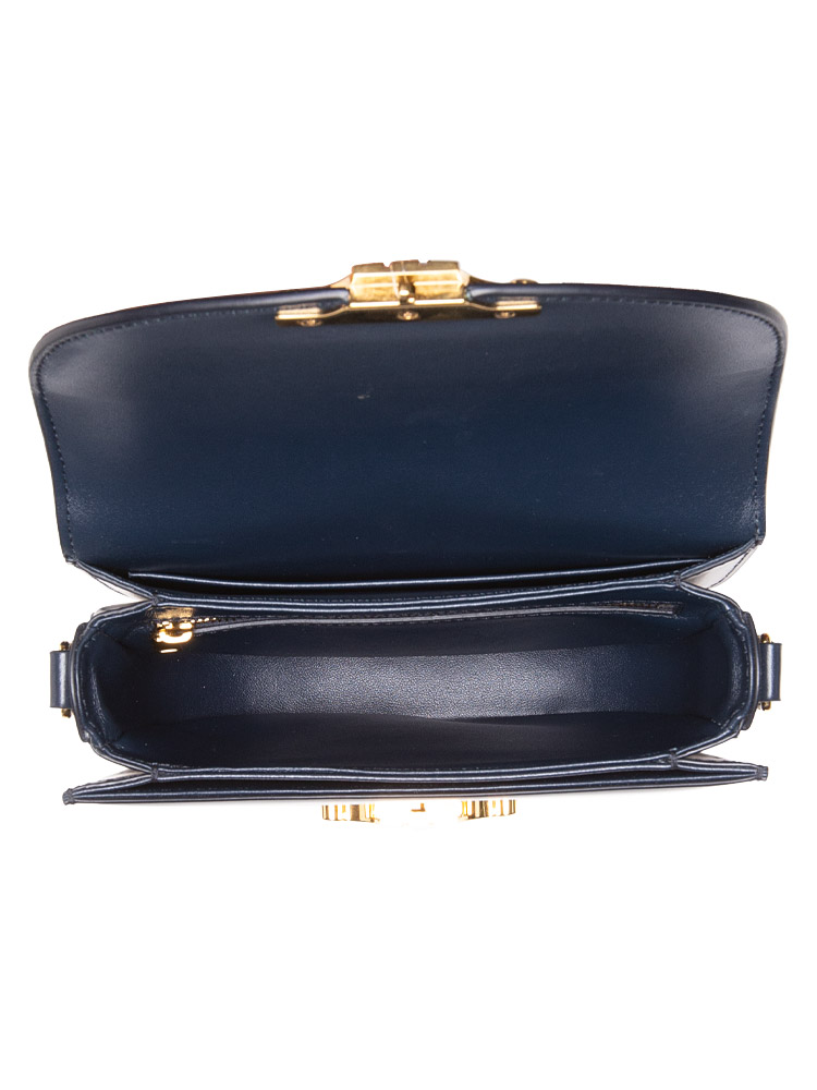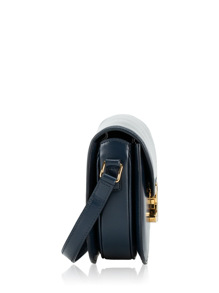 Crafted of smooth calfskin leather. The bag features an adjustable leather strap with polished gold hardware and a matching gold press lock on the crossover flap. It opens to a front pocket and leather interior with a zipper pocket.