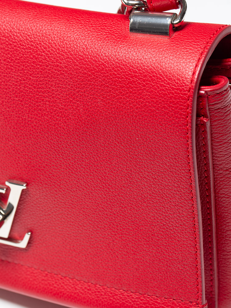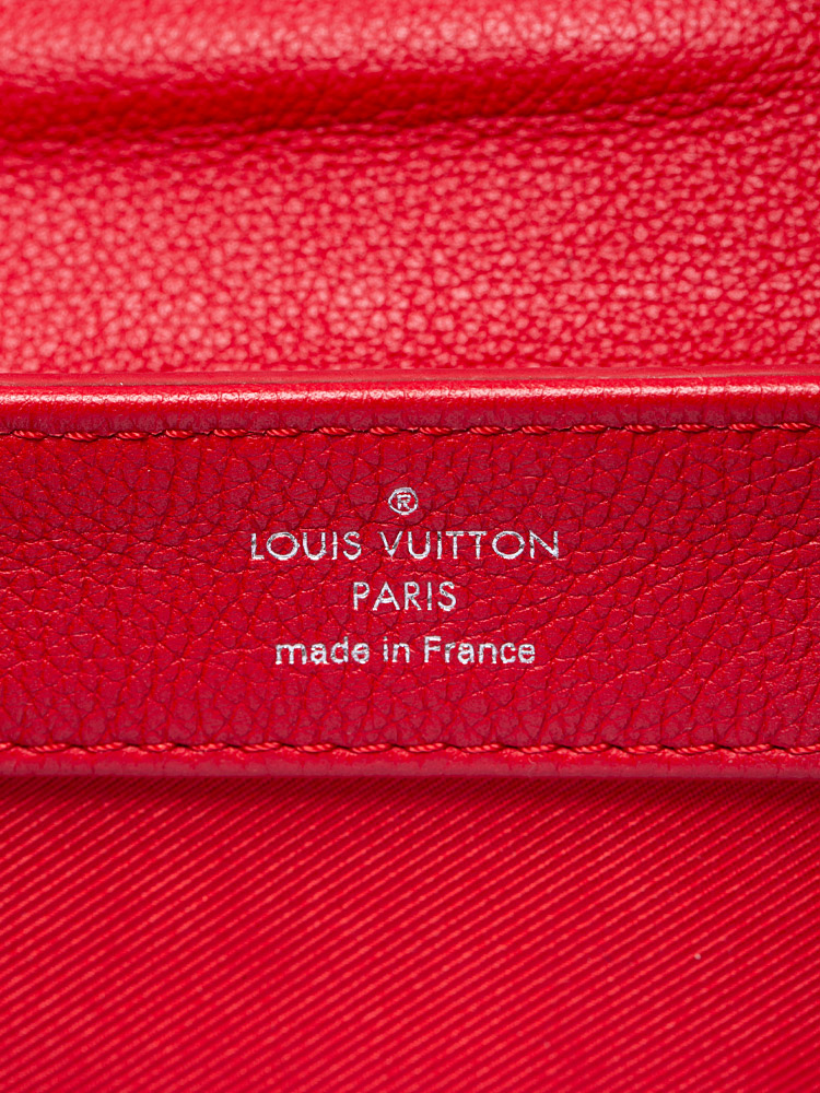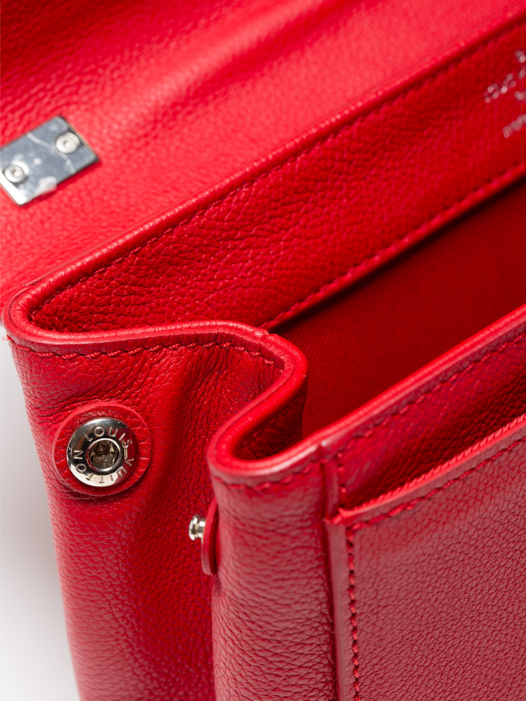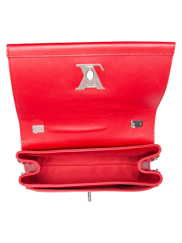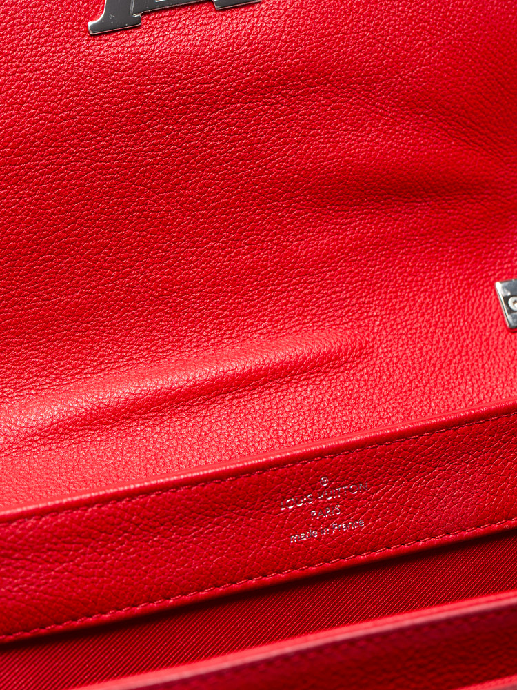 This bag is crafted of calfskin material. It features an optional shoulder strap with a leather pad, a silver chain link handle and a silver LV closure on the front flap. The flap opens to a front pocket and a fabric interior.