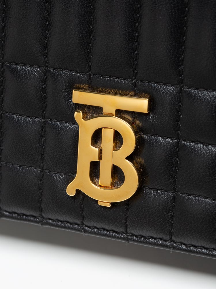 Crafted of square quilted lambskin leather. The bag features a gold chain link shoulder strap and a gold TB logo. It opens to a classic fabric interior with a patch pocket.