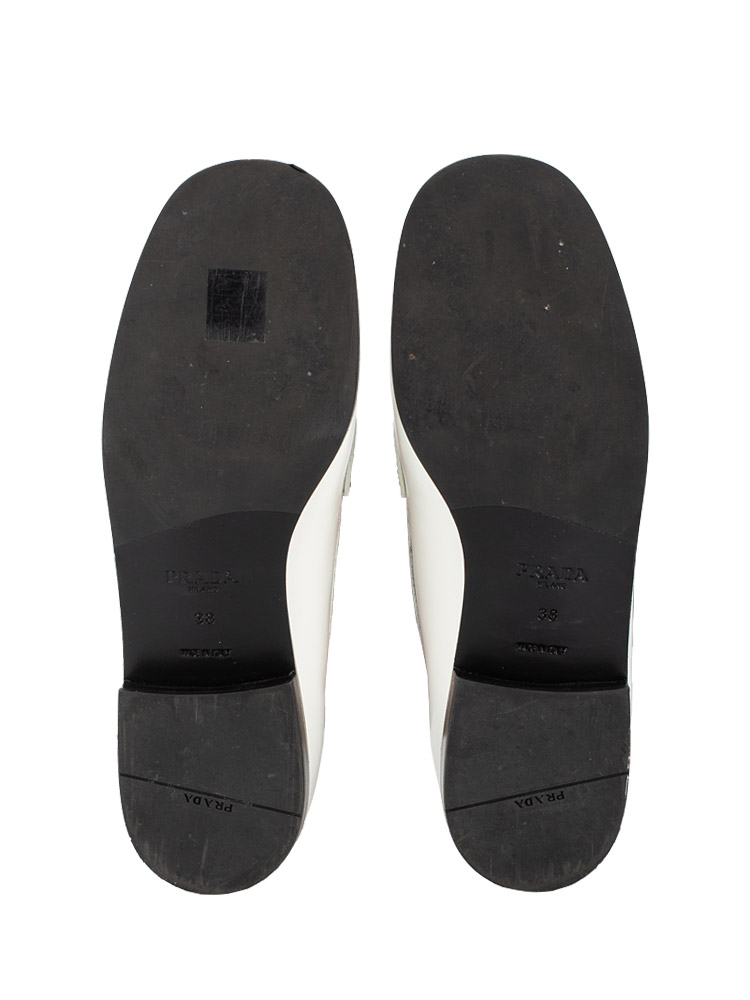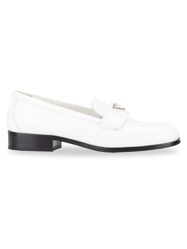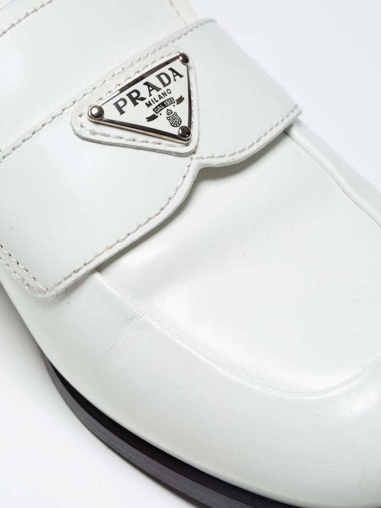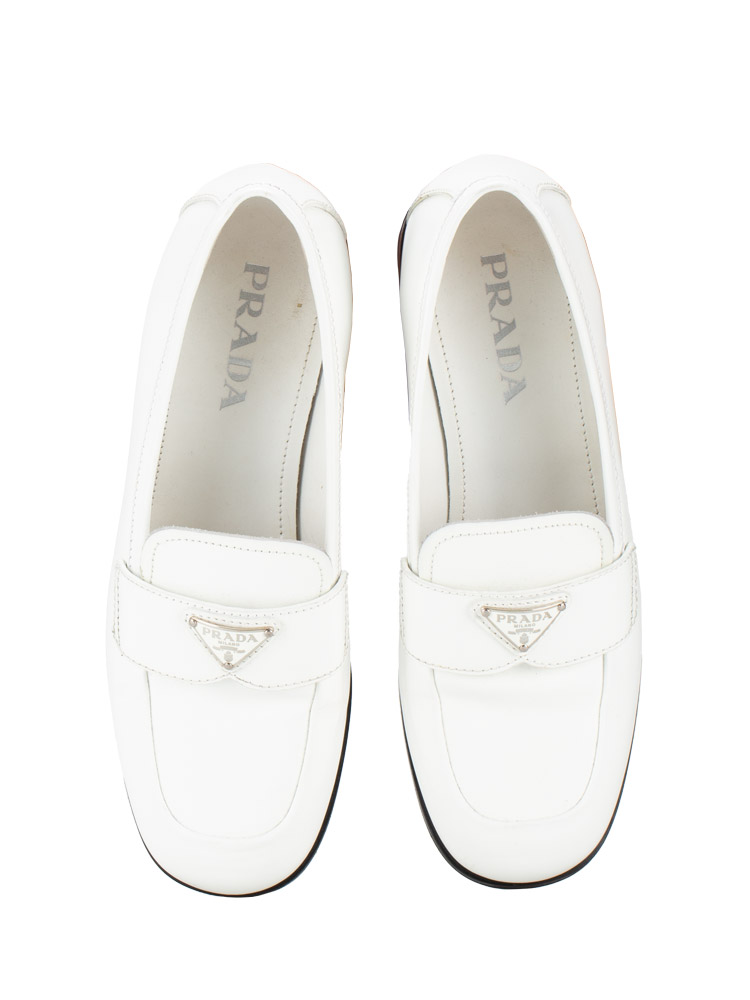 These loafers are crafted of smooth white leather with white stitching, a Prada triangle logo at front, and stacked 1 inch heel.