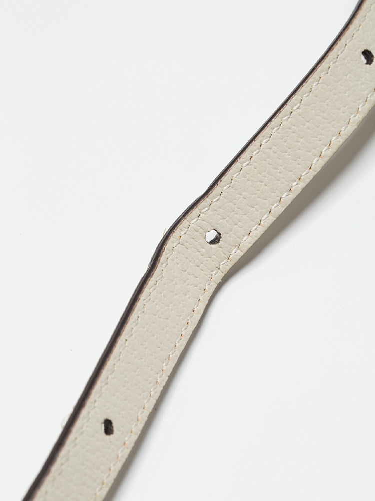 This backpack is crafted of calfskin leather in ivory. The bag features adjustable shoulder straps with gold links, a signature navy blue and red web detail on the front,