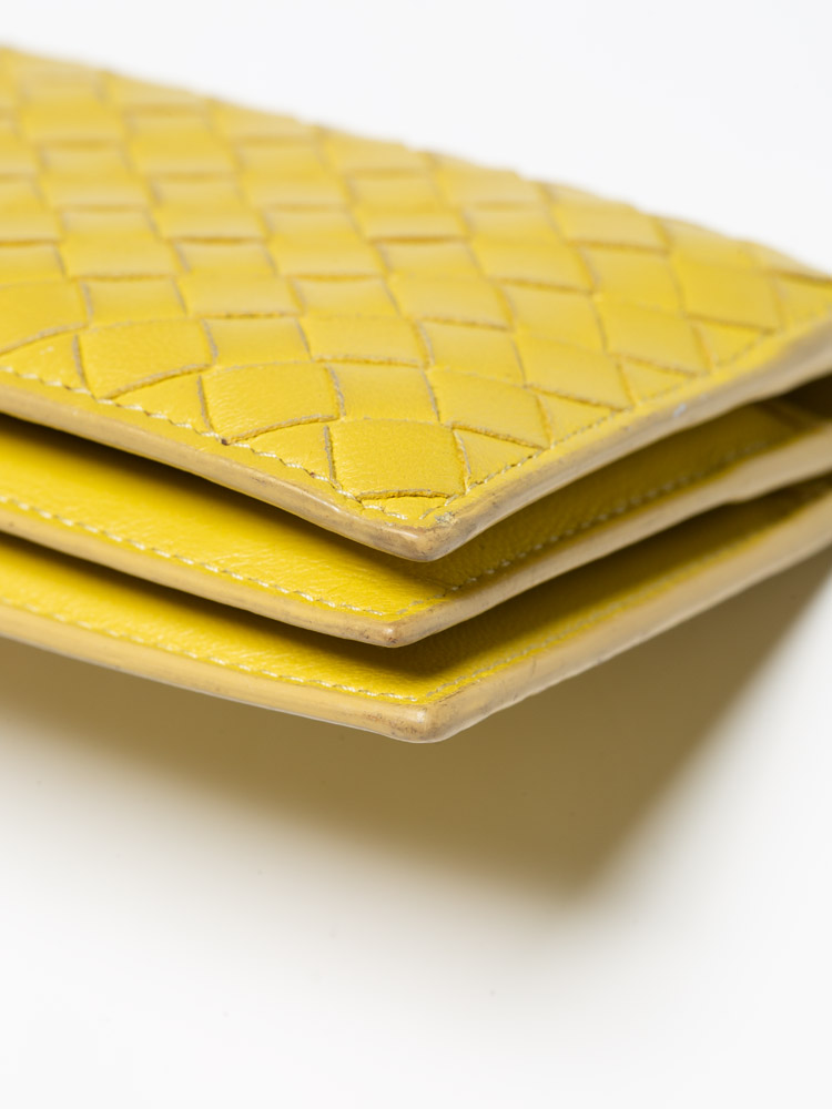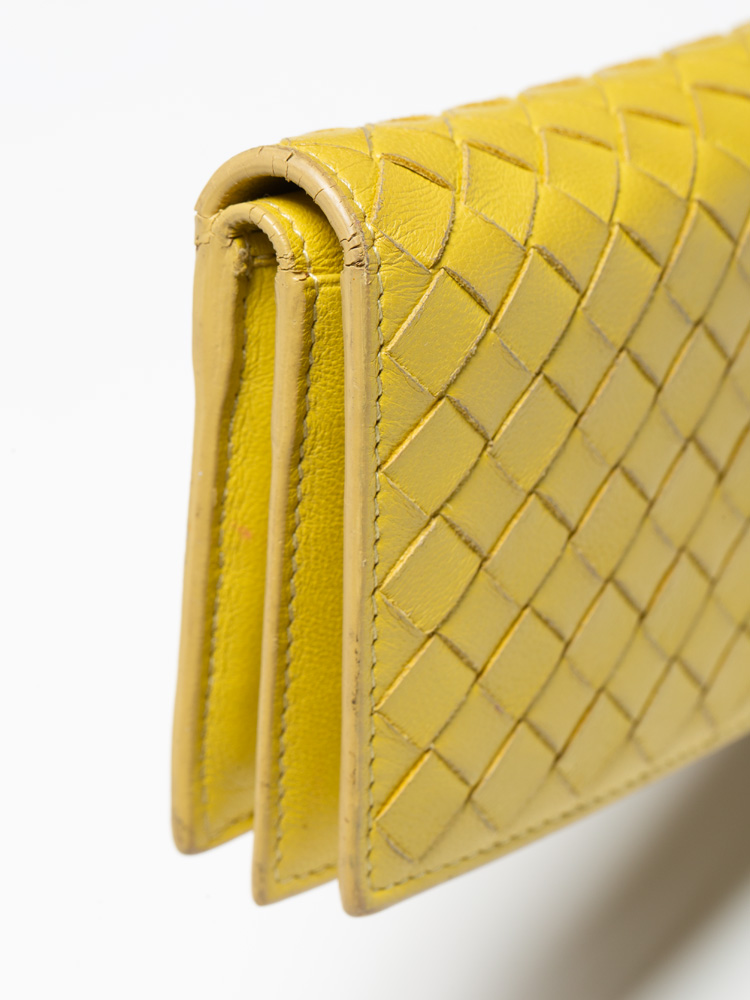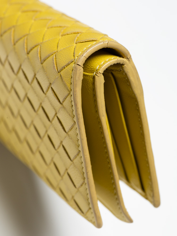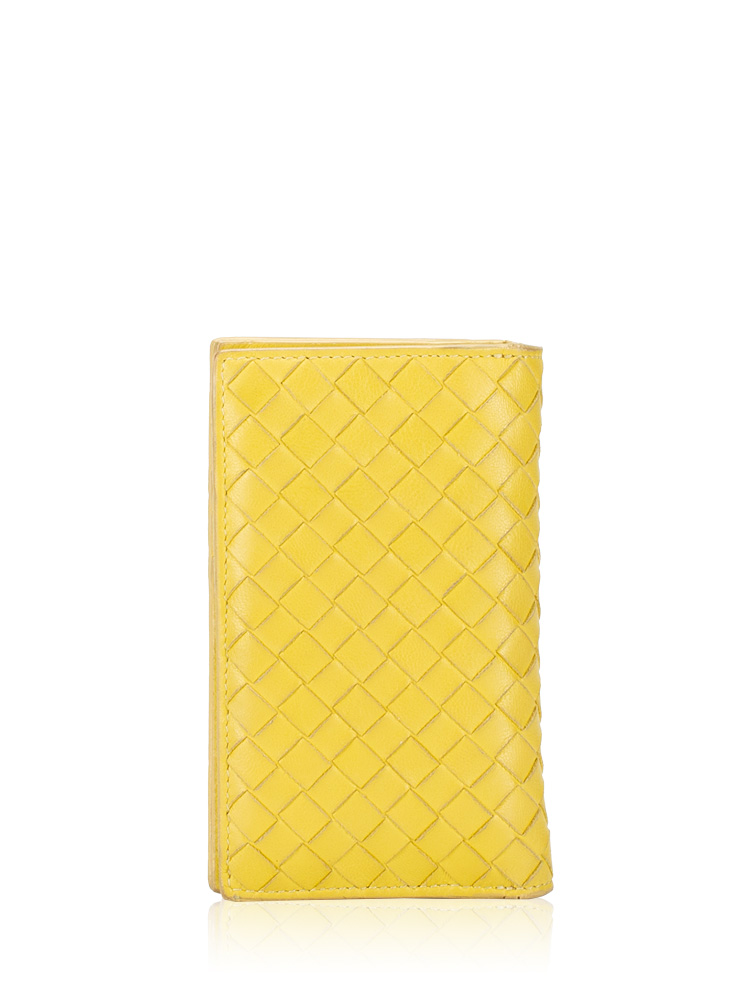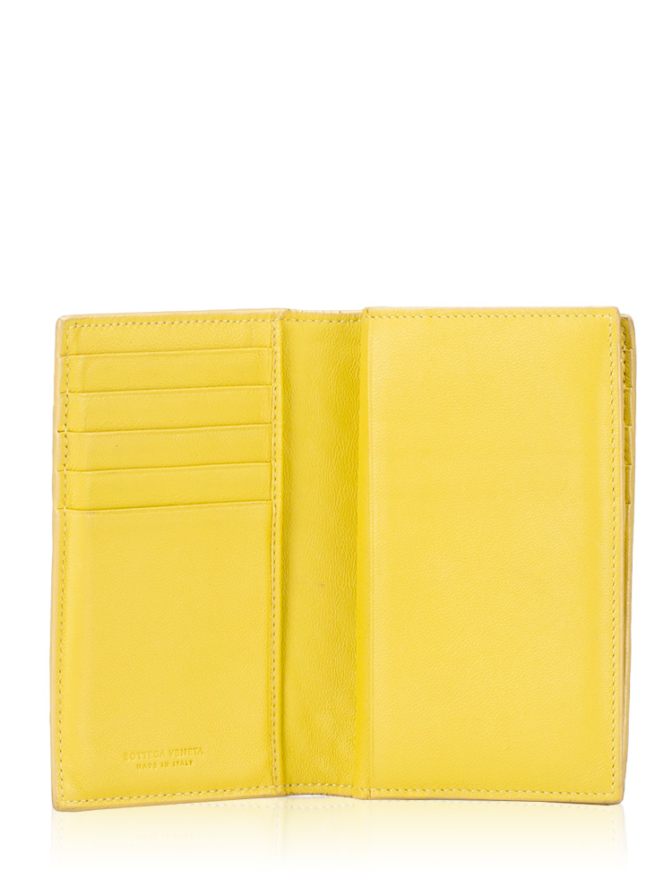 Crafted of intrecciato nappa calfskin leather. The flap opens to a matching leather interior with card slots and patch pockets.