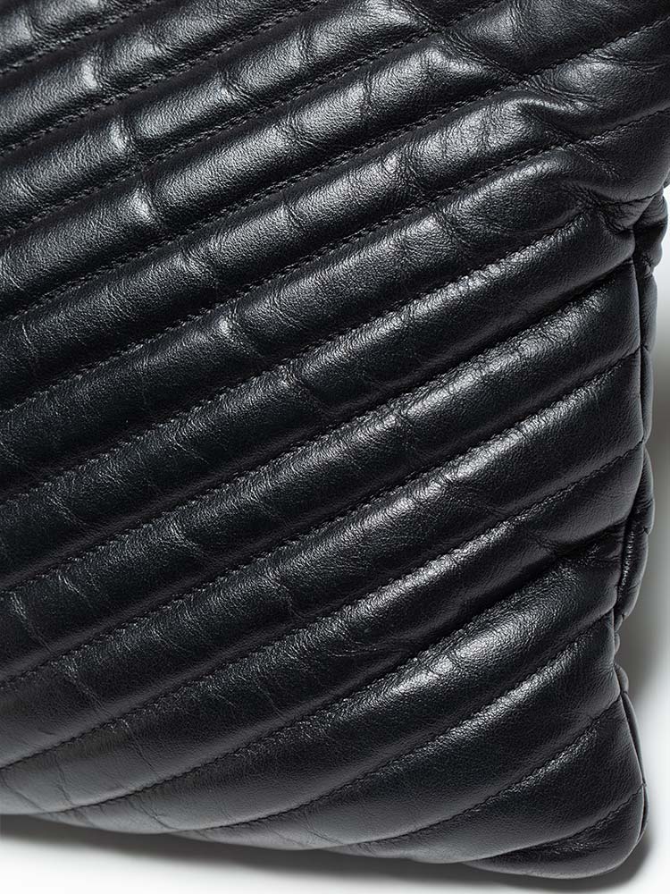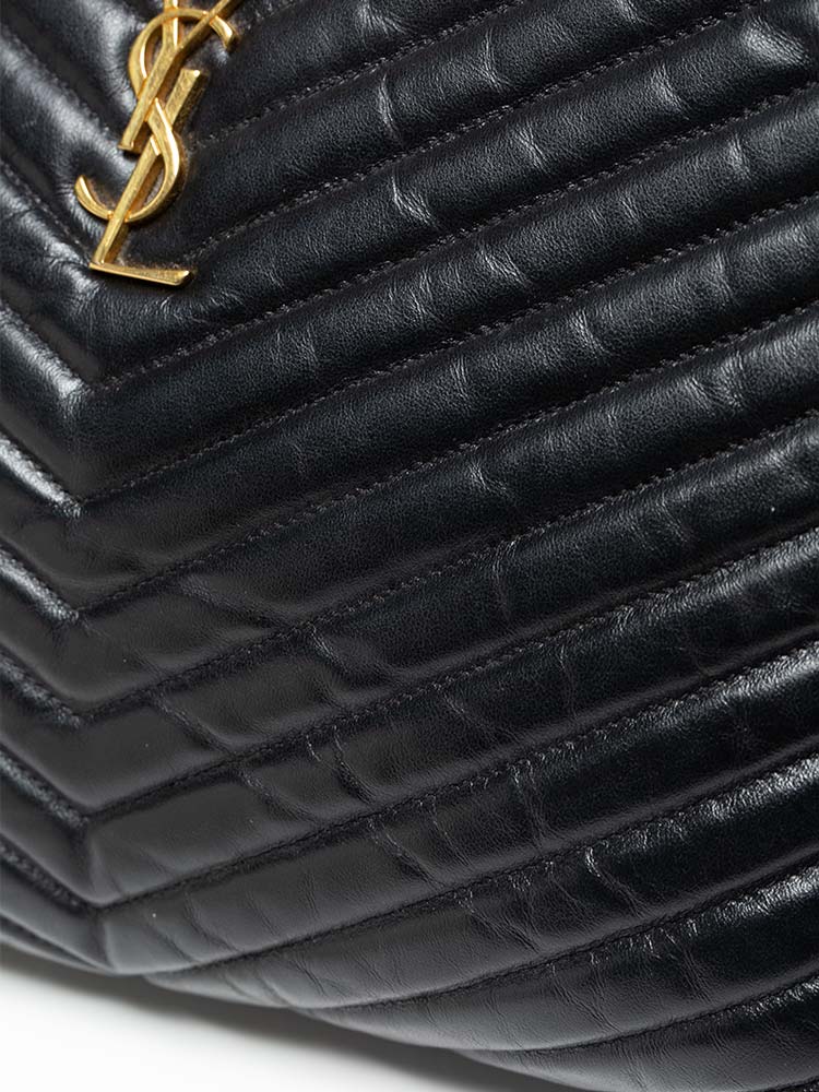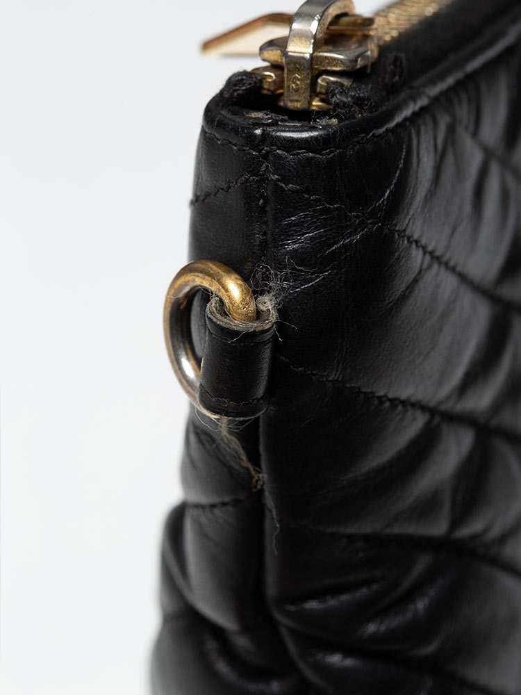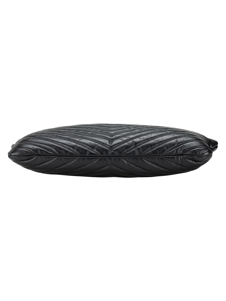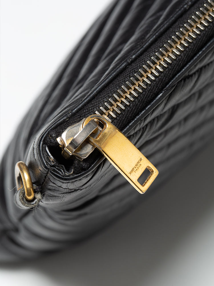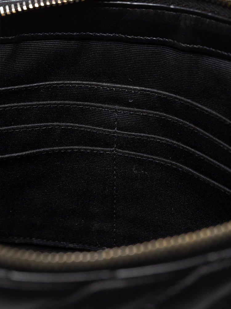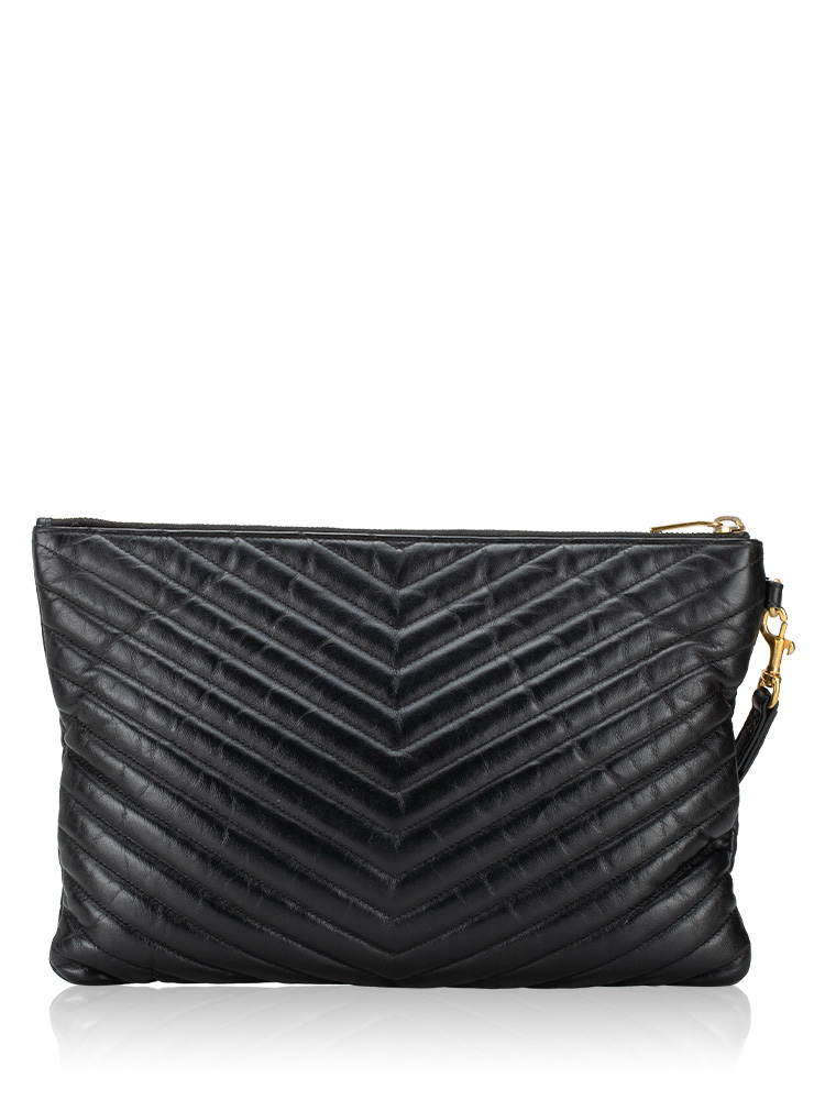 Crafted of chevron-quilted calfskin leather. The pouch features a gold YSL logo on the front and the top zipper opens to a black fabric interior with card slots and patch pockets.