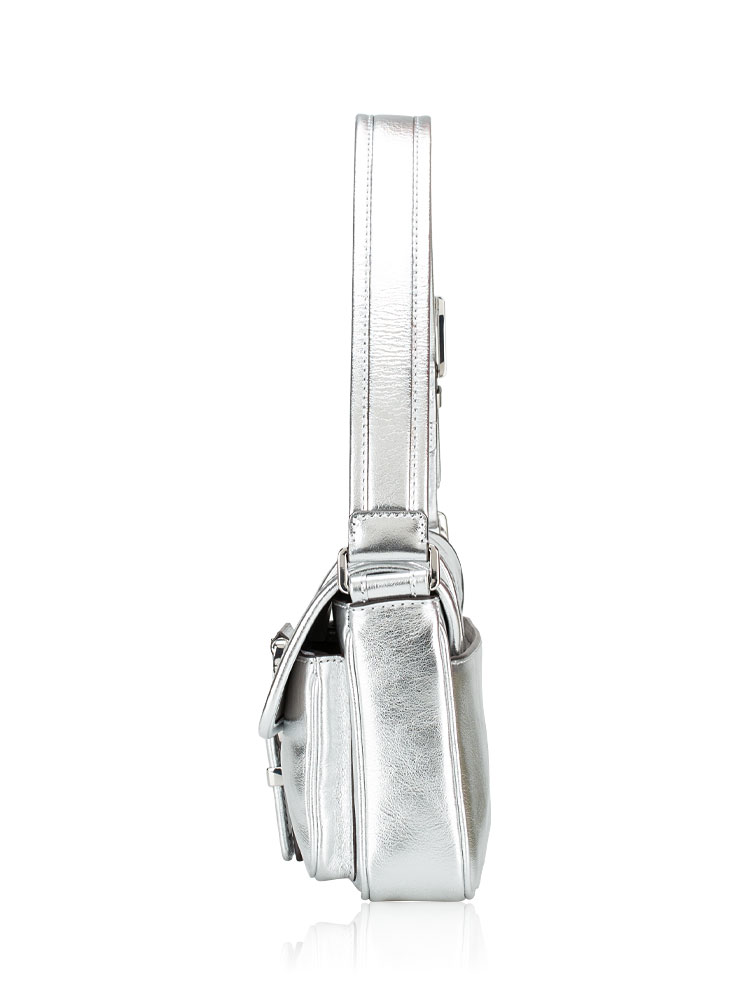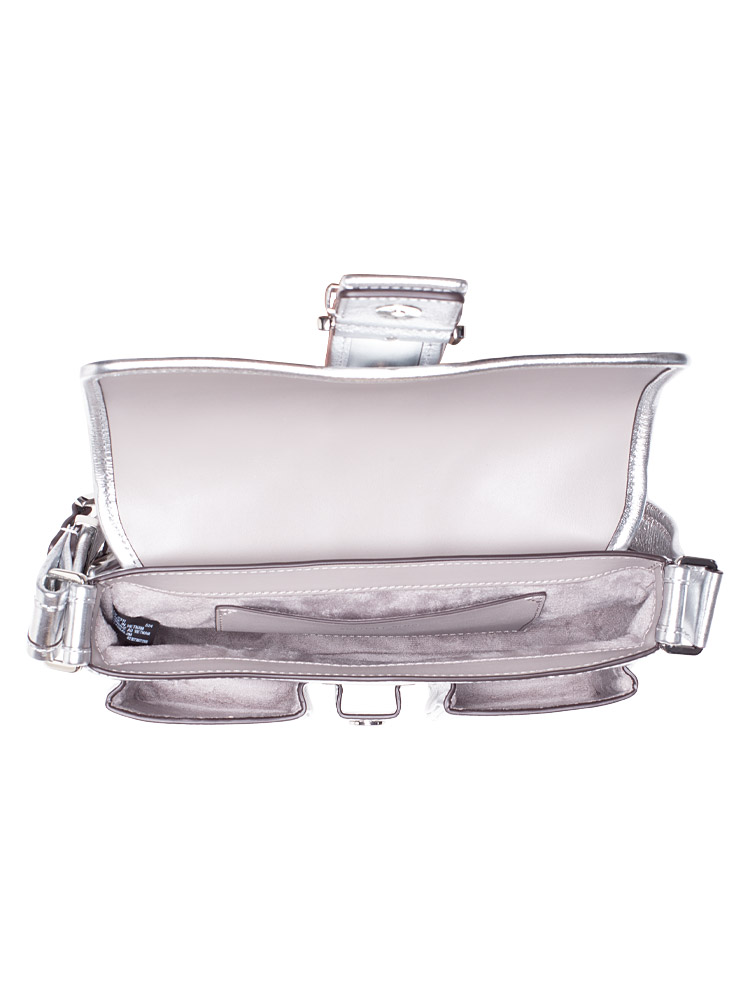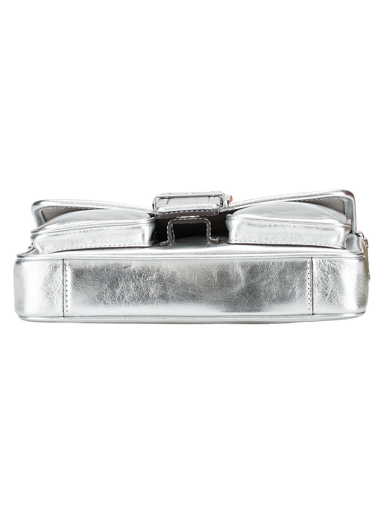 Made of metallic leather. The bag feature a magnetic closure that opens to suede lining with interior one slip pocket and exterior two slip pockets at front, one slip pocket at back.