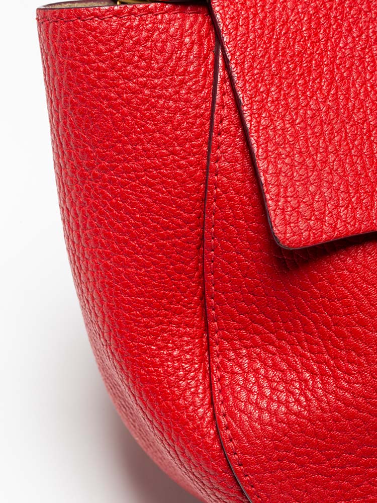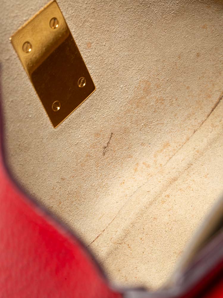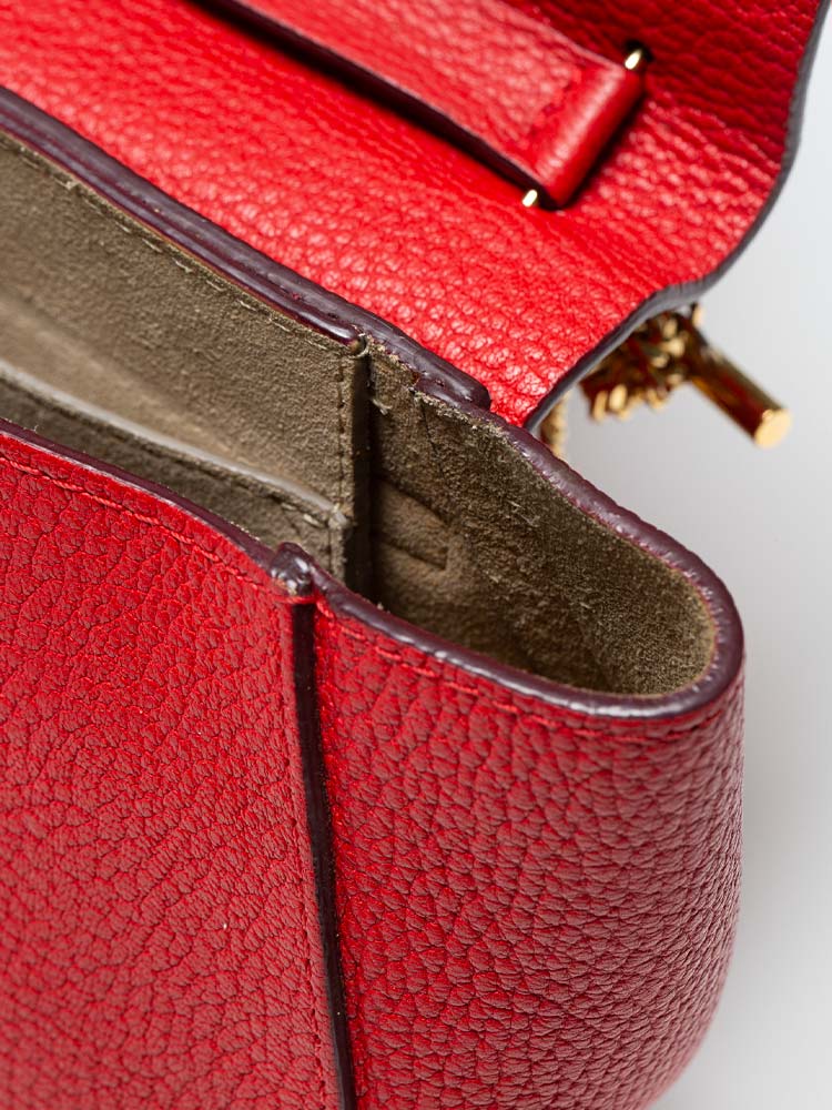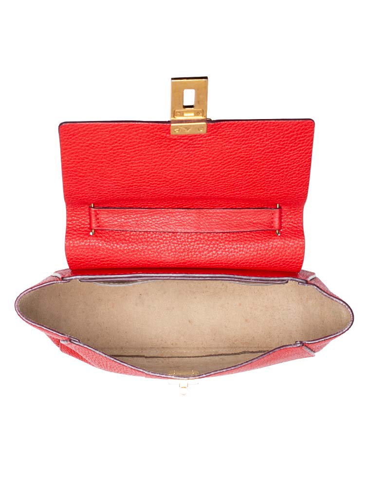 This bag is crafted of grained lambskin leather. The bag features a gold chain link cross-body shoulder strap with gold arched link loops, and a facing flap with a bar piston closure. The flap opens to a suede interior with a patch pocket.