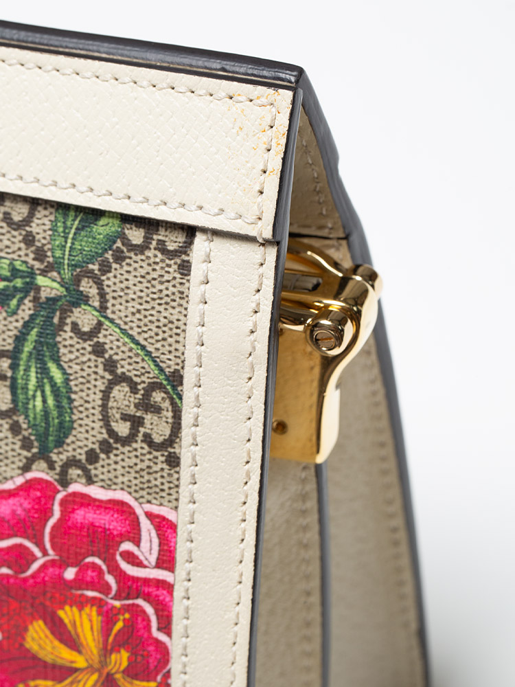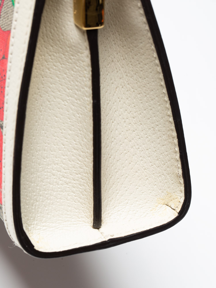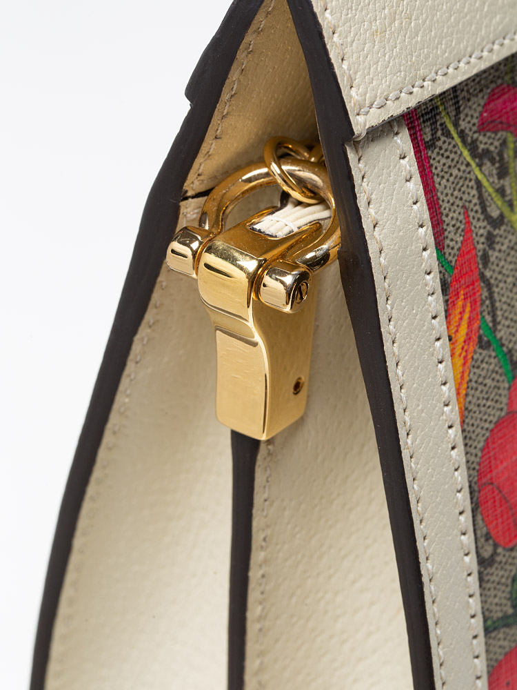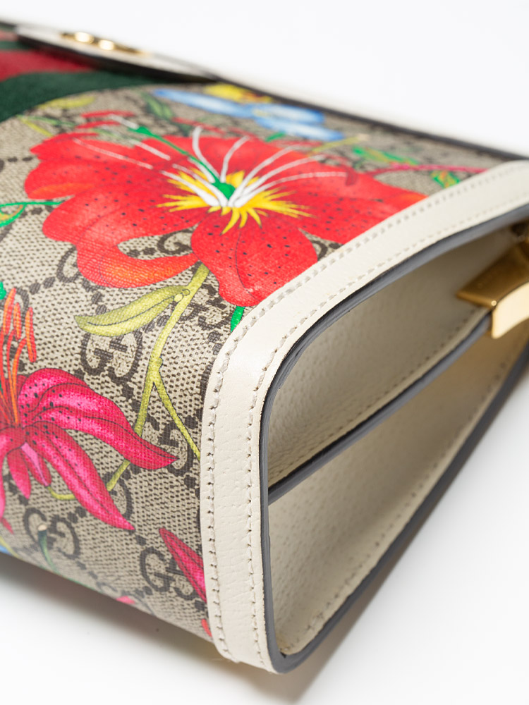 Crafted of Gucci monogram floral coated canvas with a web stripe detail and white leather trim. The bag features a polished gold chain strap, GG logo, and hardware. The magnetic top opens to a partitioned beige interior with a patch pocket.