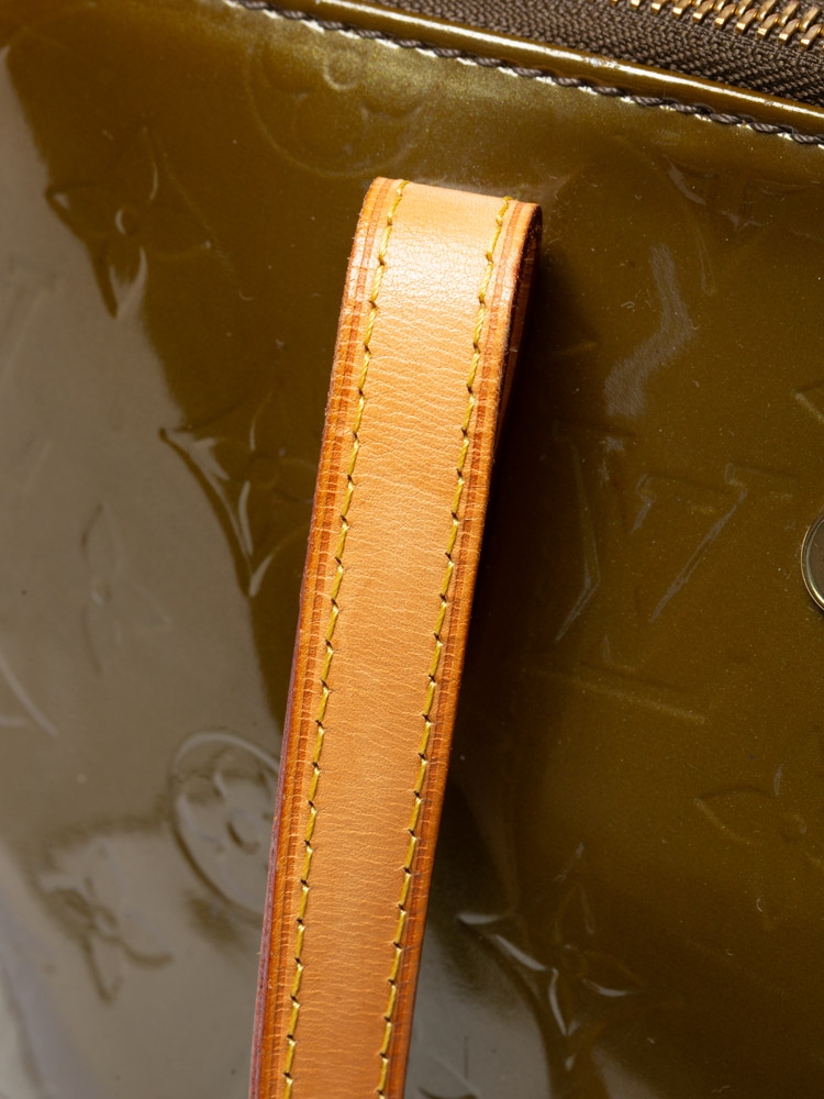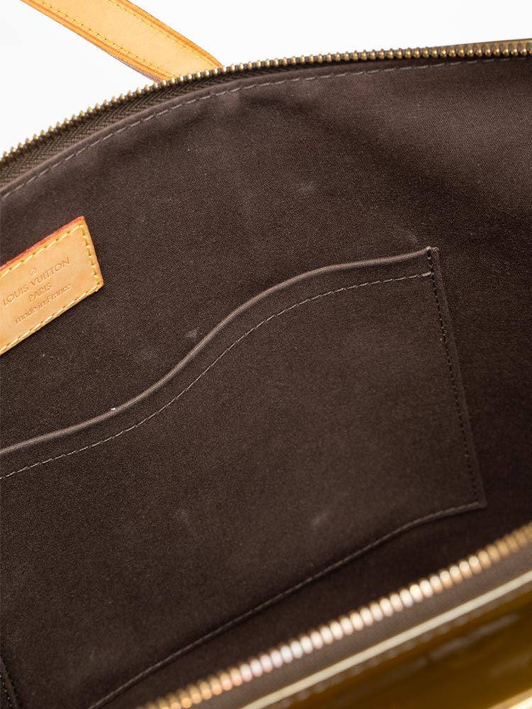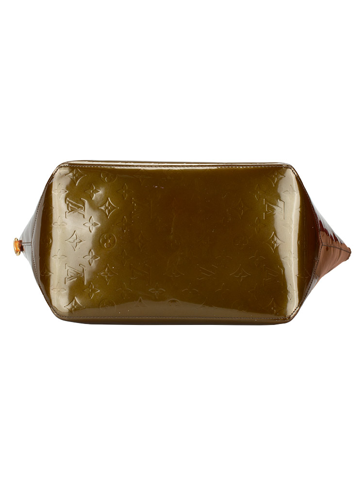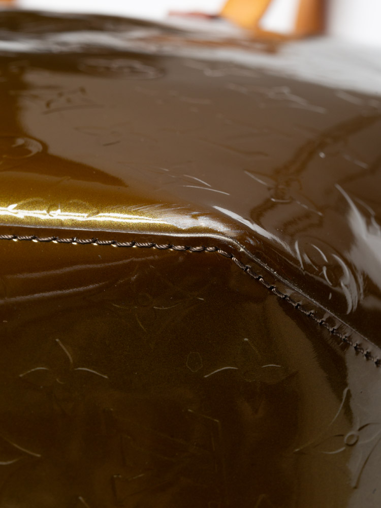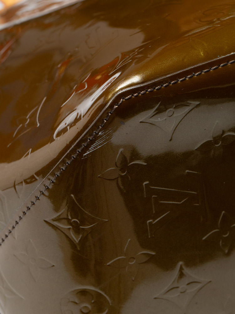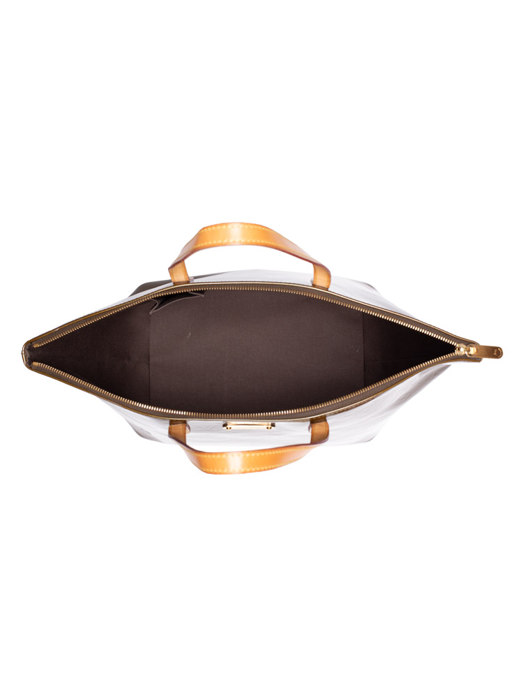 This bag is crafted of Louis Vuitton Monogram vernis patent leather. It features vachetta leather trim, and double top handles. The top zipper opens to a fabric interior with slip pockets.