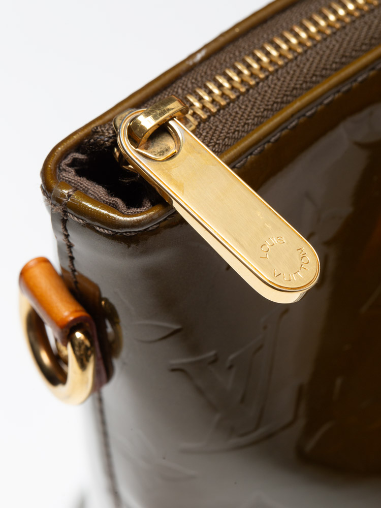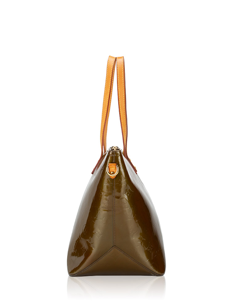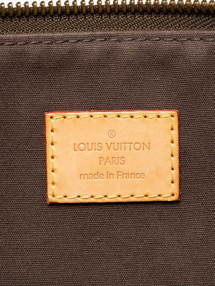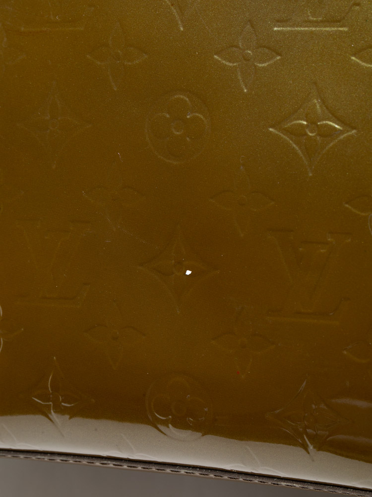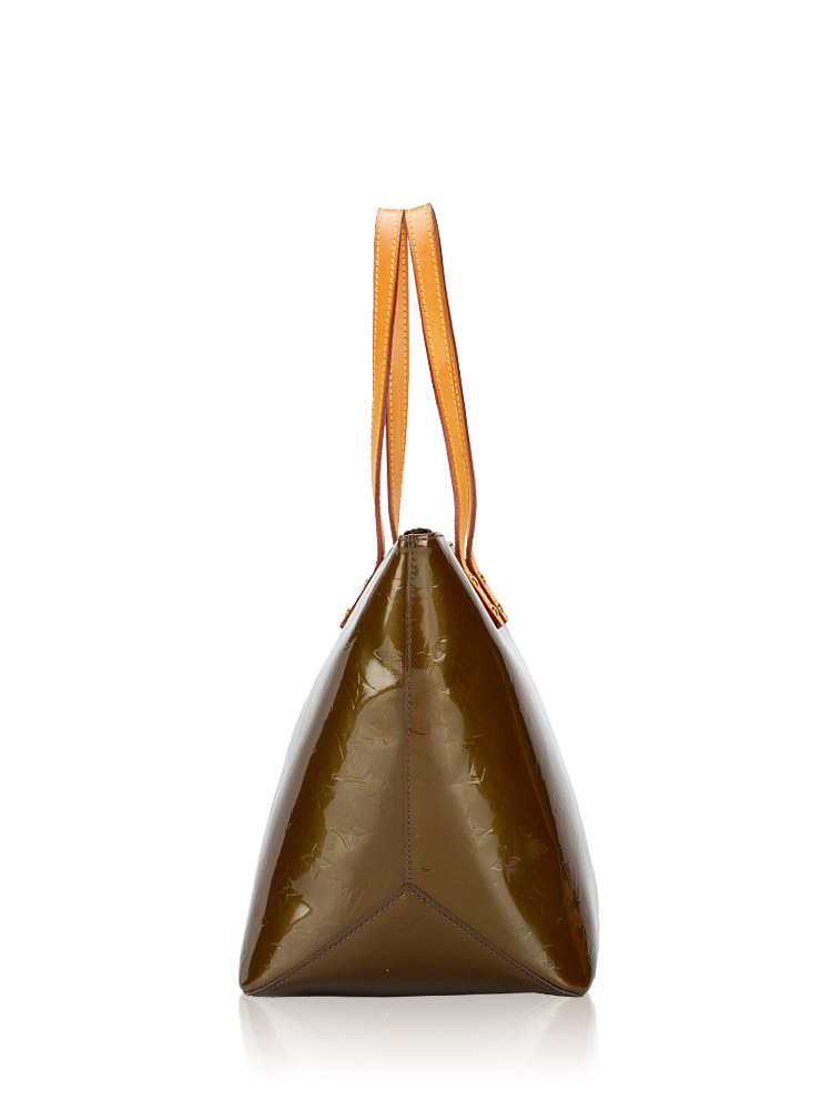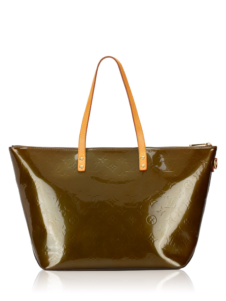 This bag is crafted of Louis Vuitton Monogram vernis patent leather. It features vachetta leather trim, and double top handles. The top zipper opens to a fabric interior with slip pockets.