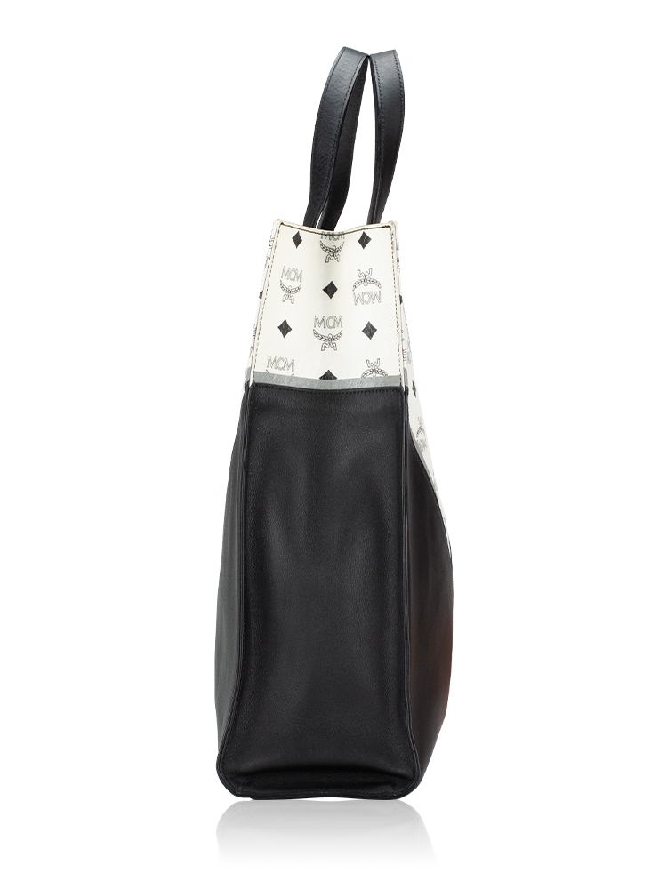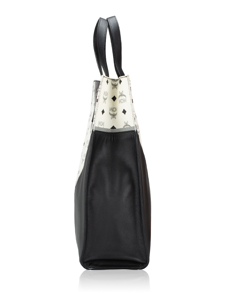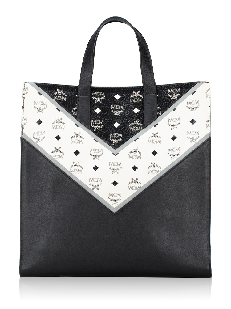 Crafted of calfskin material with MCM visetos chevron details. It features double top handle, and an optional shoulder strap. The tote opens to a spacious fabric lining with slip and zipper pockets.