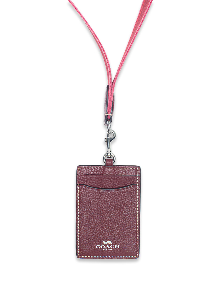 Made of pebble leather. It equipped with 2 card slots and an ID window with Coach embossed logo lettering.