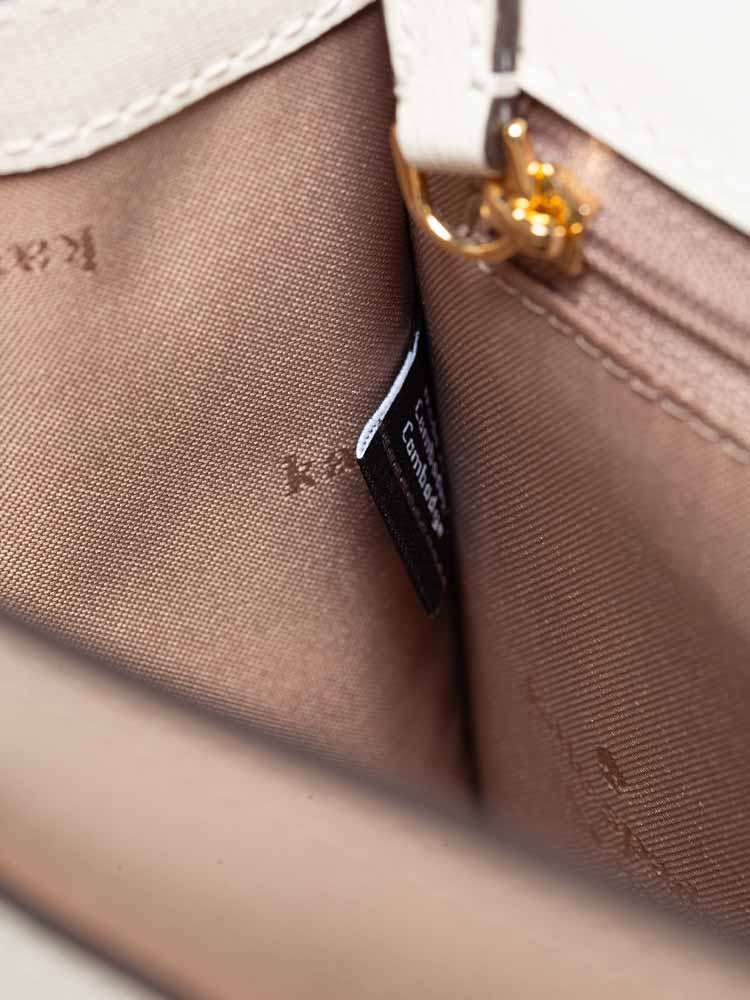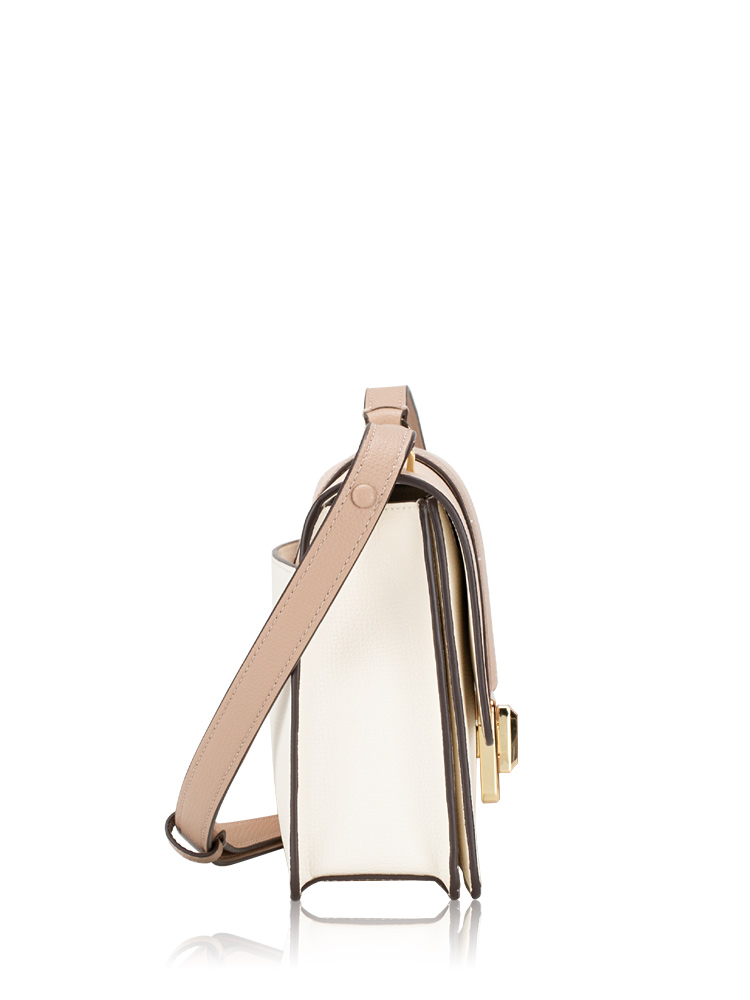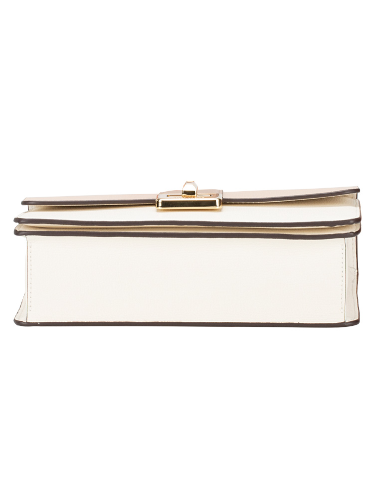 Made of refined grain leather. The bag features a turn lock closure that opens to two way script logo lining with interior one zip pocket, one slip pocket at front and exterior one slip pocket at back.