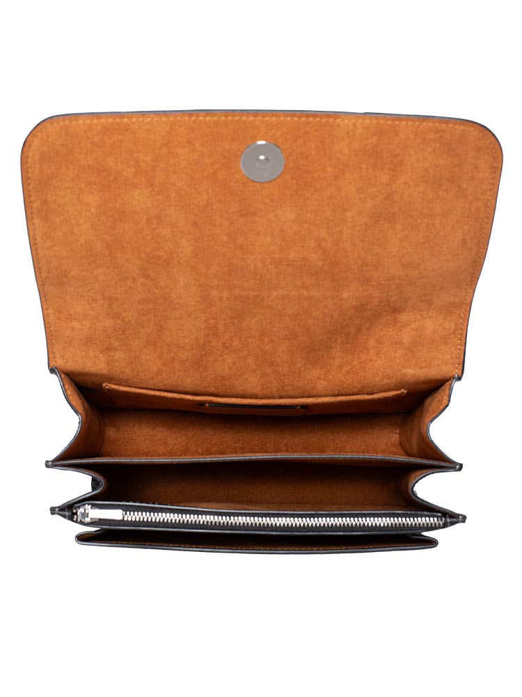 Made of pebble leather. The bag features a magnetic closure that opens to suede lining with interior two slip pockets, one zip pocket and exterior one slip pocket at back.