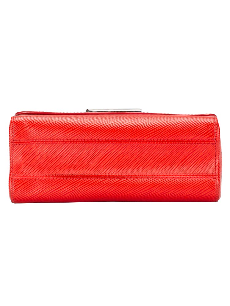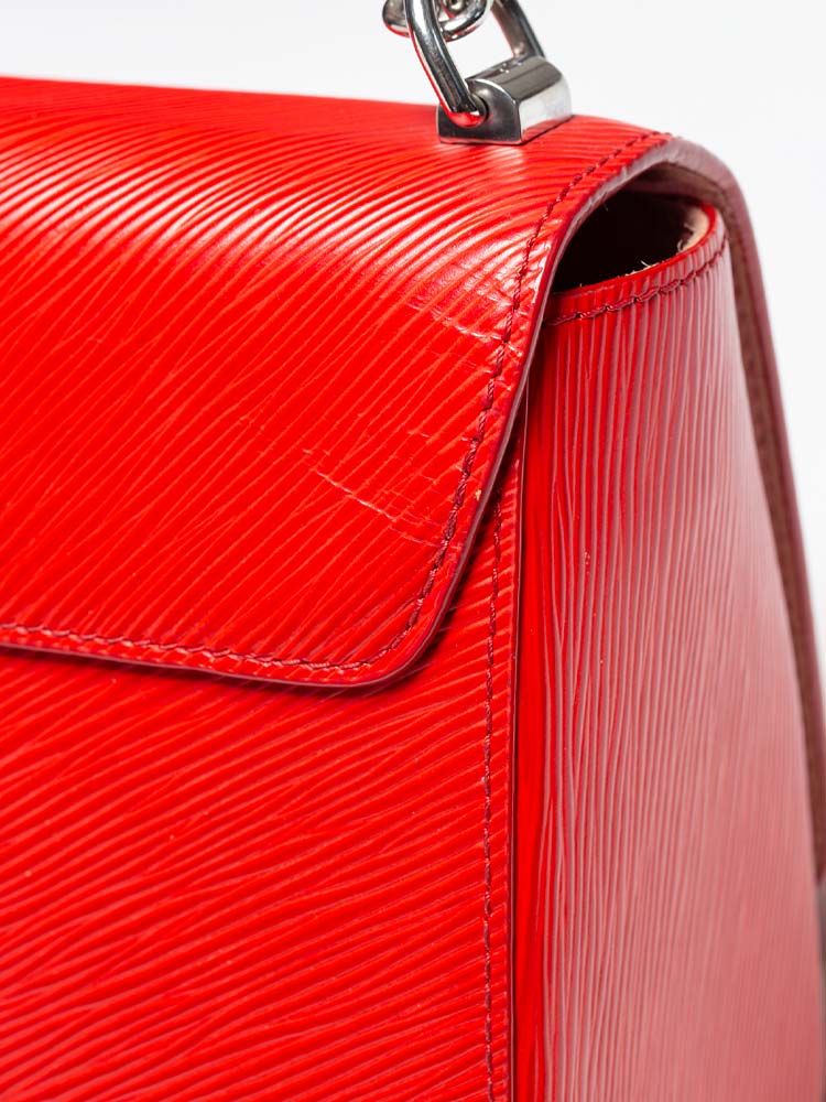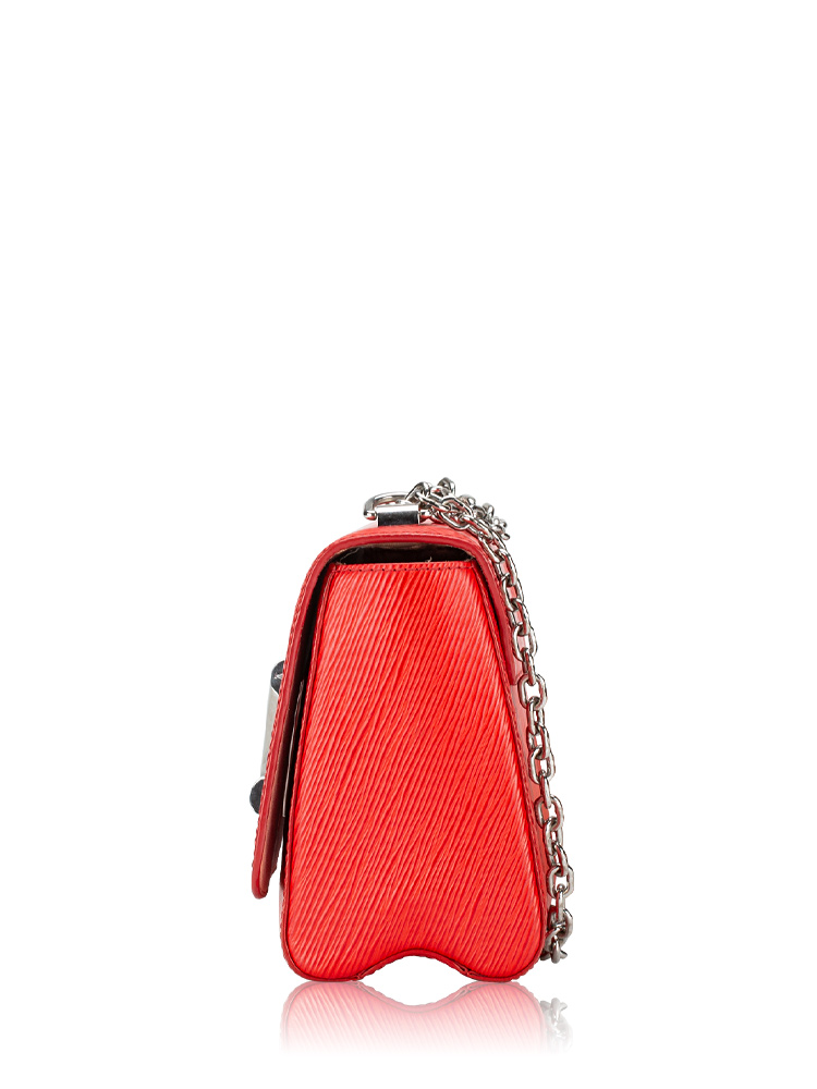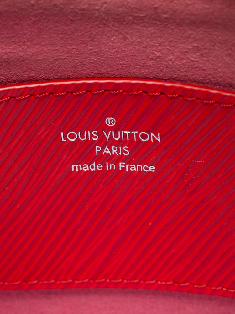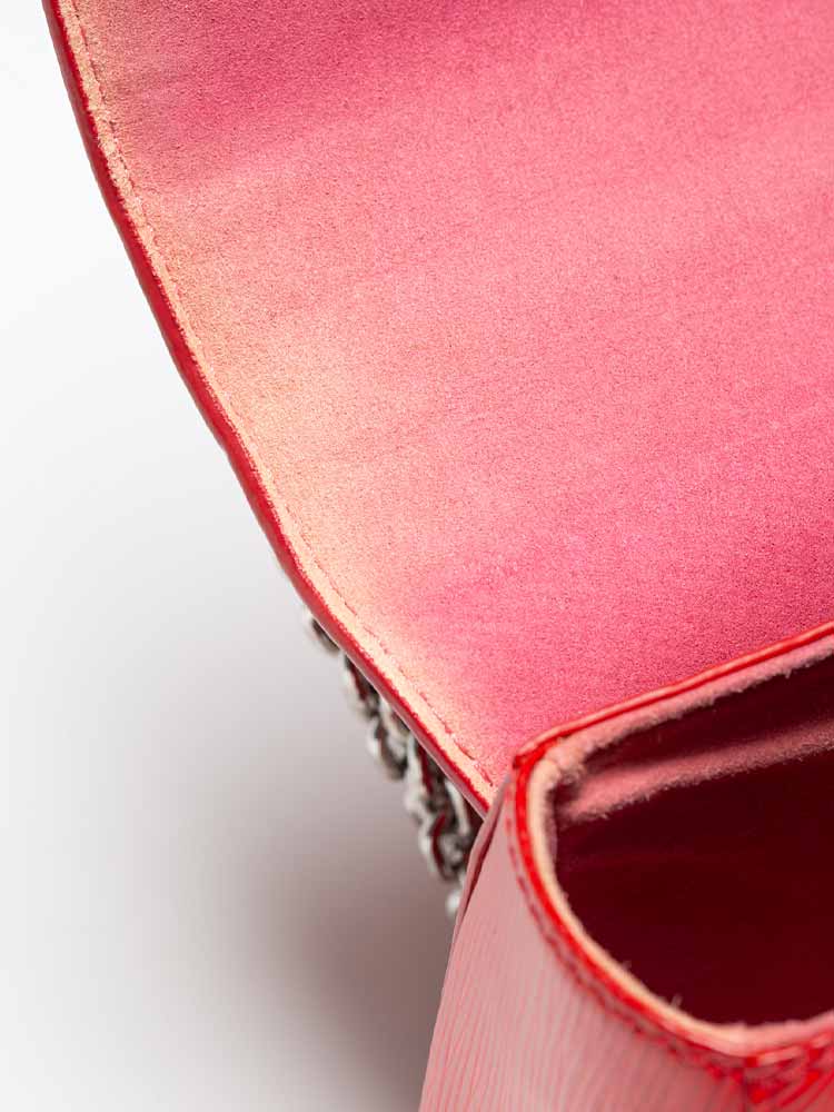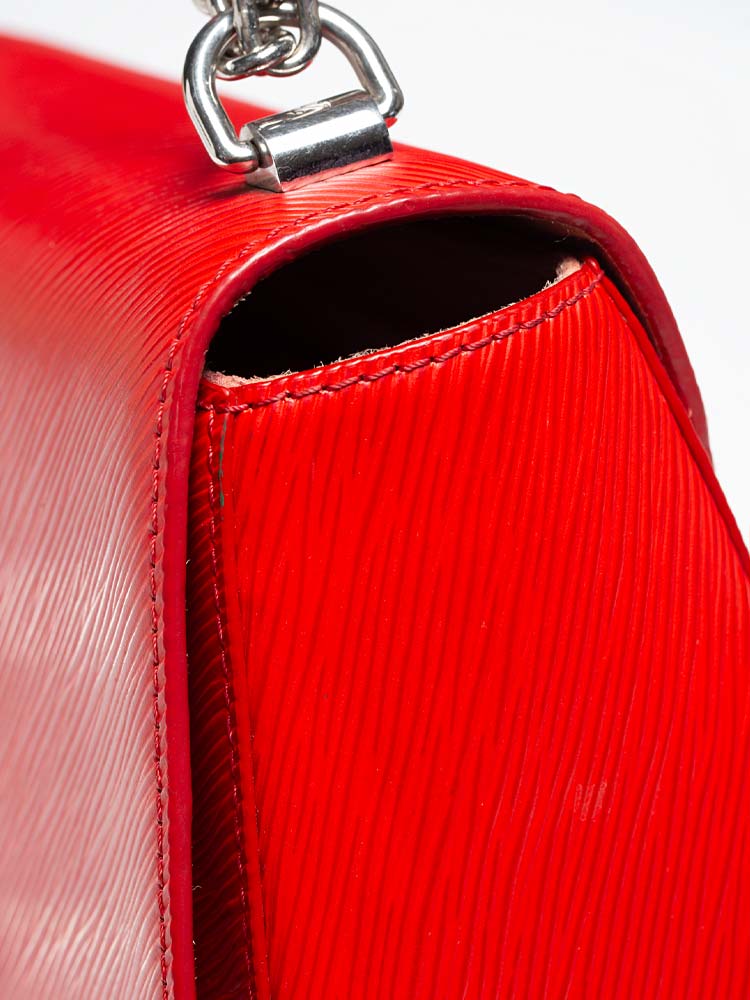 Crafted of textured epi leather. Features a silver chain shoulder strap with a leather shoulder pad linked to the top of the bag and a silver LV twist lock on the facing flap. This opens to a microfiber interior with a small patch pocket.