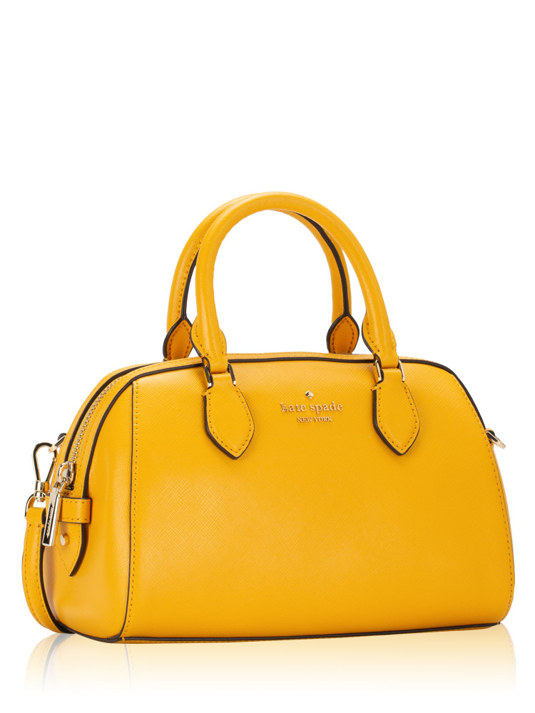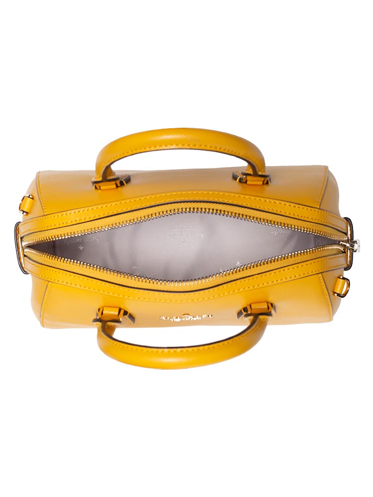 Made of saffiano leather. The bag features a zip closure that opens to polyester lining with one slip pocket, double handles drop 10 cm.