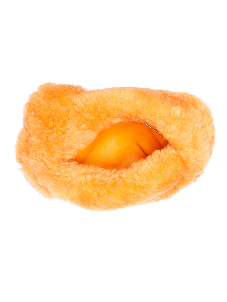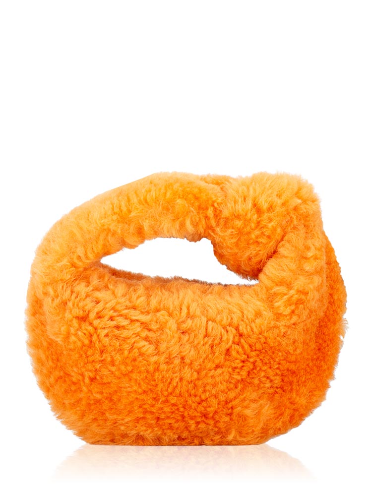 Crafted of soft shearling. The shoulder bag features a matching handle and a gold top zipper that opens to a leather interior.