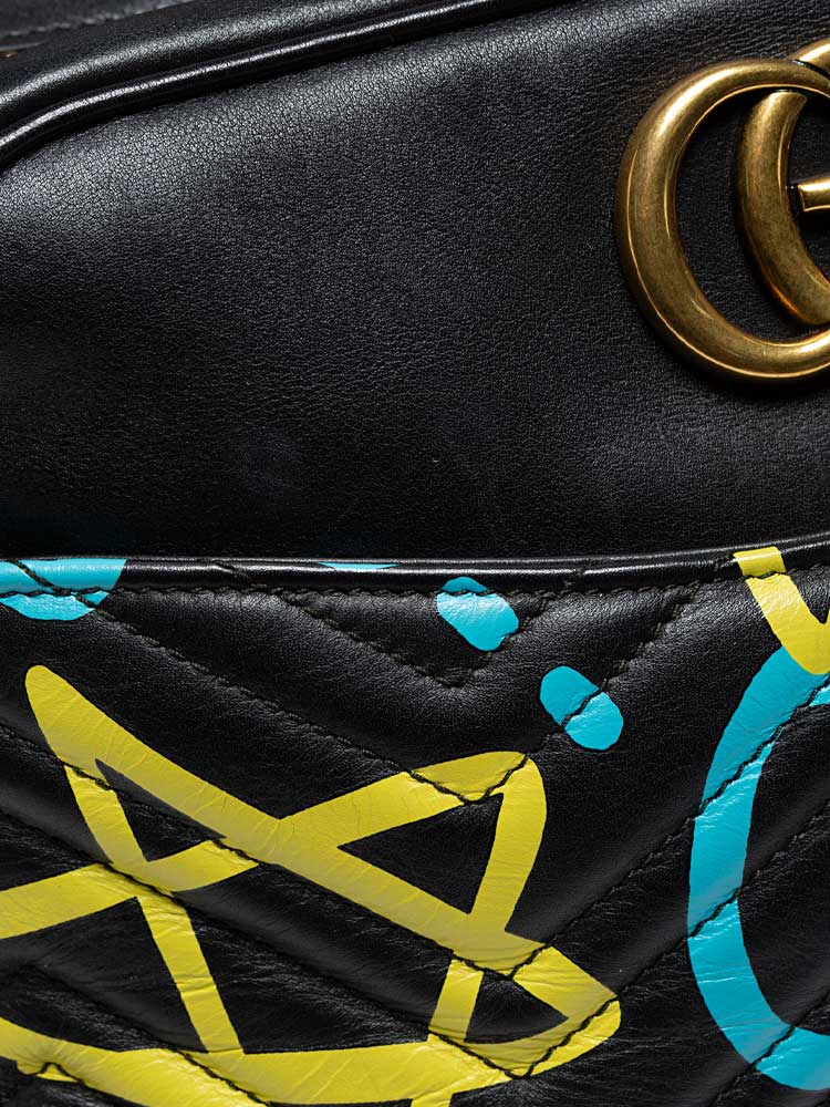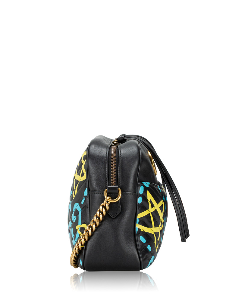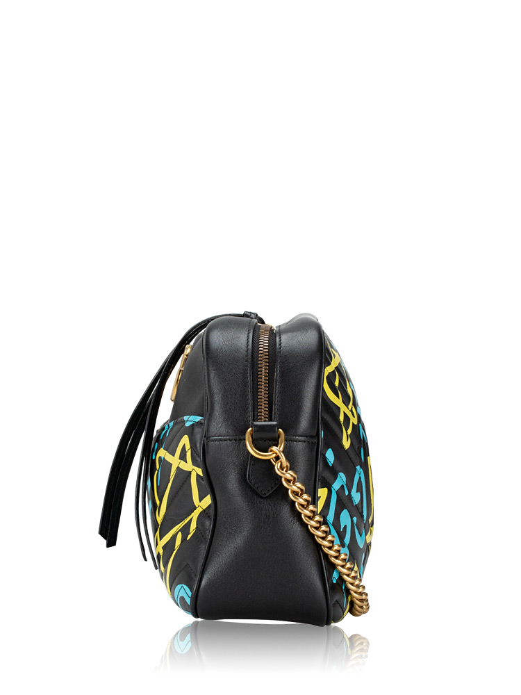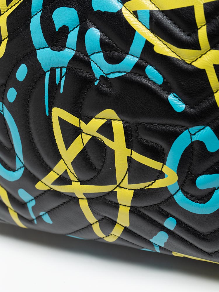 Crafted of calfskin leather with a stitched chevron pattern. It features customized art by street artist Trouble Andrew, an aged gold chain shoulder strap with a leather handle, long leather tassel zipper pulls, and an aged gold interlocking GG logo.