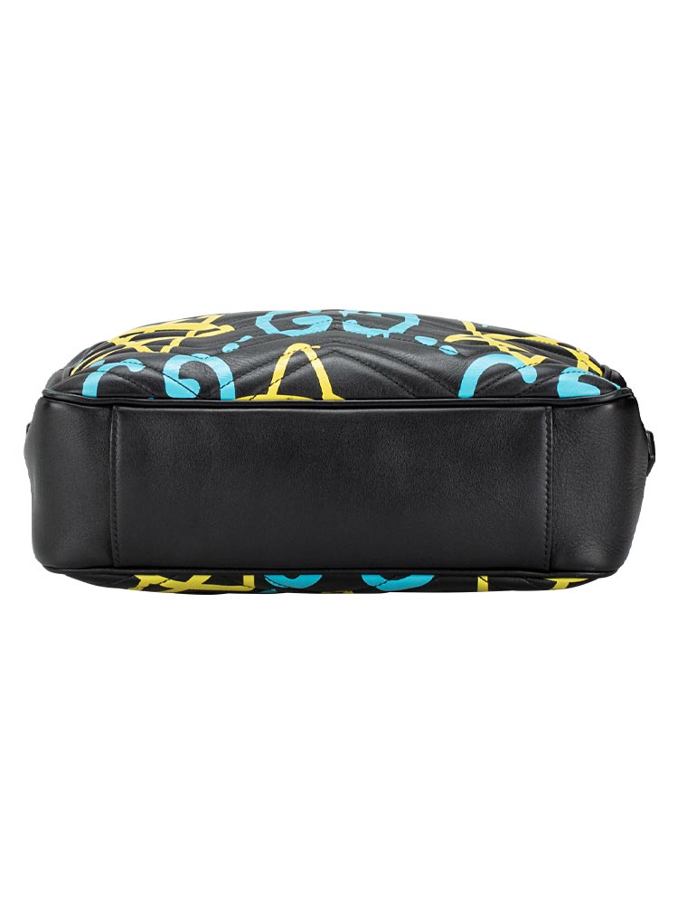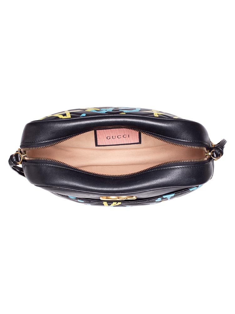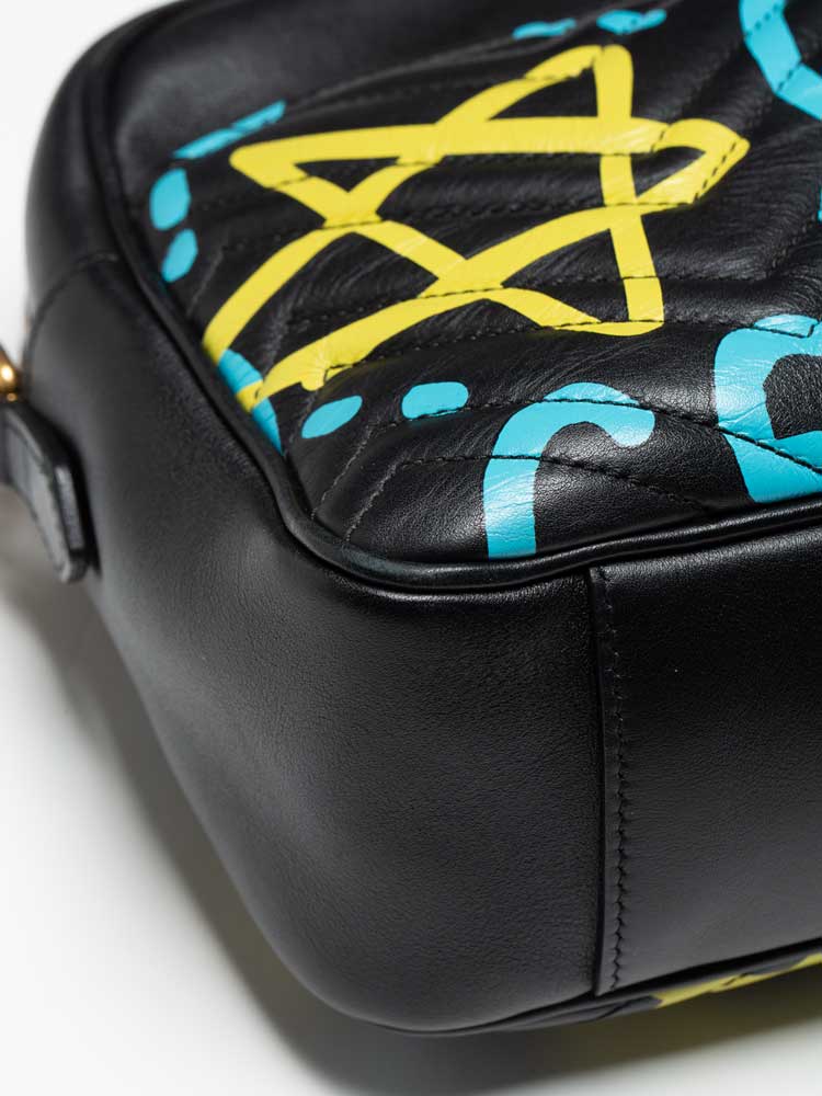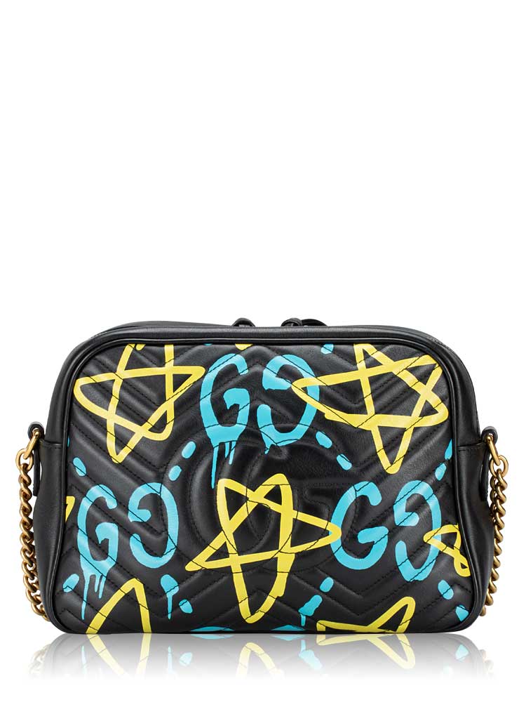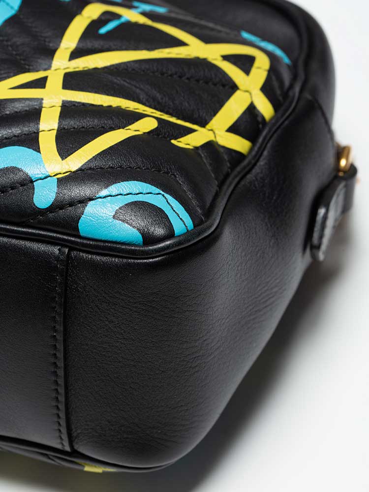 Crafted of calfskin leather with a stitched chevron pattern. It features customized art by street artist Trouble Andrew, an aged gold chain shoulder strap with a leather handle, long leather tassel zipper pulls, and an aged gold interlocking GG logo.
