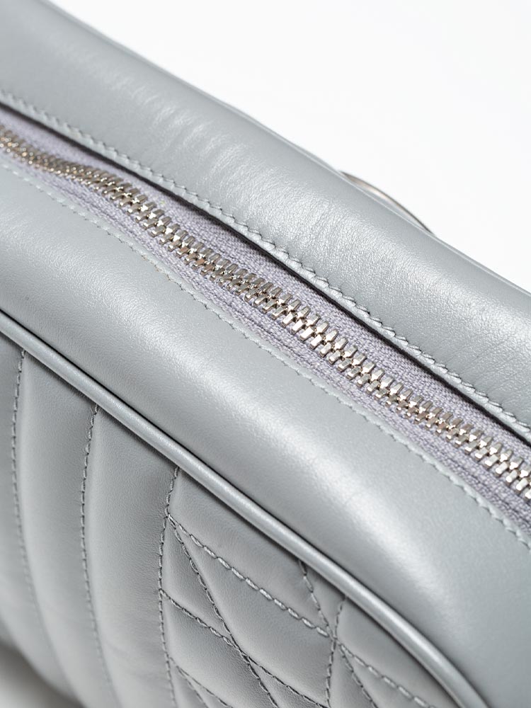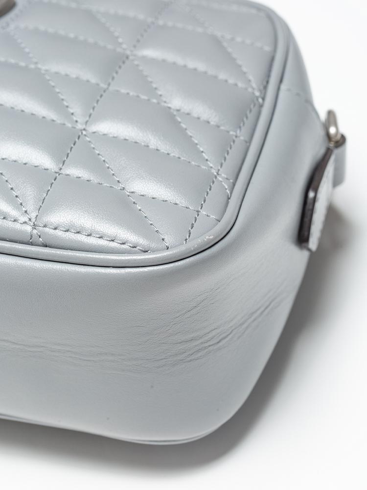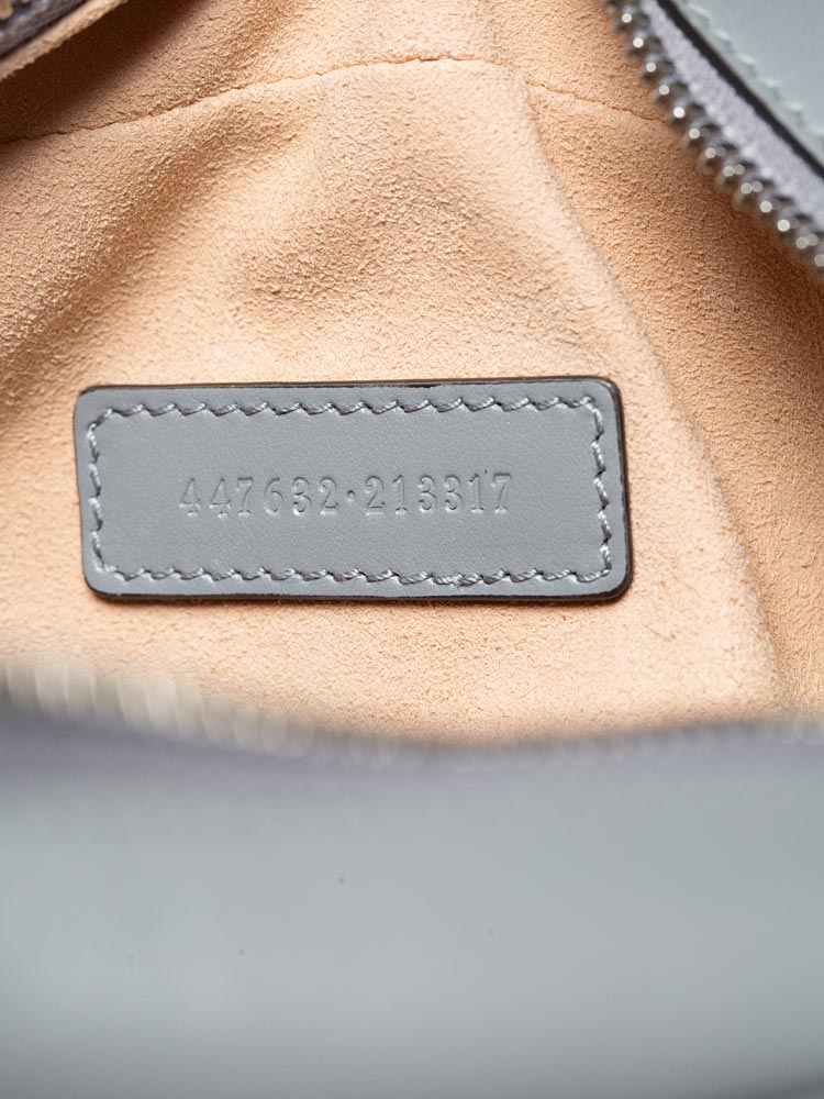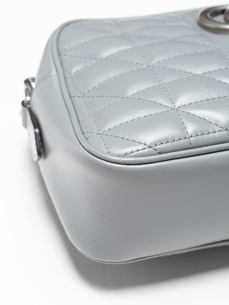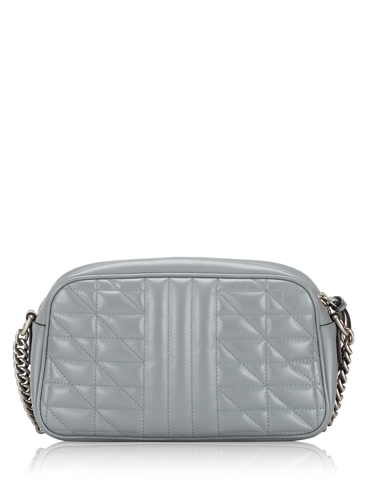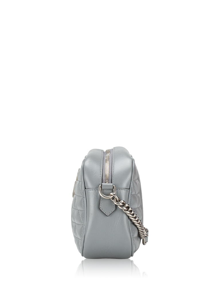 Crafted of calfskin leather with geometric quilting. It features a leather shoulder strap with aged silver links and an aged silver GG logo on the front. The top zipper opens to a microfiber interior with a flat pocket.