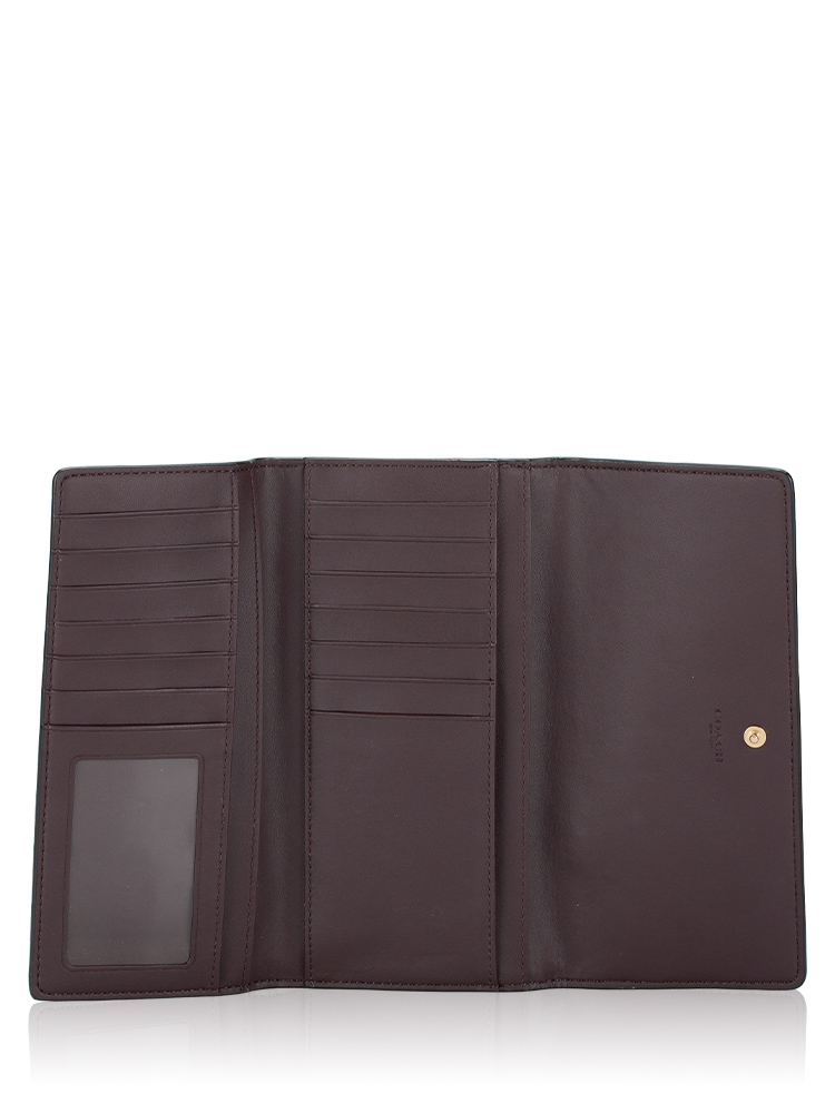 Signature coated canvas and smooth leather. 13 credit card slots. Full-length bill compartments. ID window. Inside zip coin pocket. Snap closure. 6 3/4 (L) x 3 1/2 (H) inc.