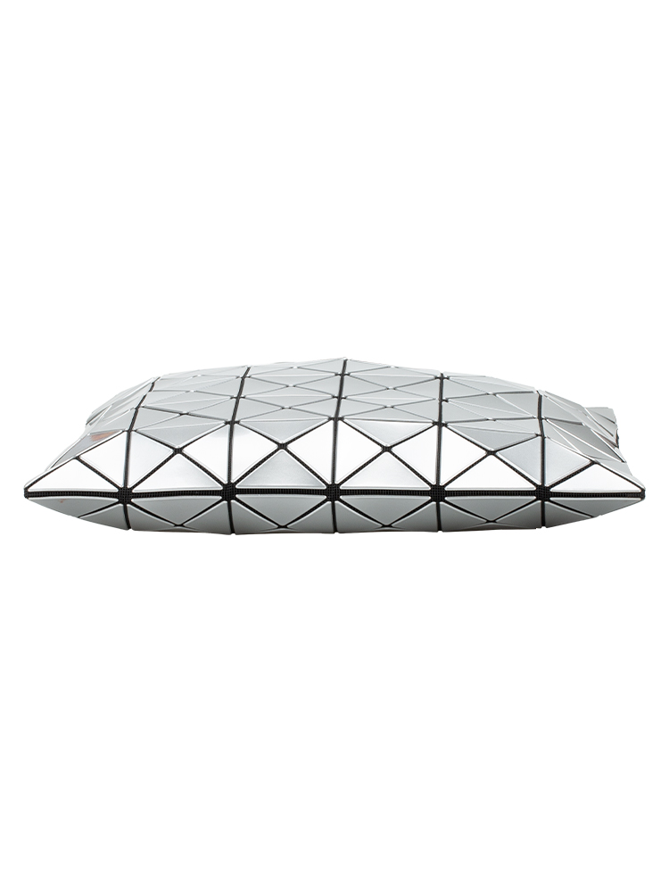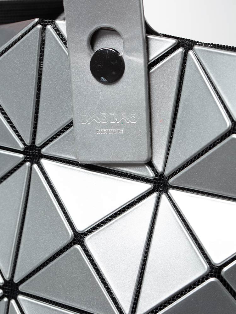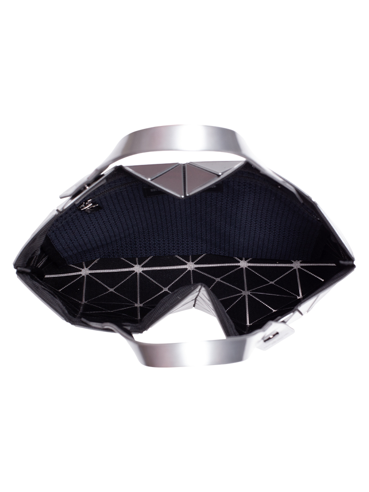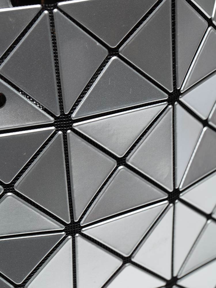 This bag is crafted of polyester on upper material. The bag features with geometric panelled design, and an adjustable top handle. The bag opens to fabric lining with zipper pocket.