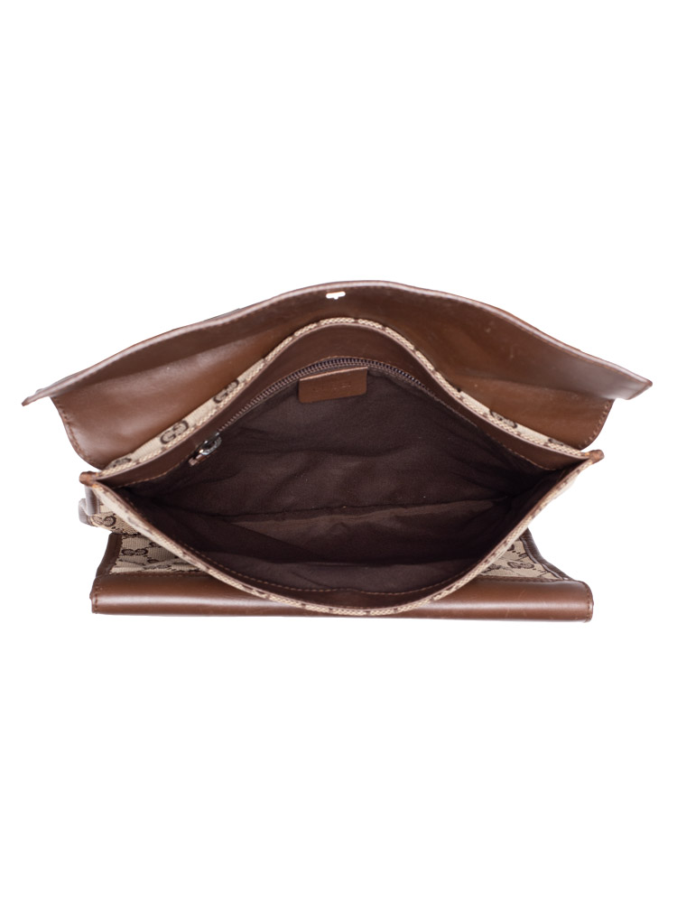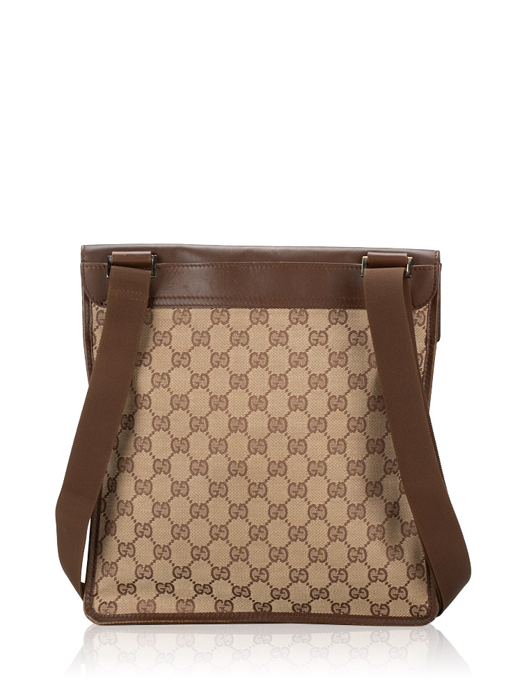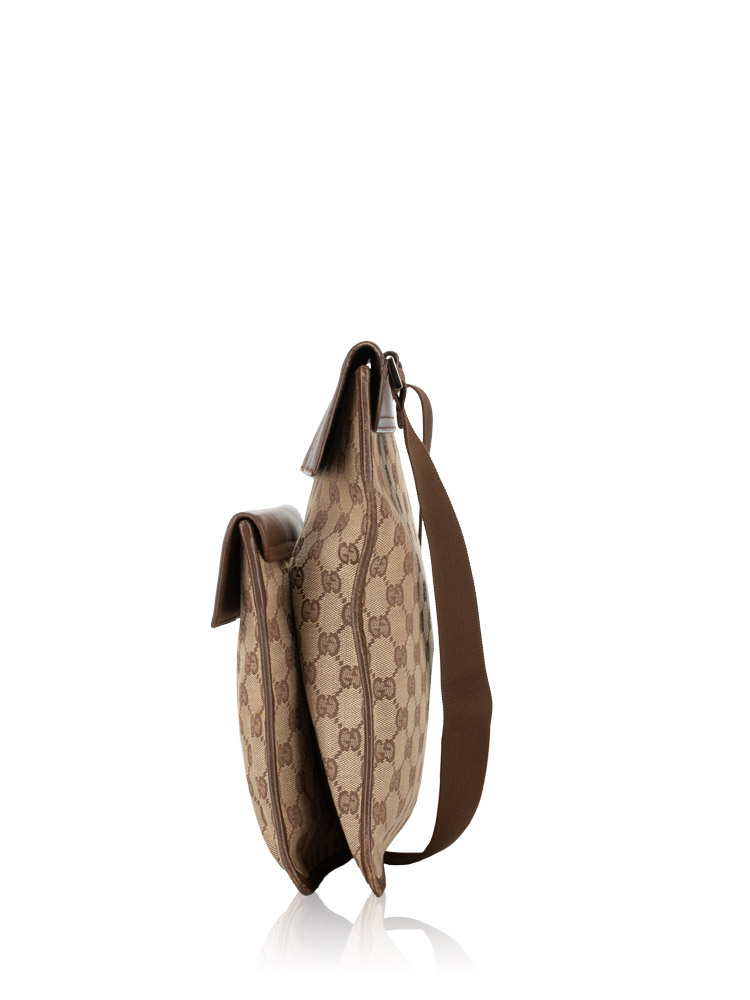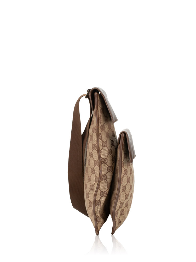 Crafted of Gucci GG monogram canvas. It features a nylon cross body shoulder strap with silver hardware and a top crest and trim of leather. The top is open to a fabric interior with a zipper pocket.