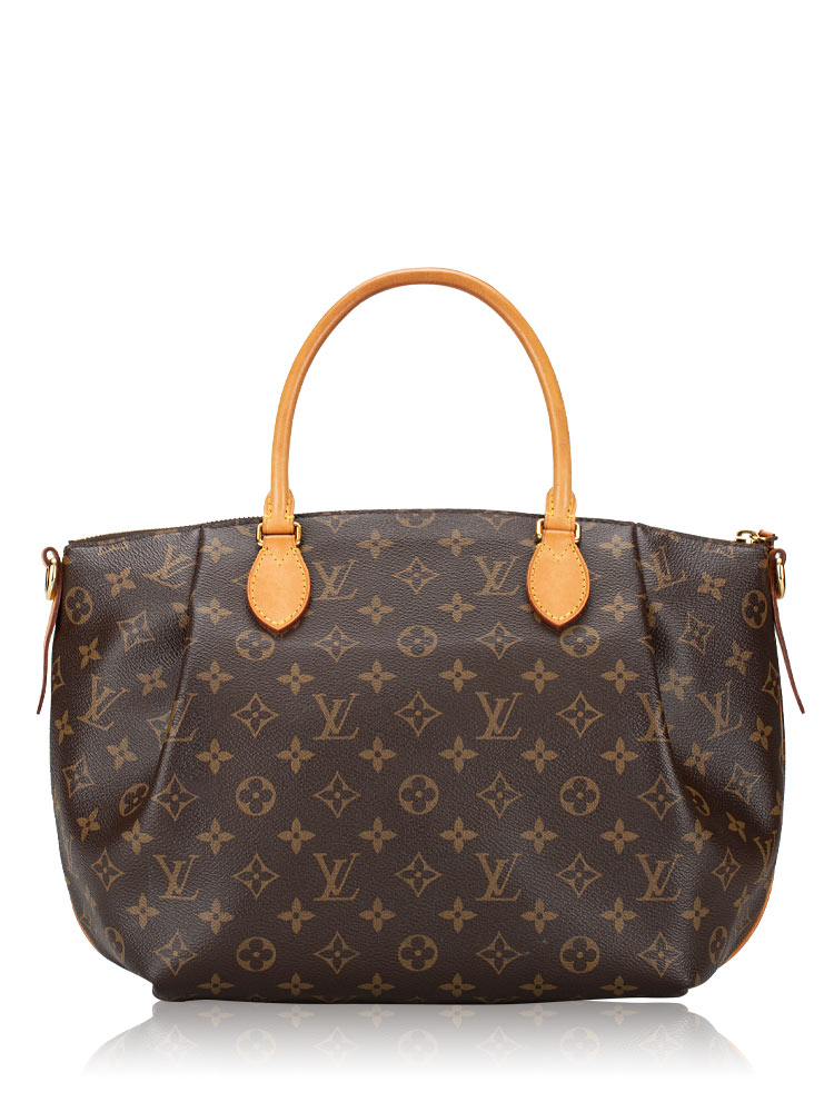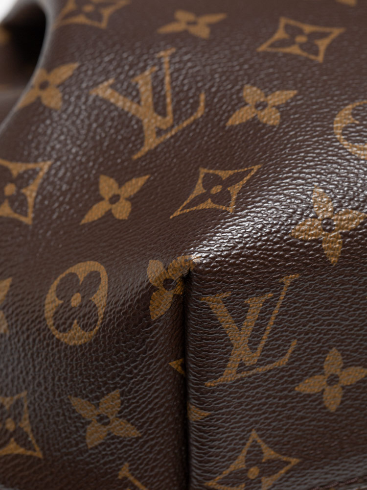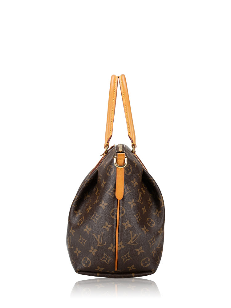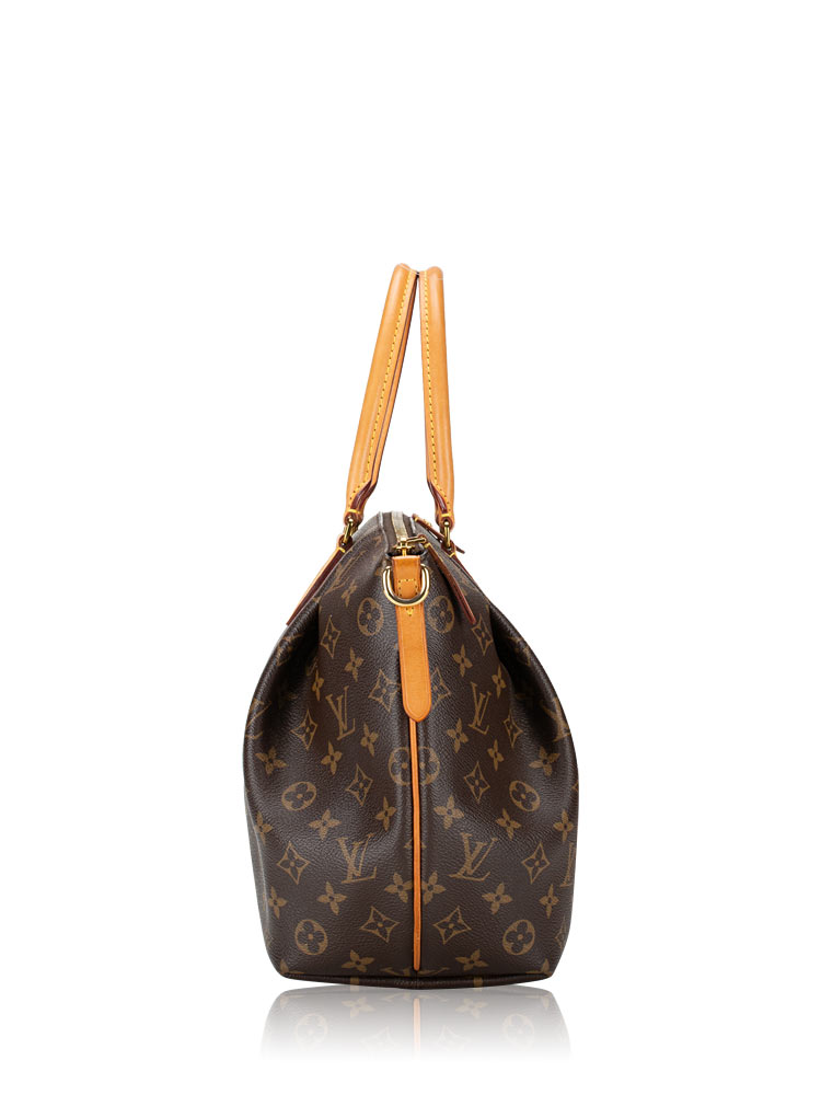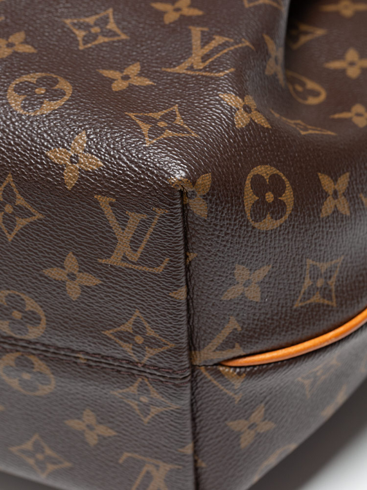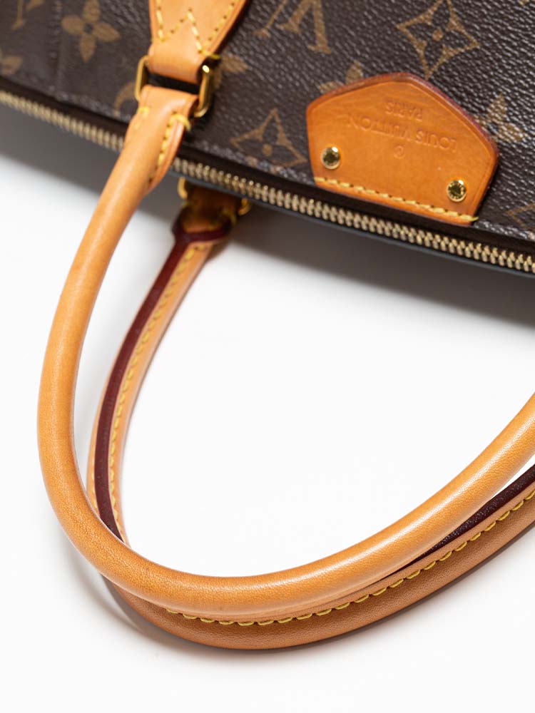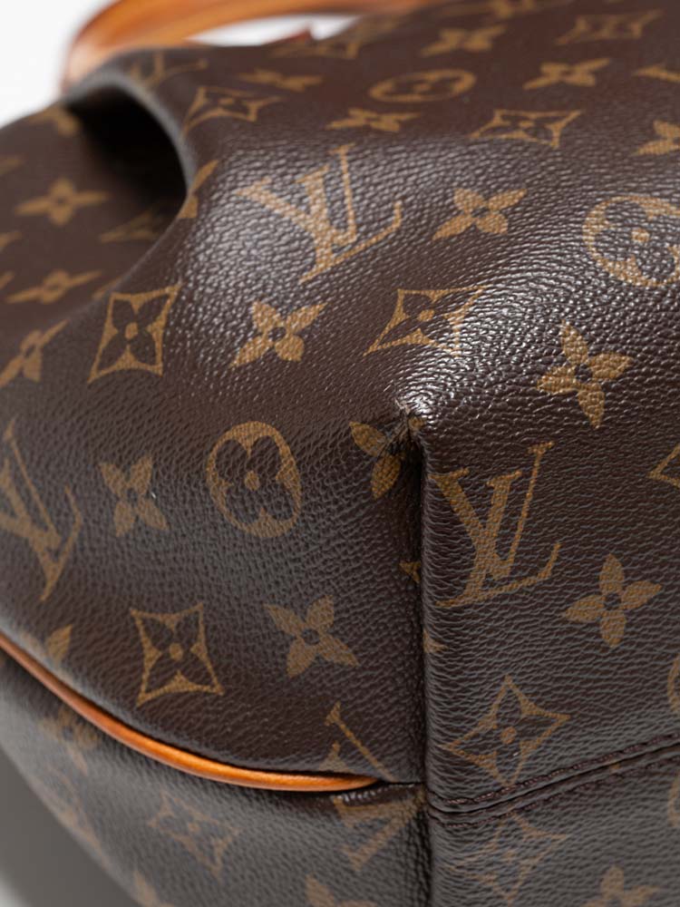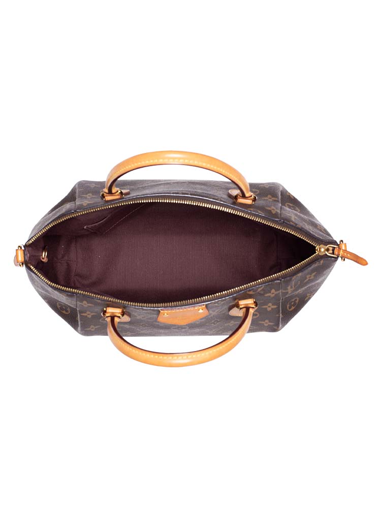 Crafted of Louis Vuitton monogram on toile coated canvas. Features with vachetta rolled leather top handles, an optional adjustable shoulder strap, and polished brass hardware. The top opens to a fabric interior with patch pockets.