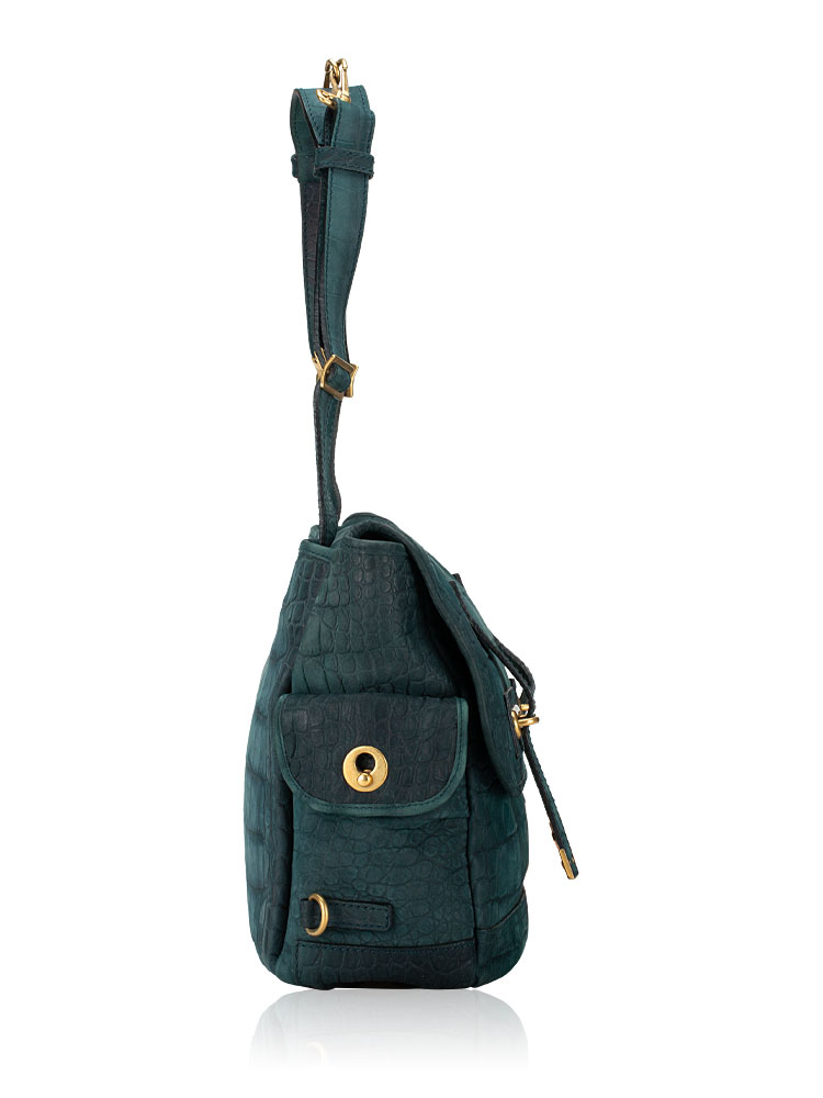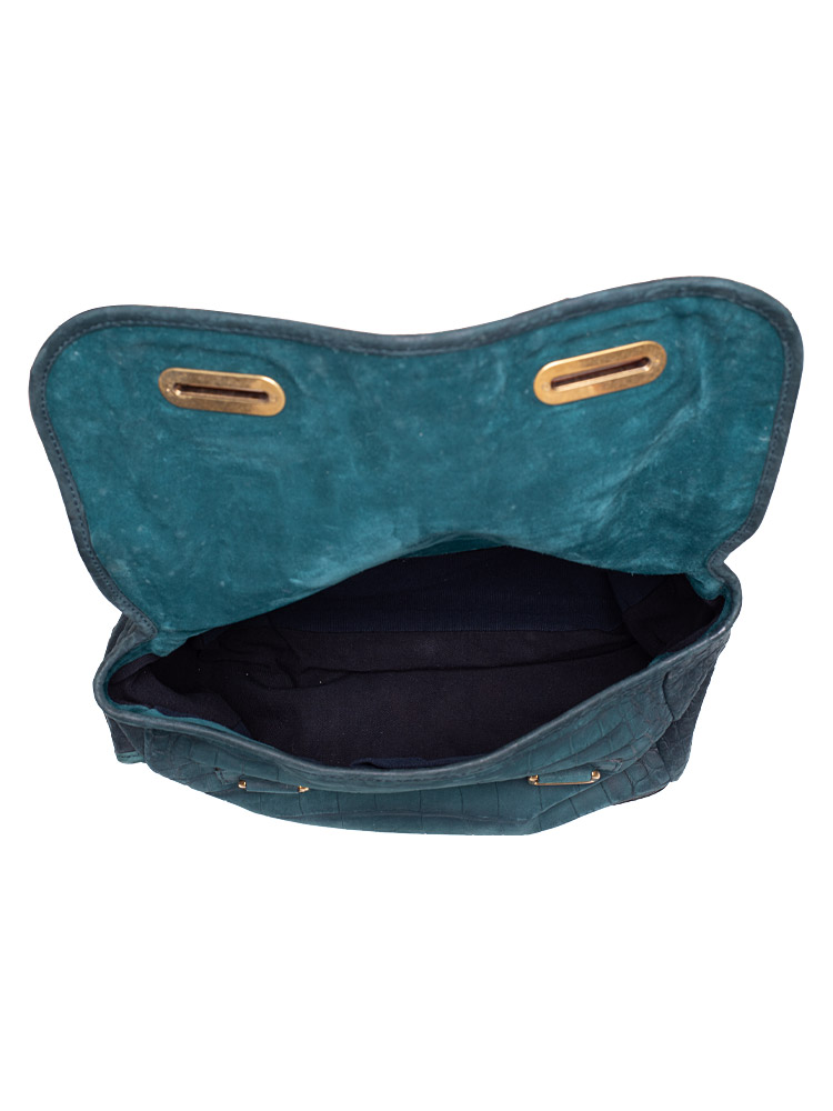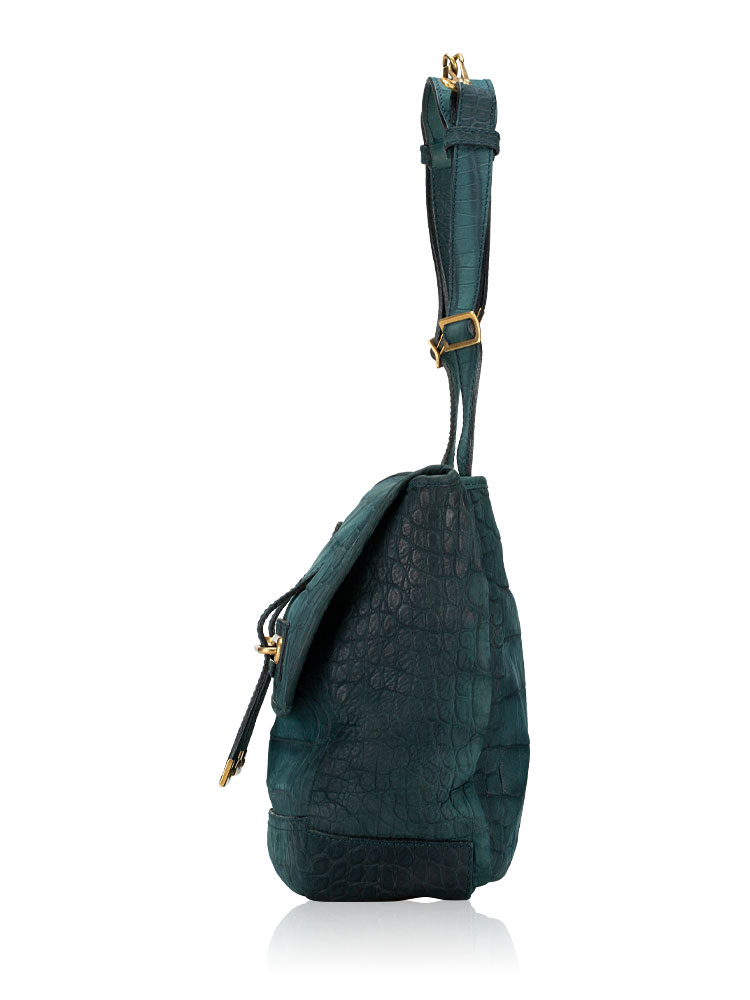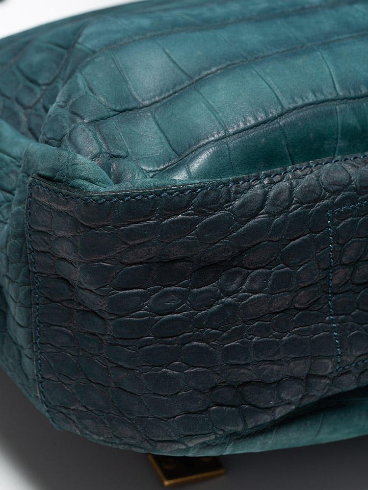 Crafted of nubuck material with the crocodile embossed. The bag features a lengthy adjustable leather shoulder strap and a frontal flap that is sealed with two leather straps and gold buckles. It opens the front flap to a fabric interior.