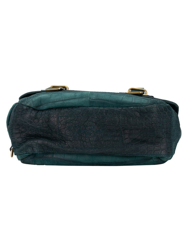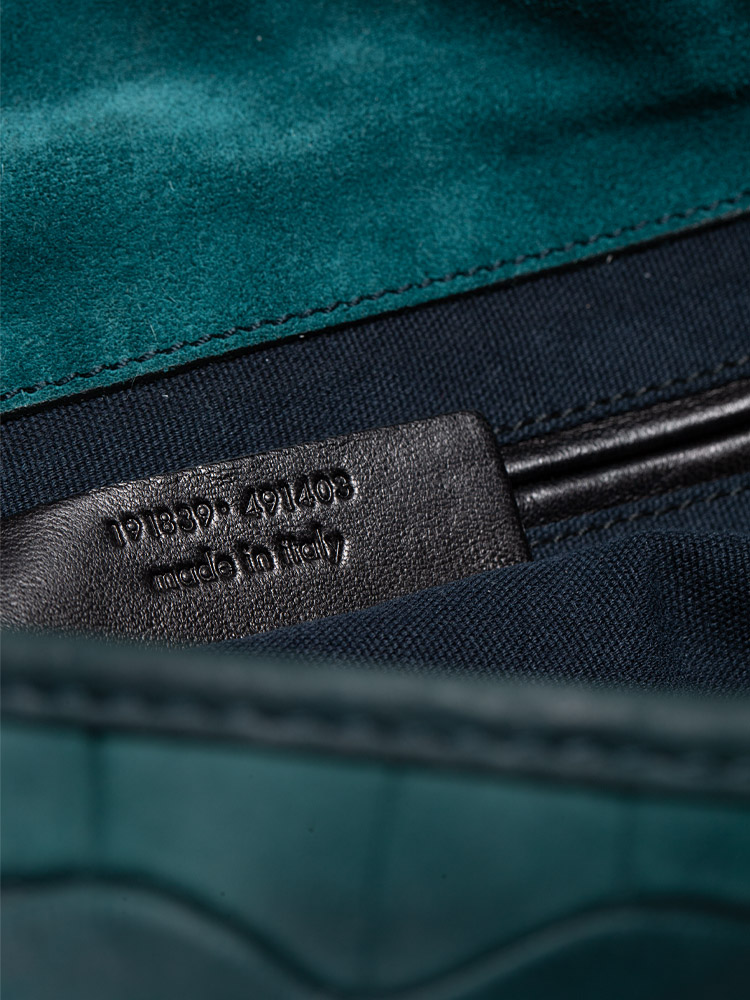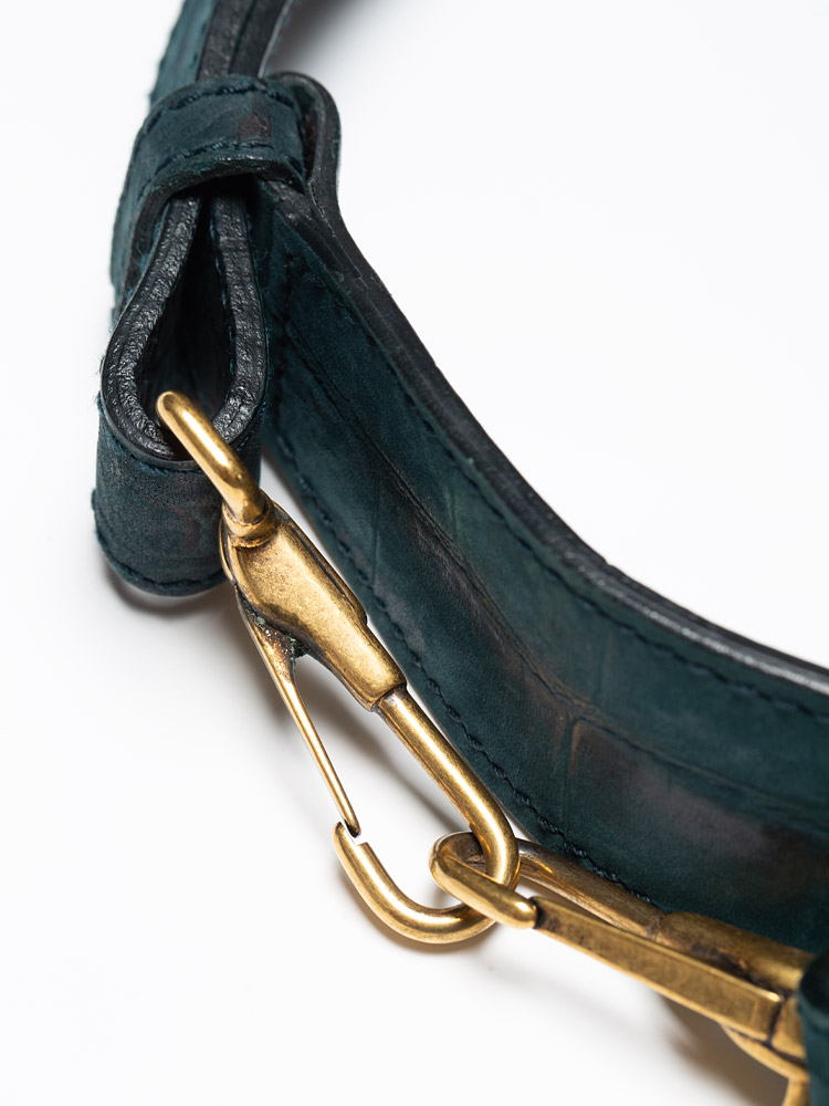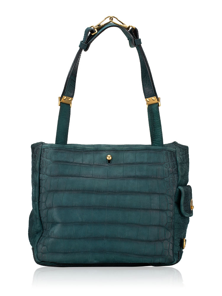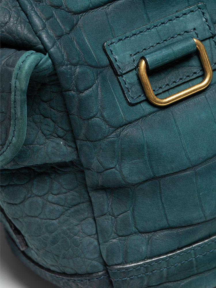 Crafted of nubuck material with the crocodile embossed. The bag features a lengthy adjustable leather shoulder strap and a frontal flap that is sealed with two leather straps and gold buckles. It opens the front flap to a fabric interior.