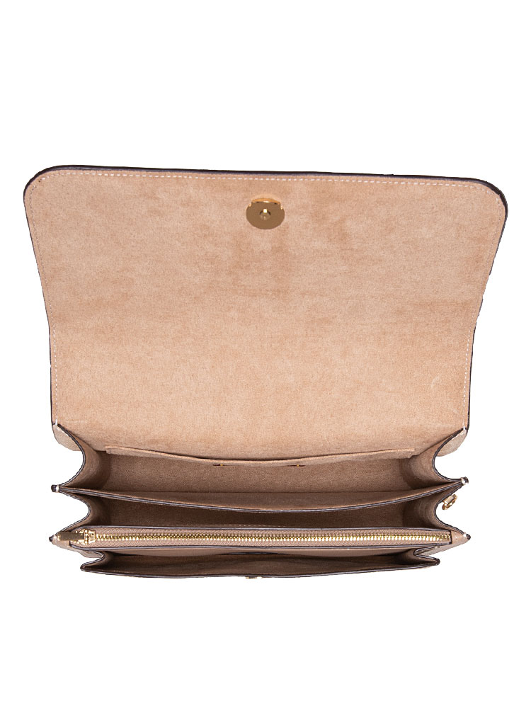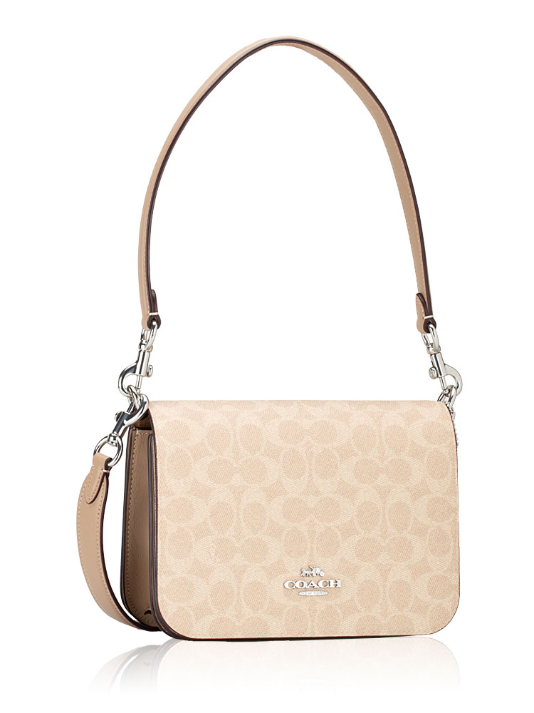 Made of signature coated canvas and smooth leather. The bag features a magnetic closure that opens to suede lining with interior two slip pockets and exterior one slip pocket at back.