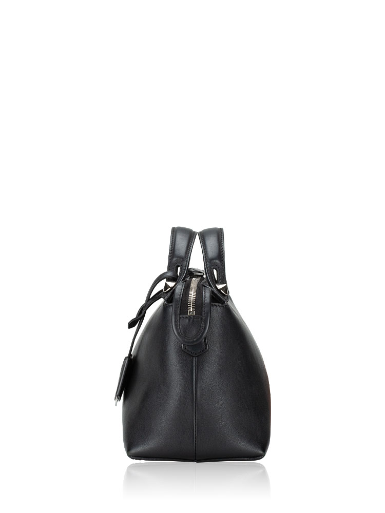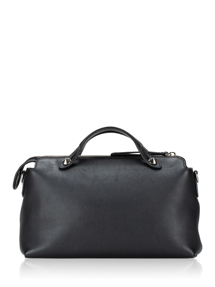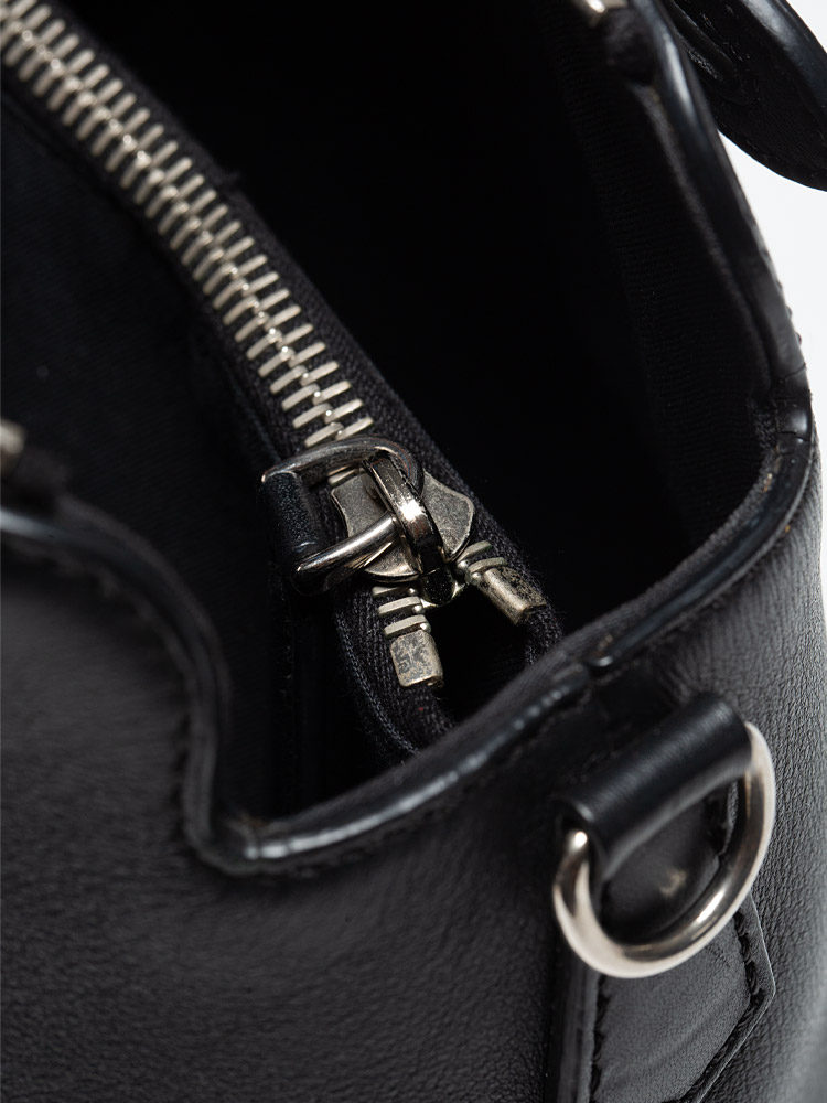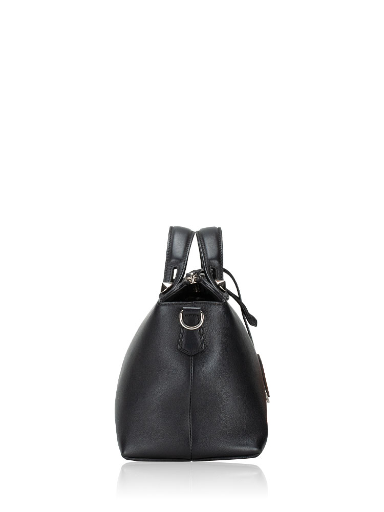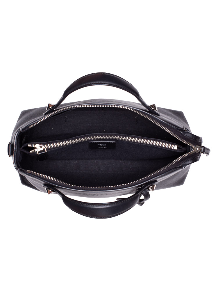 Crafted of calfskin leather. It features top handles with studs and a cross body shoulder strap with adjustable clasps. The top zipper opens to a jacquard interior with a central zipper compartment and patch pockets.