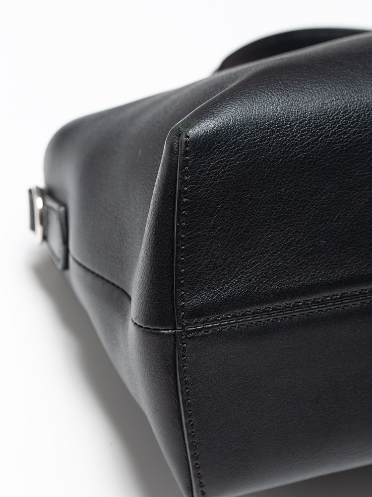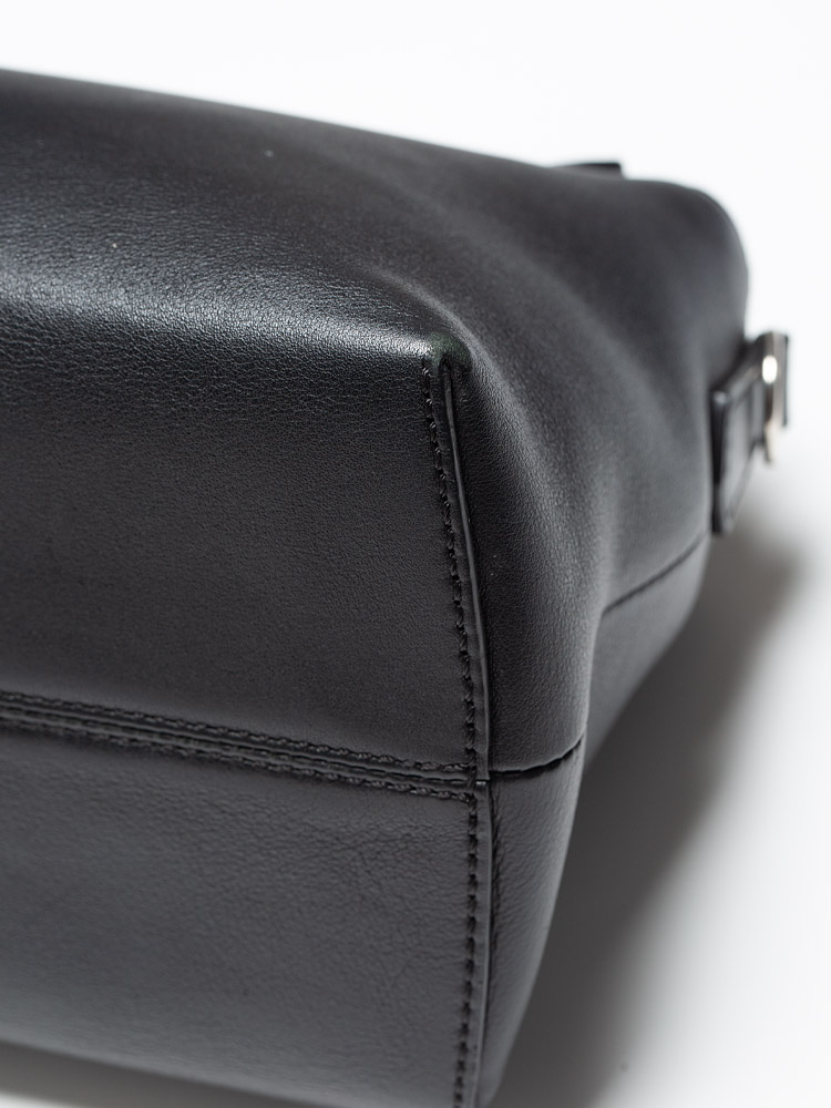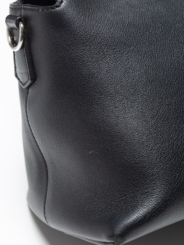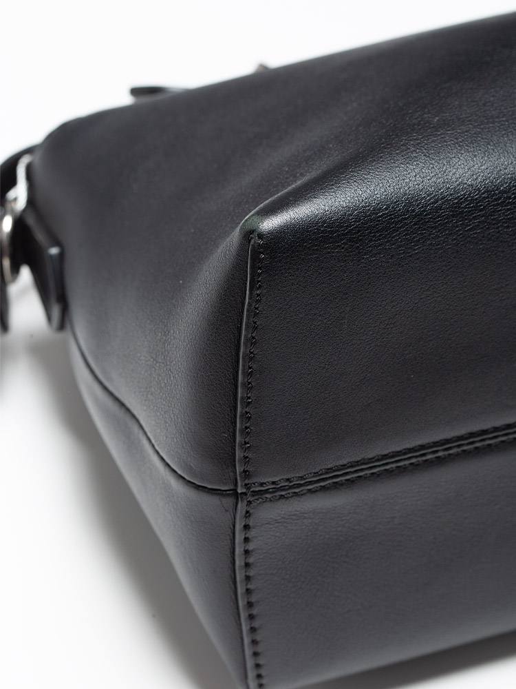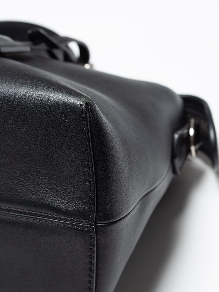 Crafted of calfskin leather. It features top handles with studs and a cross body shoulder strap with adjustable clasps. The top zipper opens to a jacquard interior with a central zipper compartment and patch pockets.
