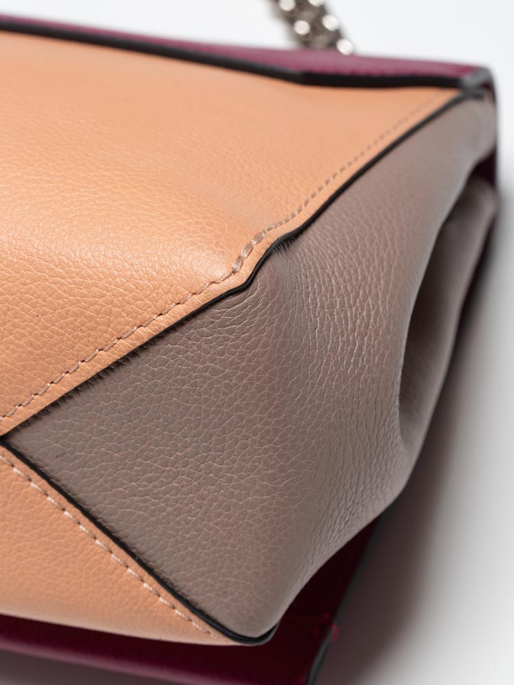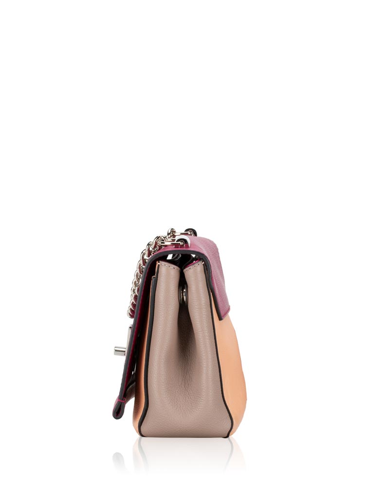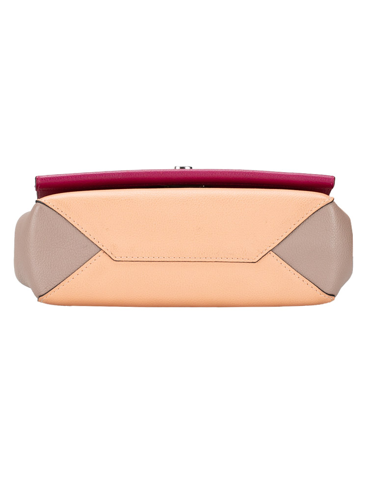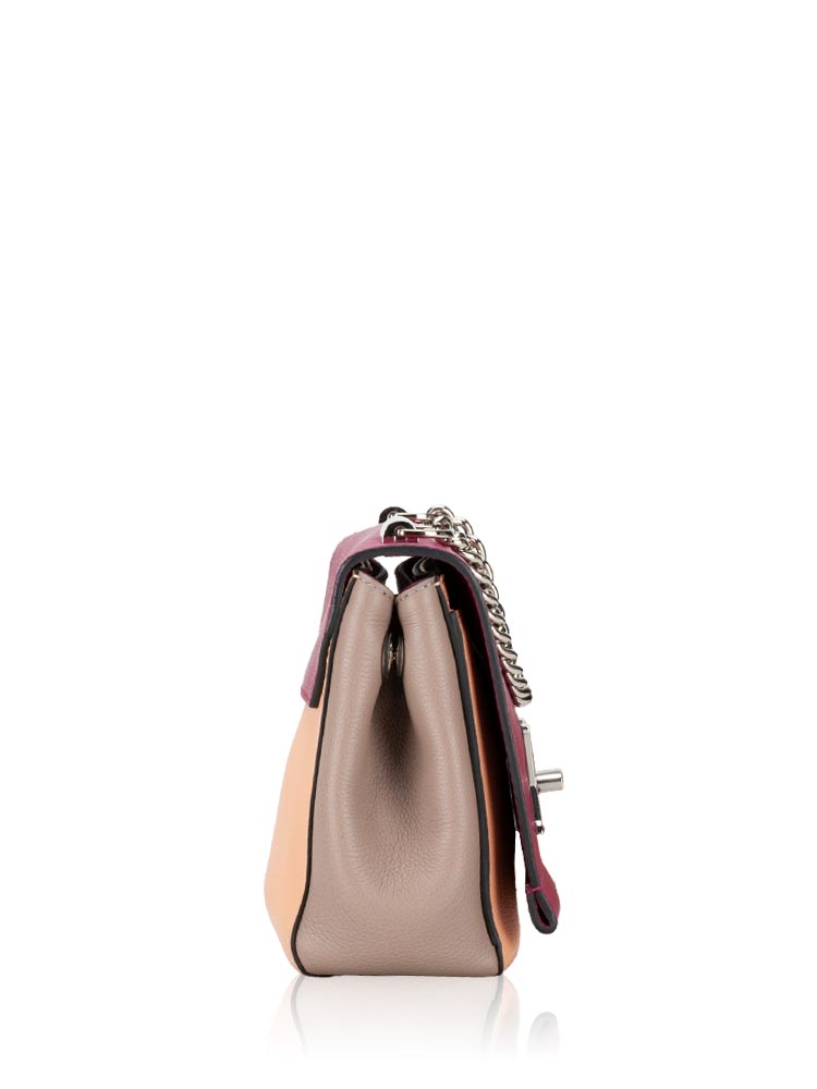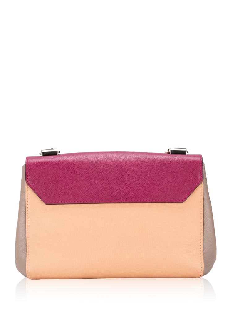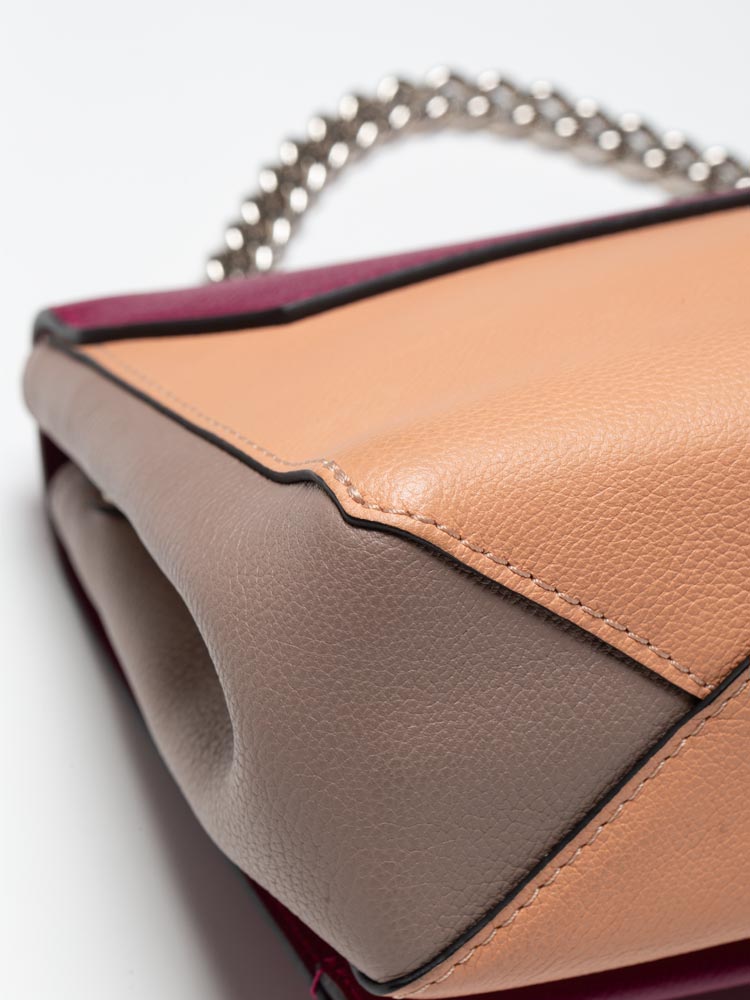 This bag is crafted of supple calfskin leather in purple, coral, and grey. Features a silver chain handle and an optional purple leather crossbody strap with added shoulder pad.