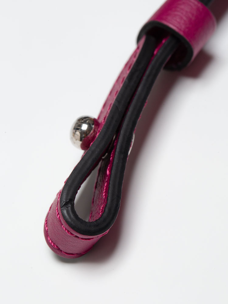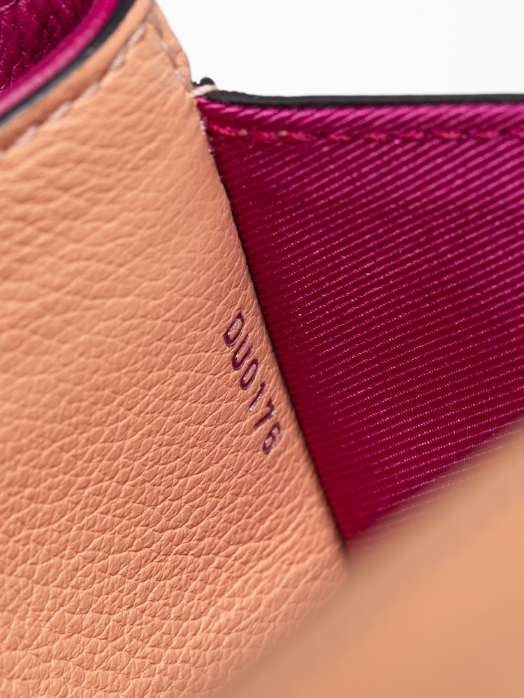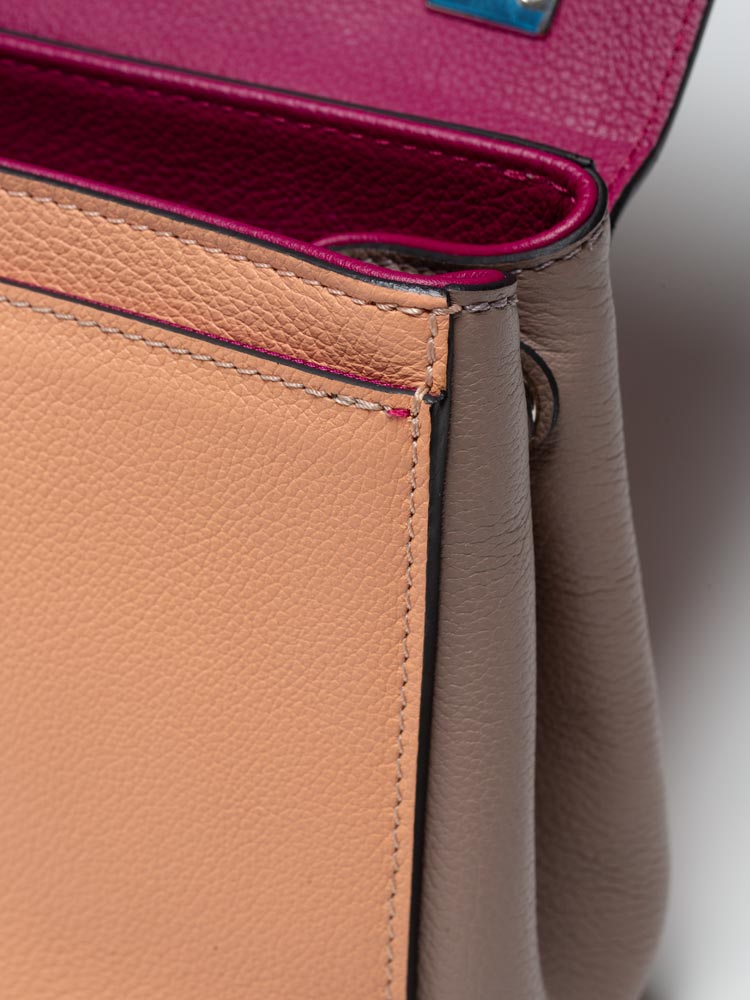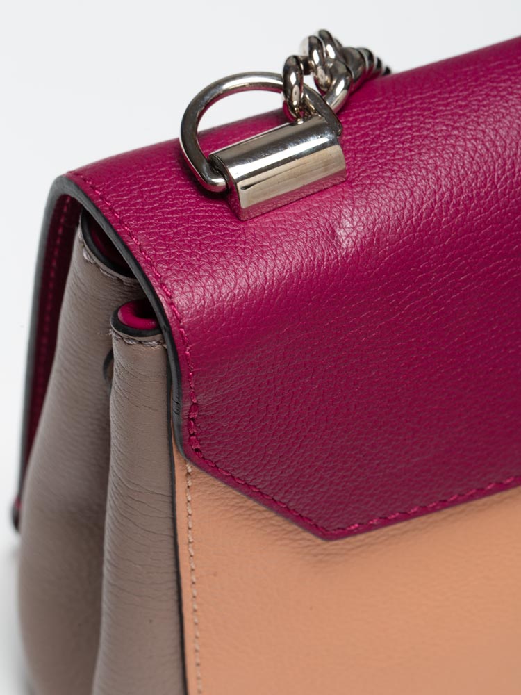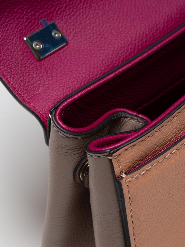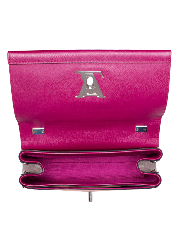 This bag is crafted of supple calfskin leather in purple, coral, and grey. Features a silver chain handle and an optional purple leather crossbody strap with added shoulder pad.