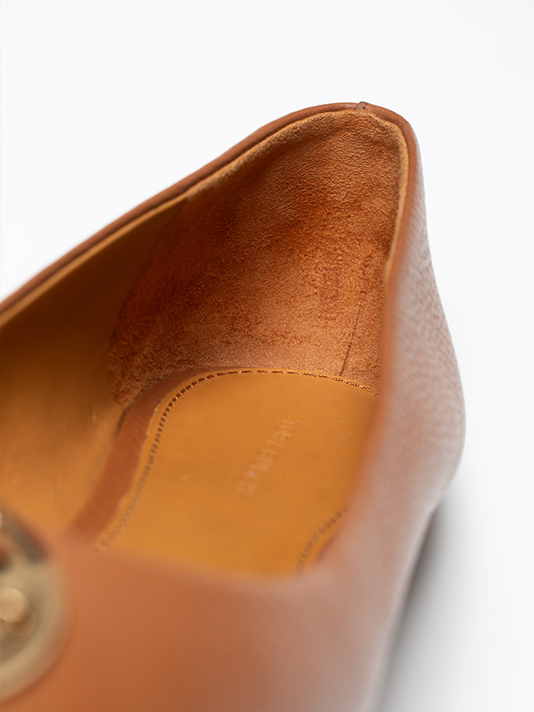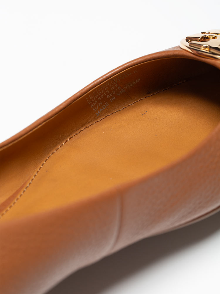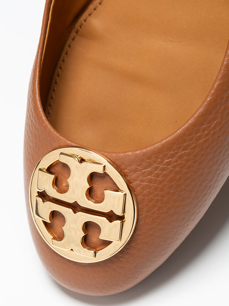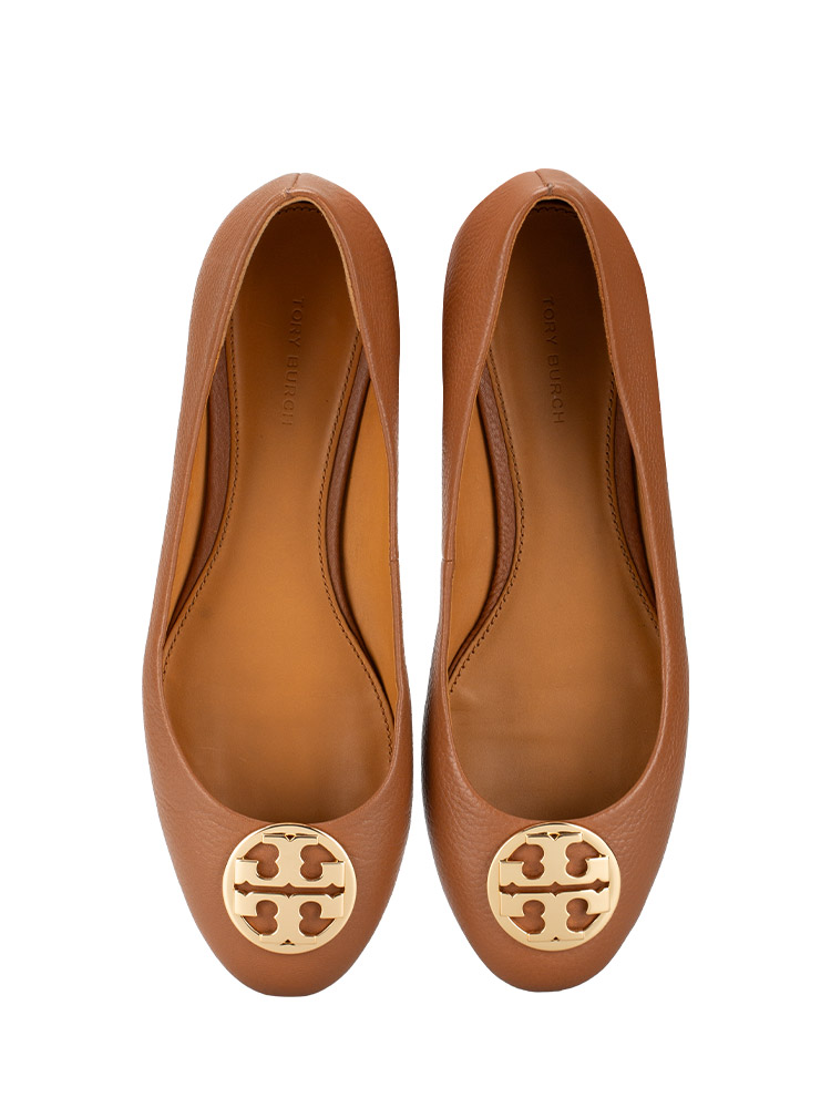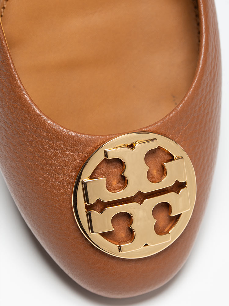Made of tumbled leather and rubber outsole. The shoe features a closed round toe with Tory Burch metal medallion logo on toe.