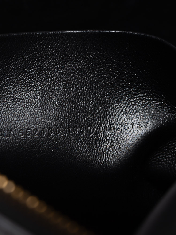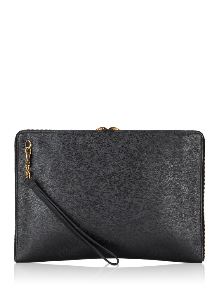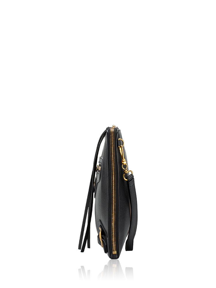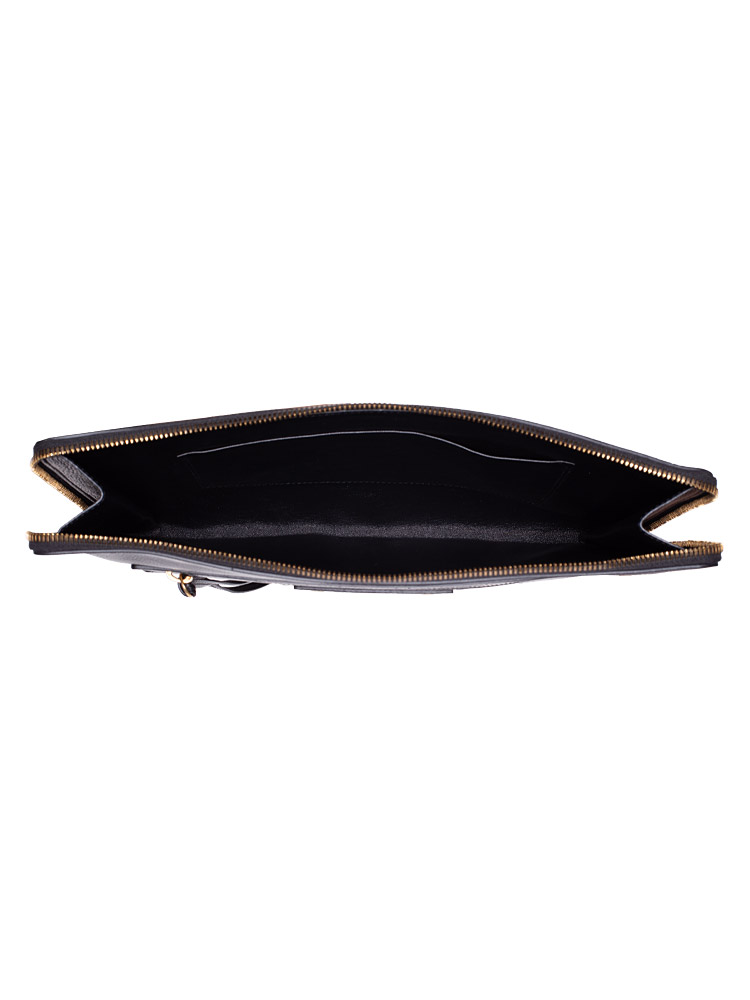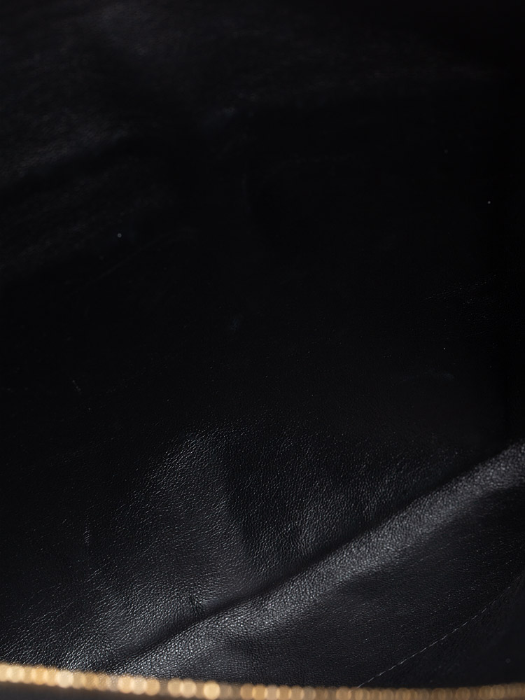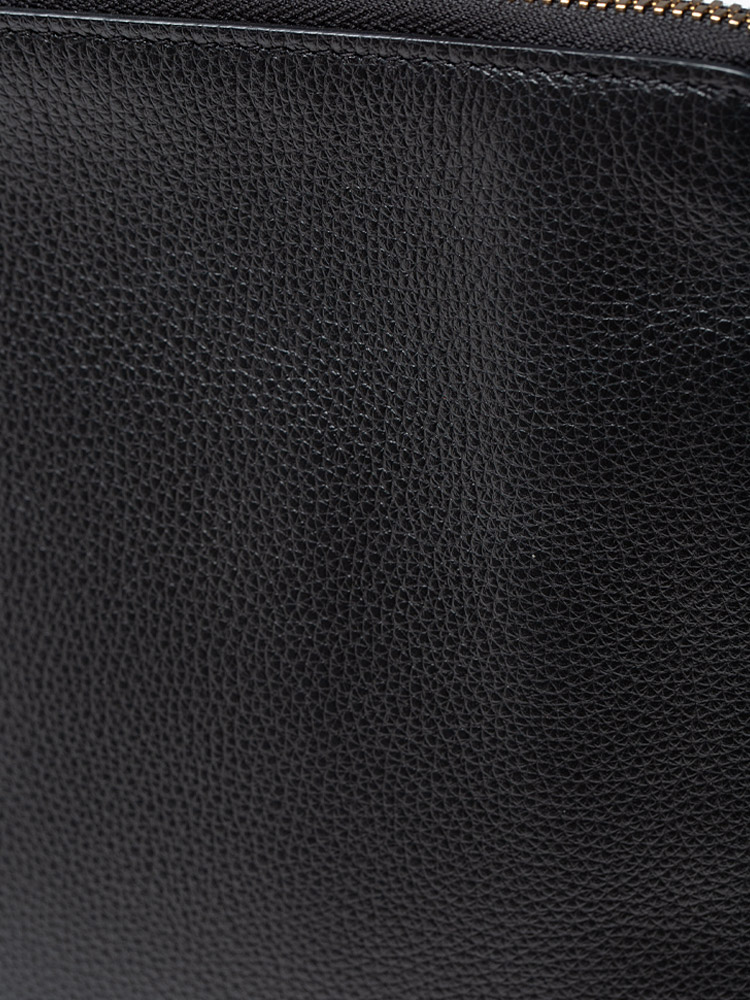 This bag is crafted of grained calfskin leather material. It features with front zipper pocket and studs. The top zipper opens to leather interior with patch pocket.