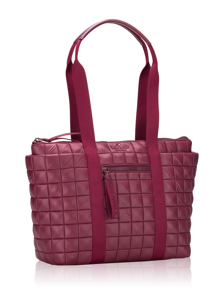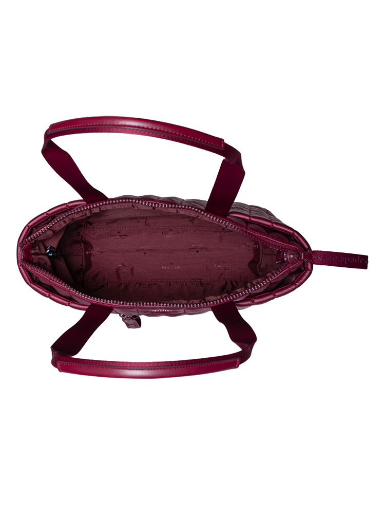 Made of quilted polyester. The bag features a zip closure that opens to polyester lining with interior one zip pocket, two slip pockets, exterior one zip pocket, two side pockets, double handles drop 29 cm.