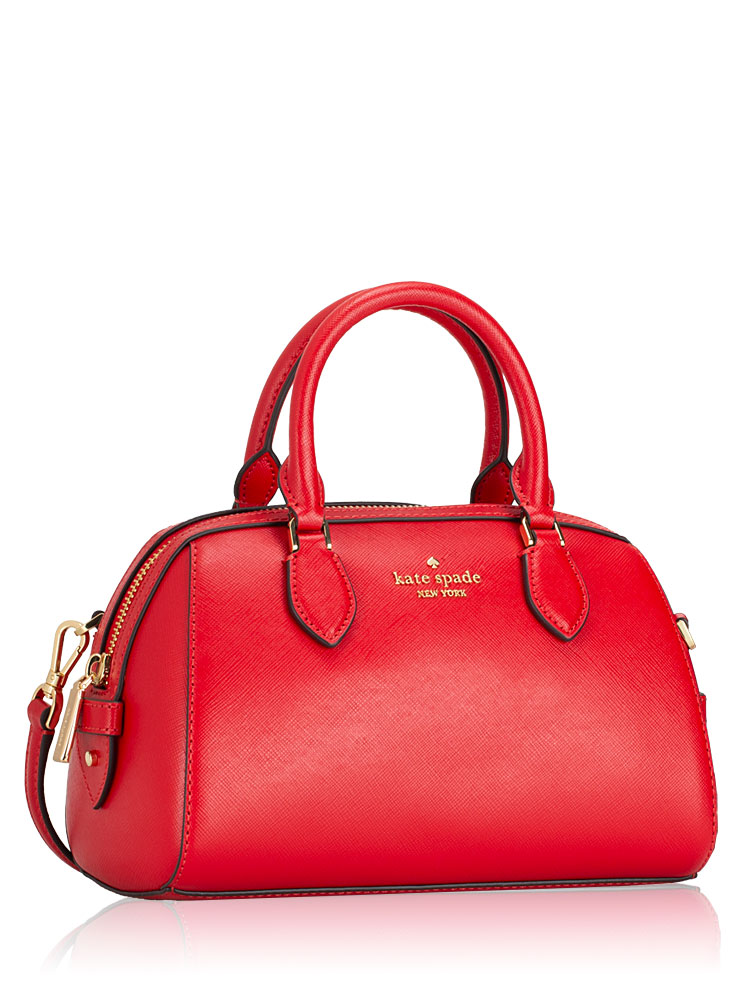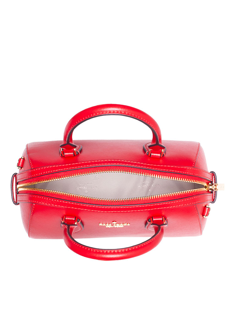 Made of saffiano leather. The bag features a zip closure that opens to polyester lining with one slip pocket, double handles drop 10 cm.