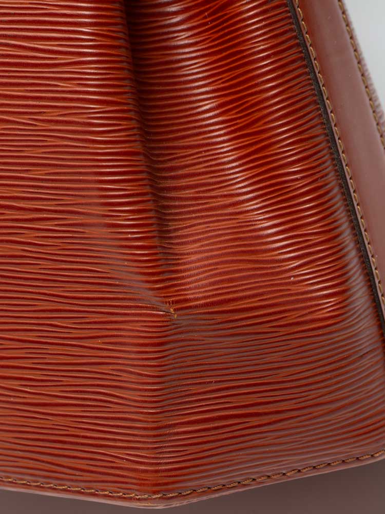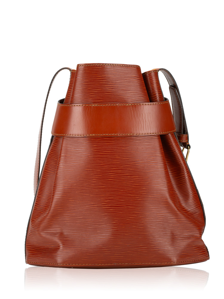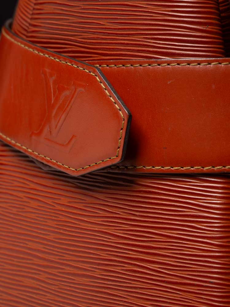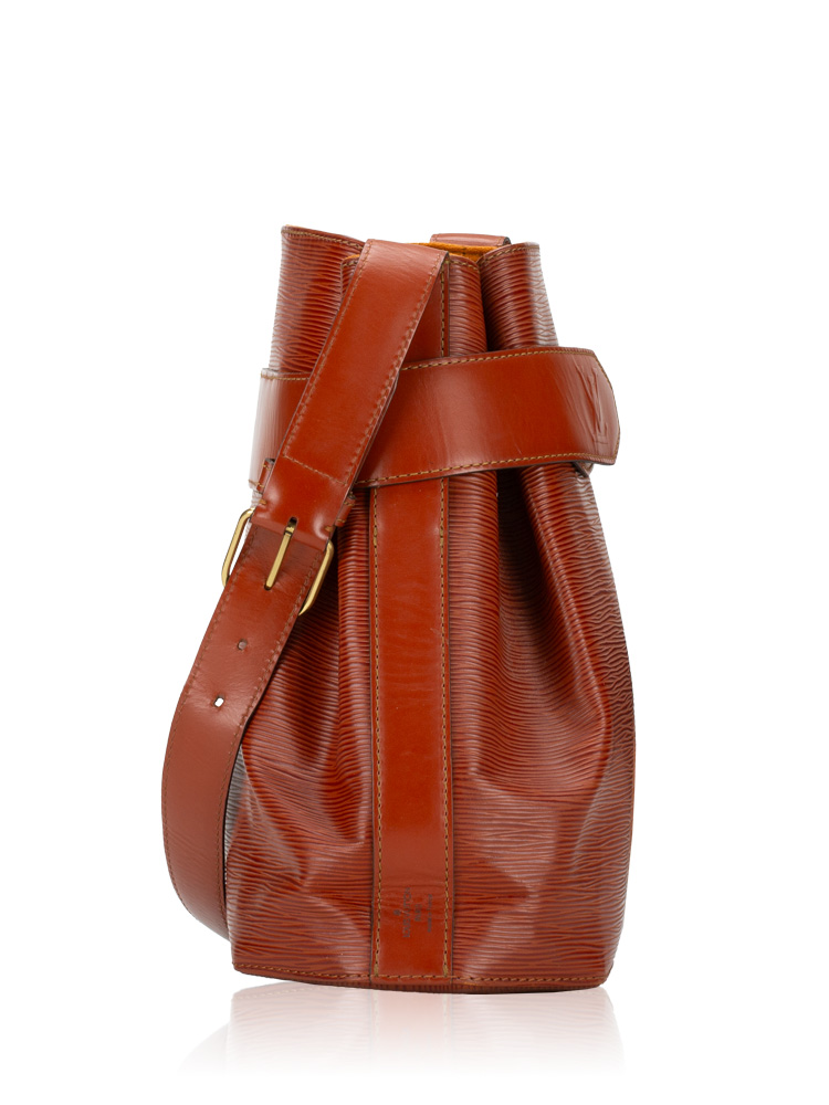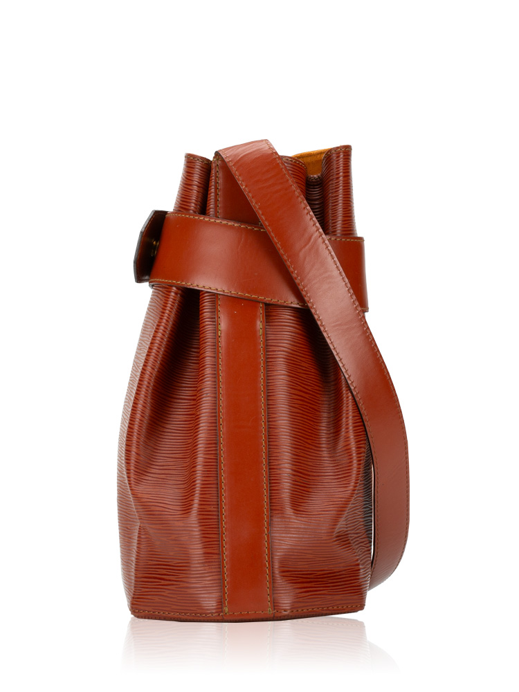 This bag is crafted of epi leather with smooth decorative trimming. Features with an adjustable shoulder strap that extends into a trim cinched with an LV embossed belt across the top. The top opens to a spacious microfiber interior.