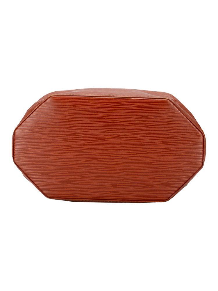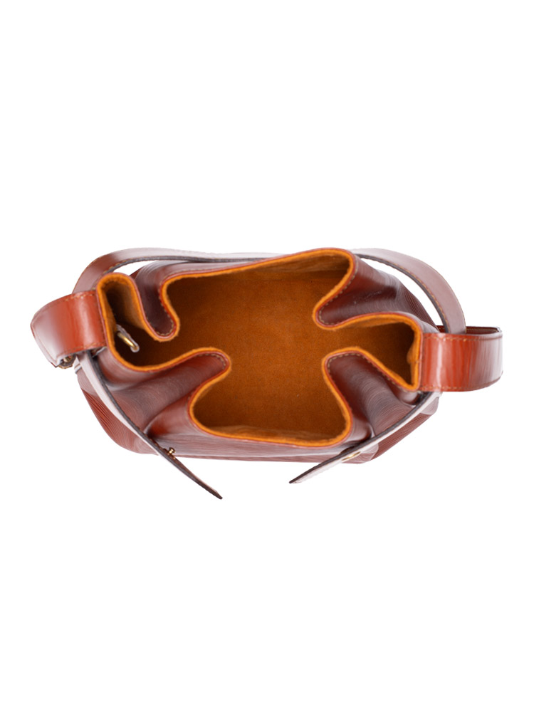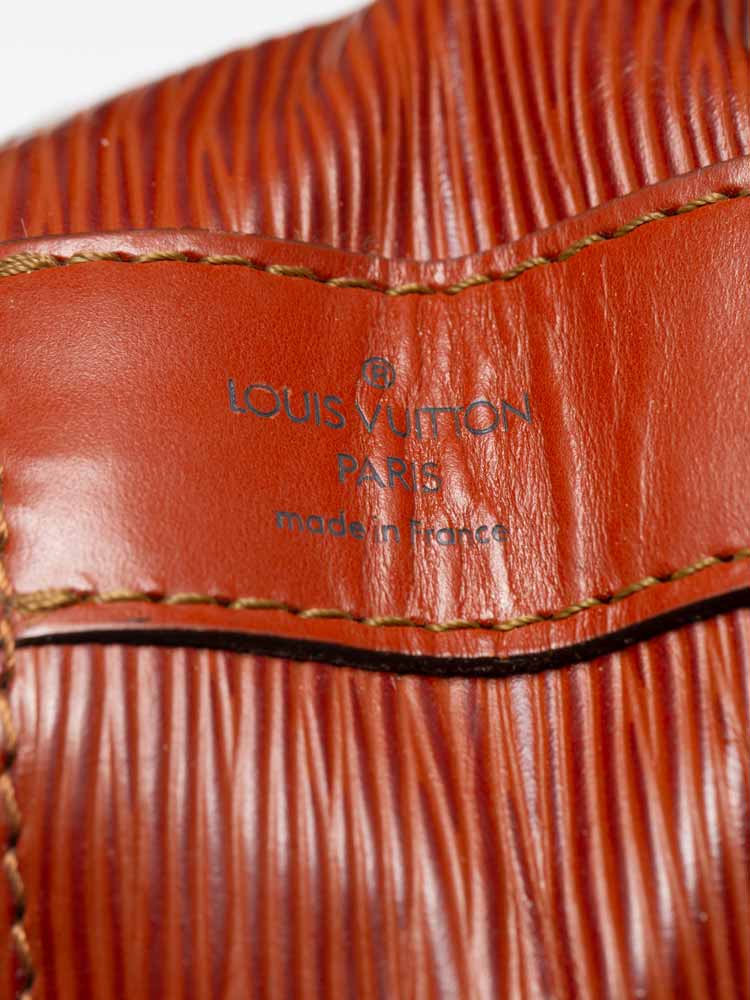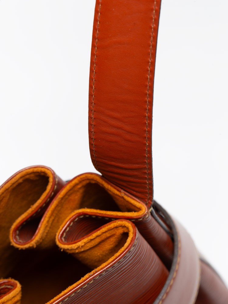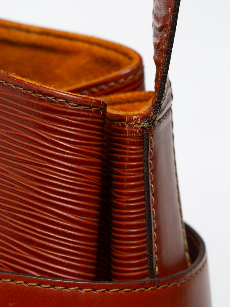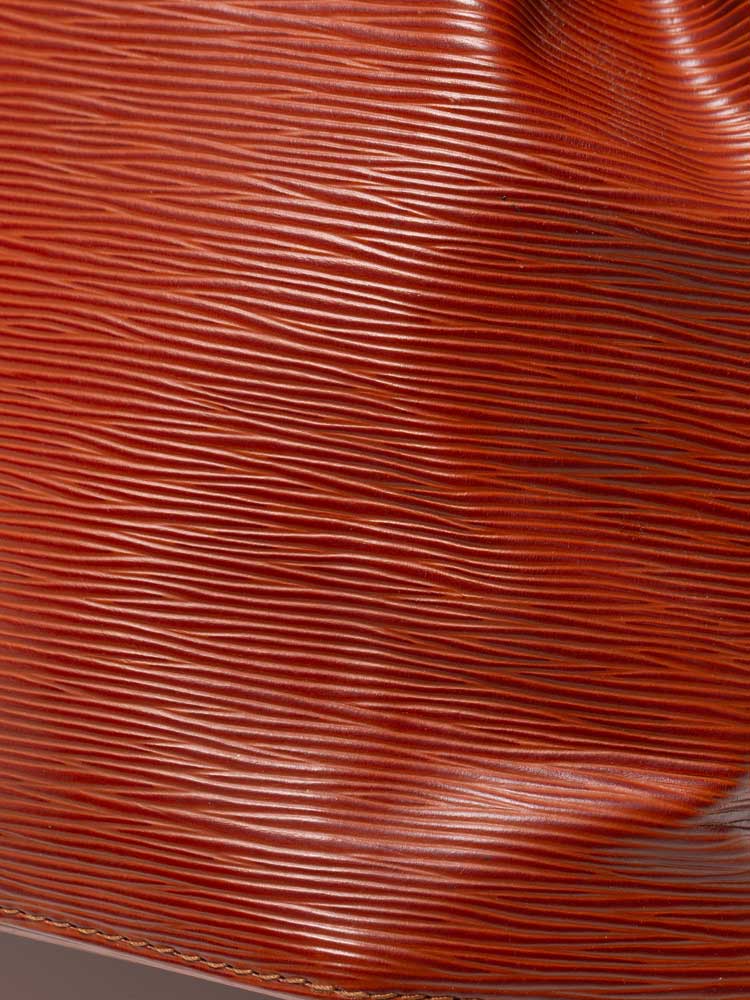 This bag is crafted of epi leather with smooth decorative trimming. Features with an adjustable shoulder strap that extends into a trim cinched with an LV embossed belt across the top. The top opens to a spacious microfiber interior.