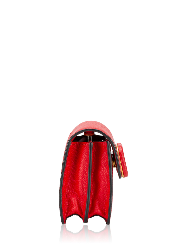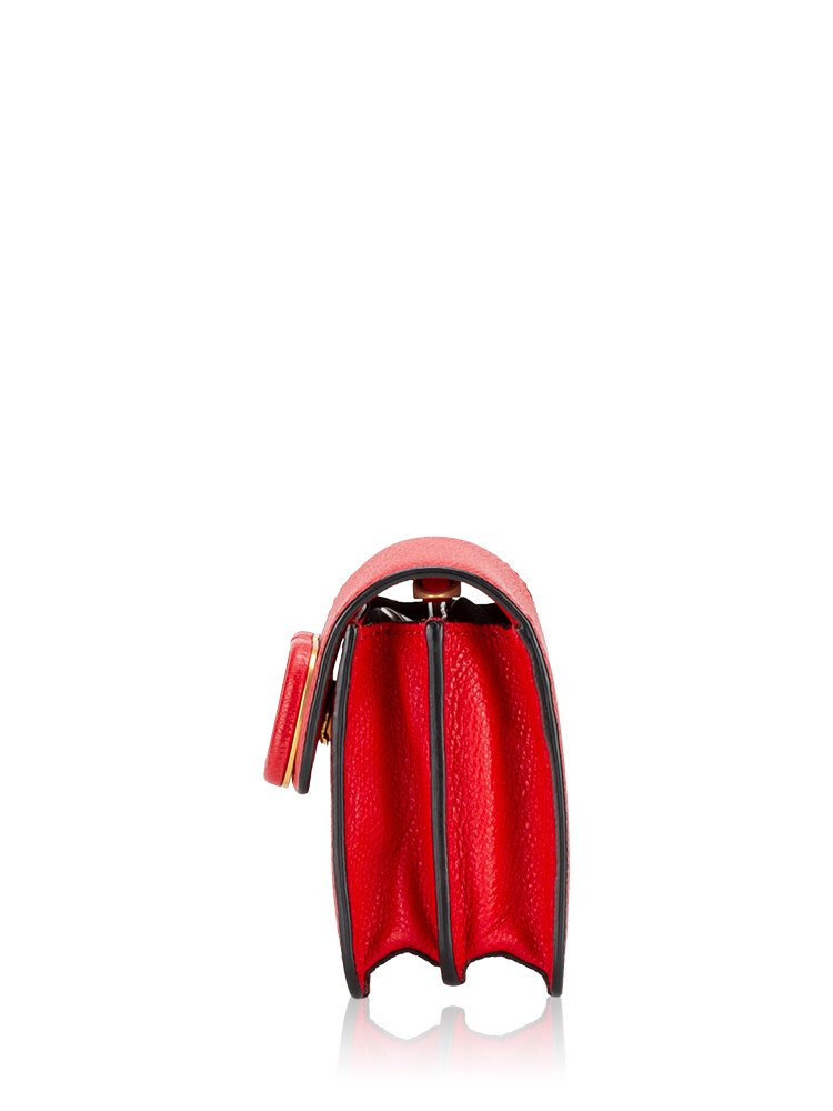 Crafted of calfskin leather. It features a magnetic closure with a leather-covered logo, and a leather and chain-link shoulder strap. The magnetic flap opens to a leather and fabric interior with card slots.