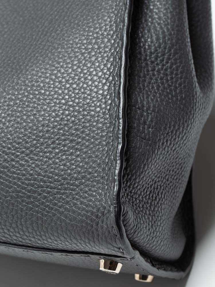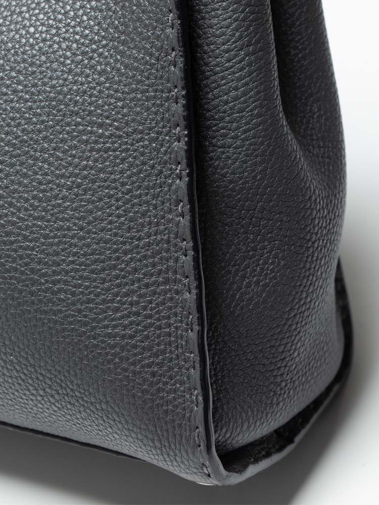Crafted of richly grained calfskin leather with hand-stitched border trim. The bag features a polished silver turn lock on each side that open to a leather and suede interior with a zipper pocket.