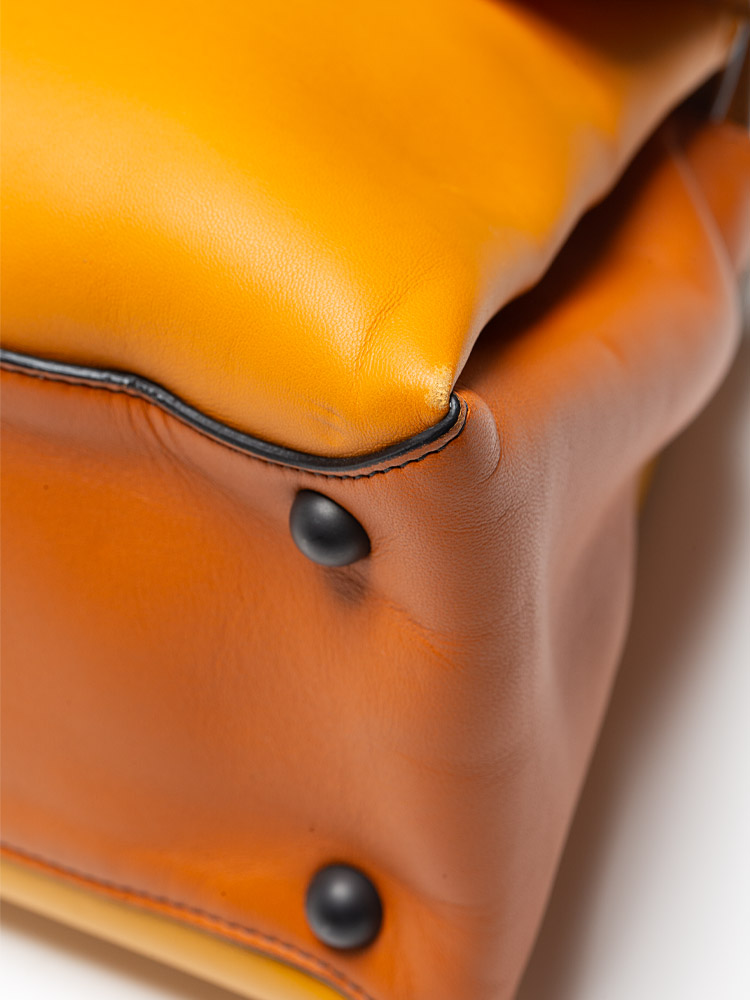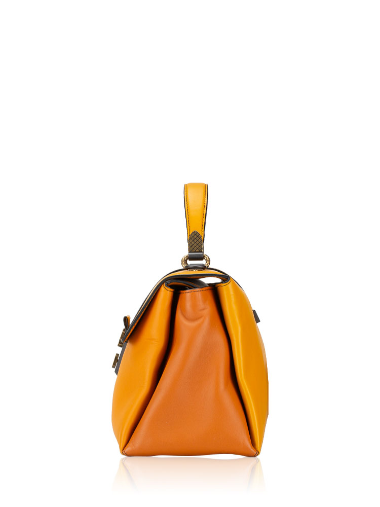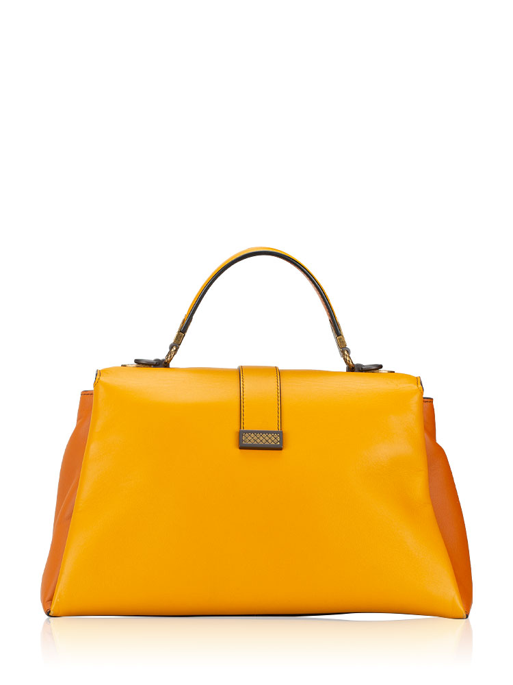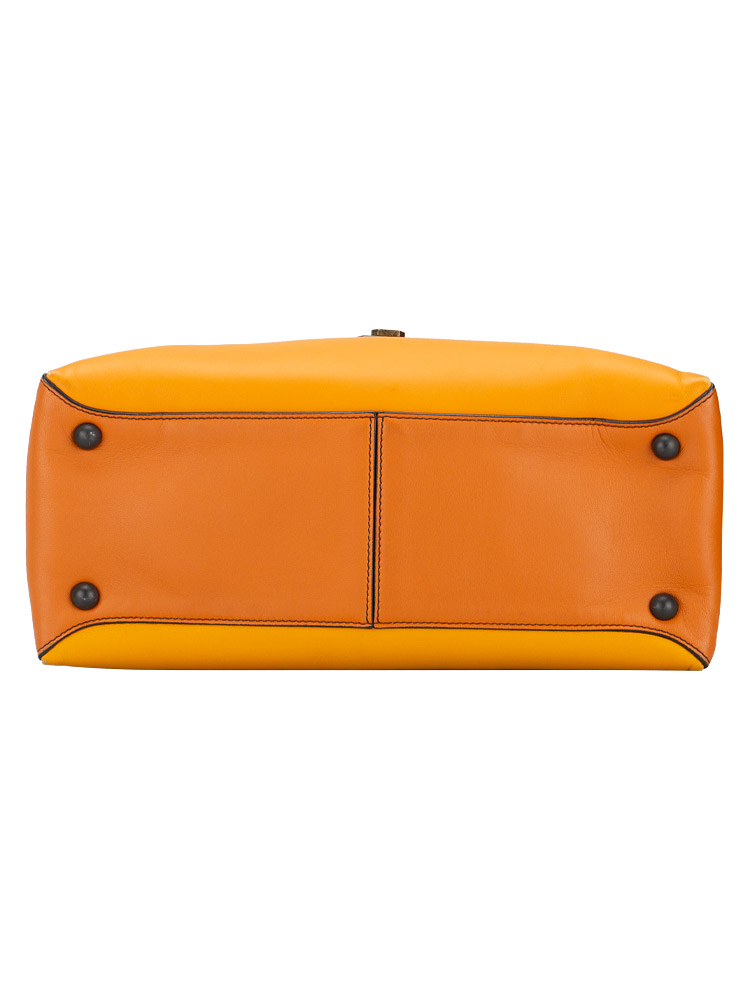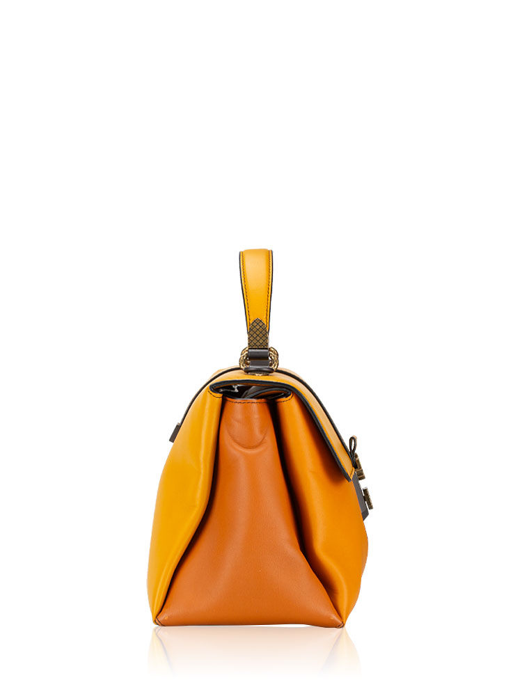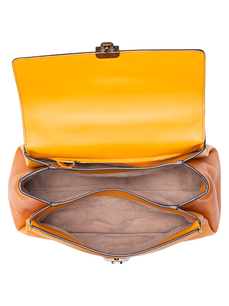 Crafted of soft nappa leather. The bag features a top handle, leather shoulder strap with aged brass metal links and a half-facing flap with a quilted brass closure. This opens to a taupe suede interior.