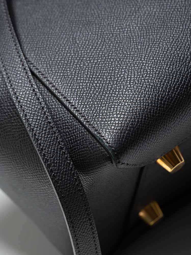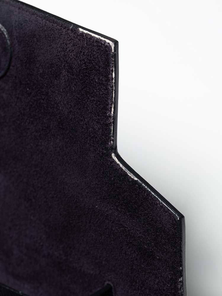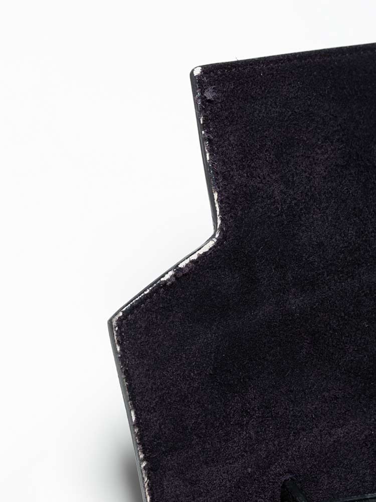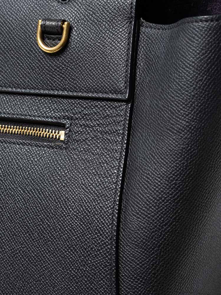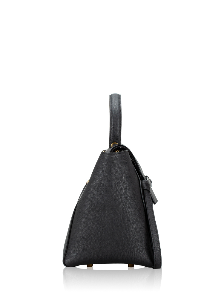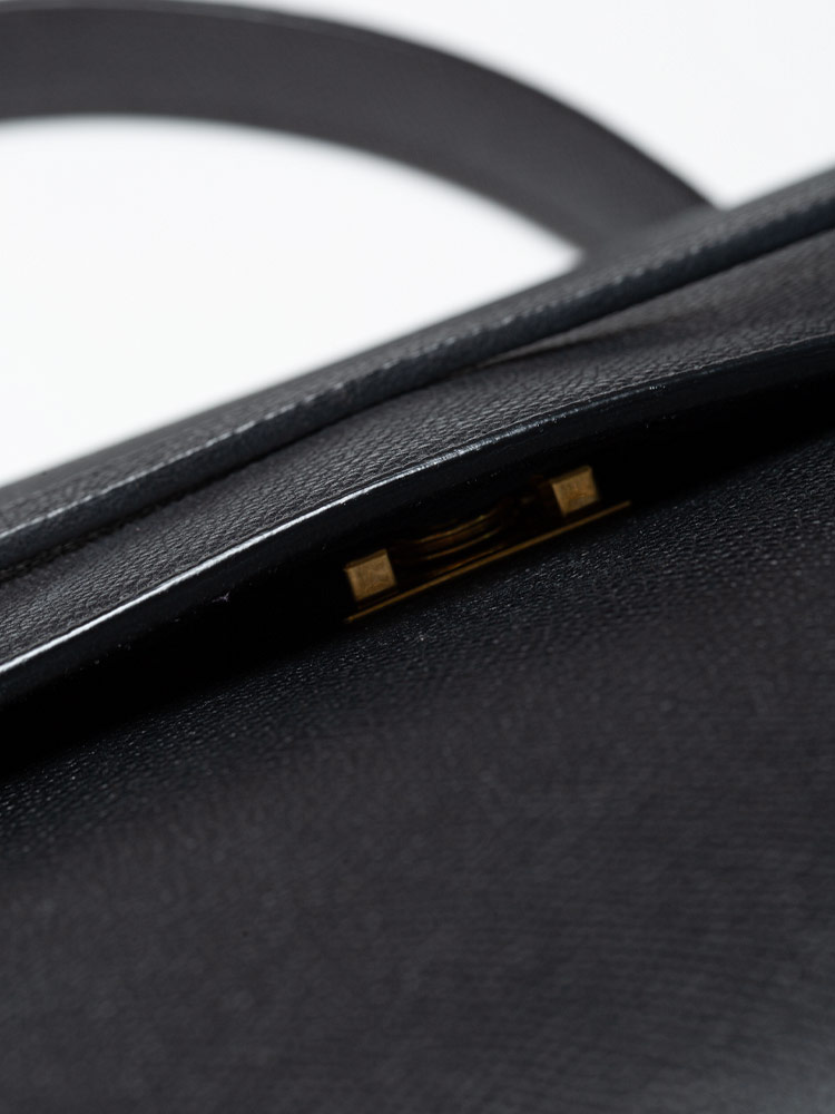 Crafted of grained calfskin leather. This bag features a leather top handle, a cross-over flap, and a zipper pocket on the rear side. The flap opens to a suede interior with a hanging leather pocket.