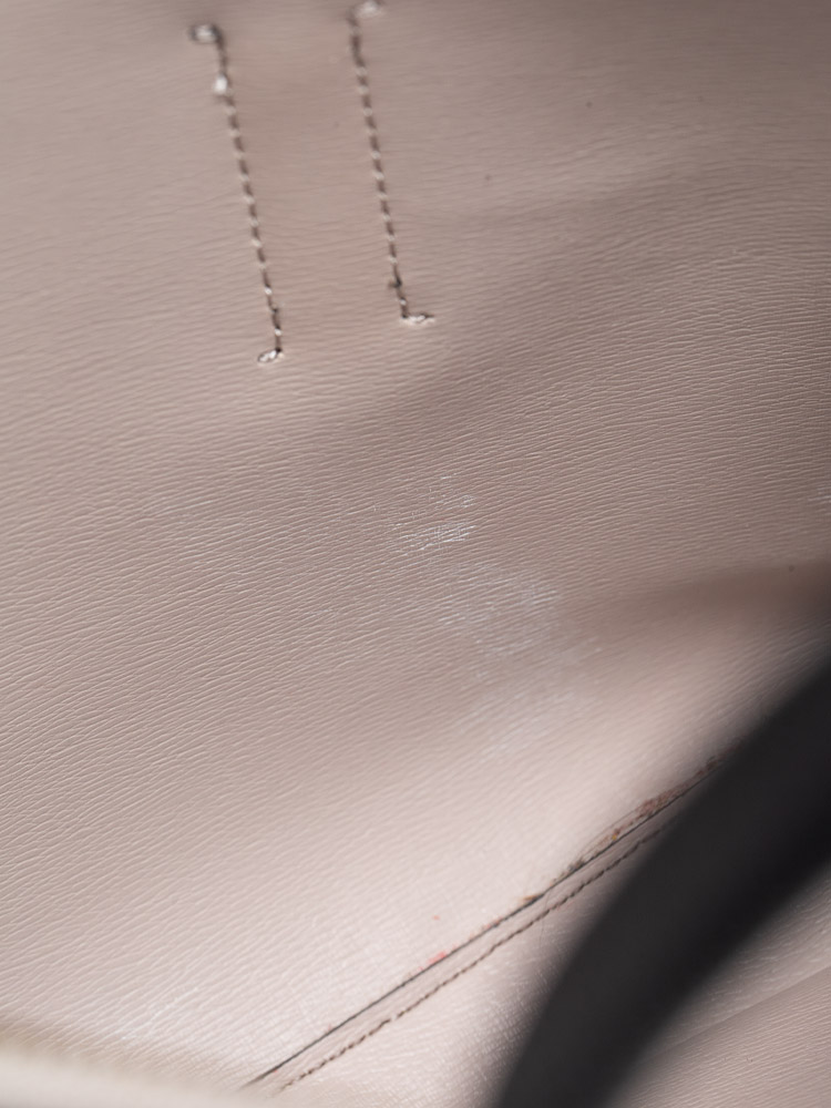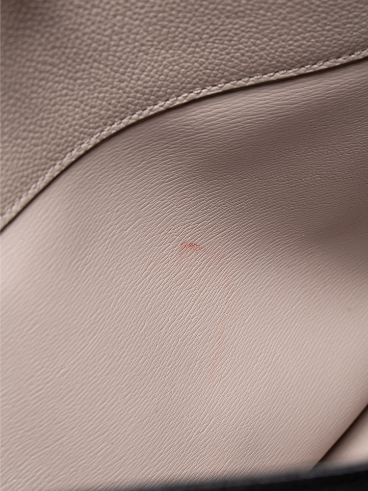 Made of Pebble leather. It comes with 1 slide pocket, 1 zipper pocket, dual exterior pockets. It has an optional strap that can be adjusted in length to your needs.