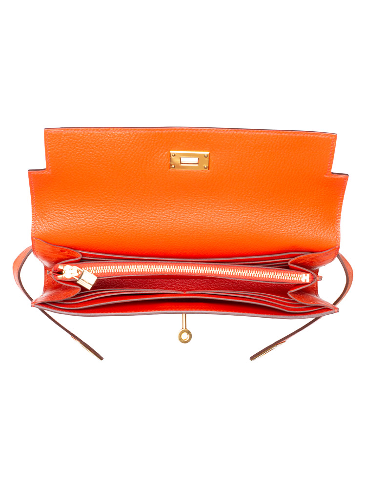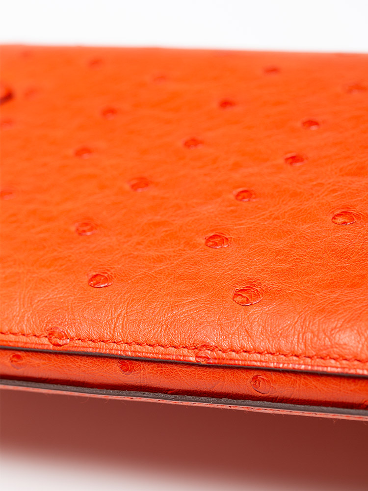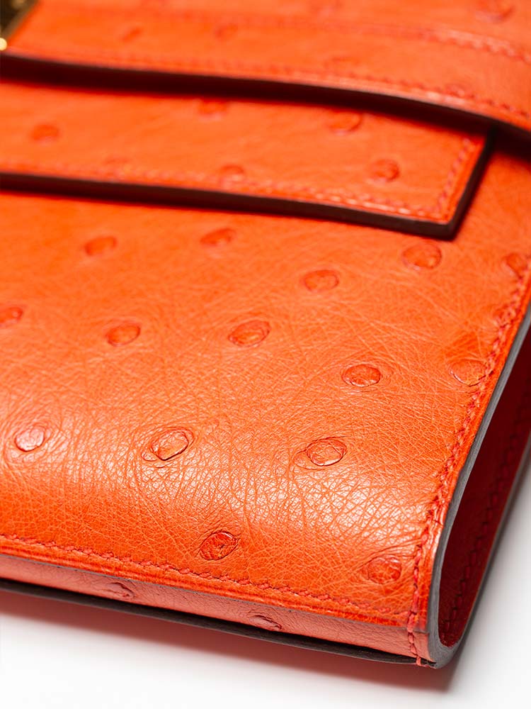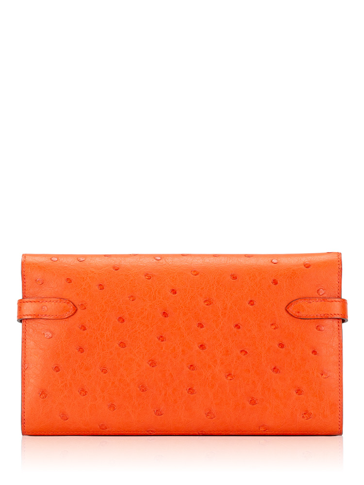 This wallet is crafted of textured ostrich leather. It features a strap closure, with a gold plated Kelly turn lock. The flap opens to a goatskin leather interior with two card slots panels, a partition zipper compartment, and flat pockets.