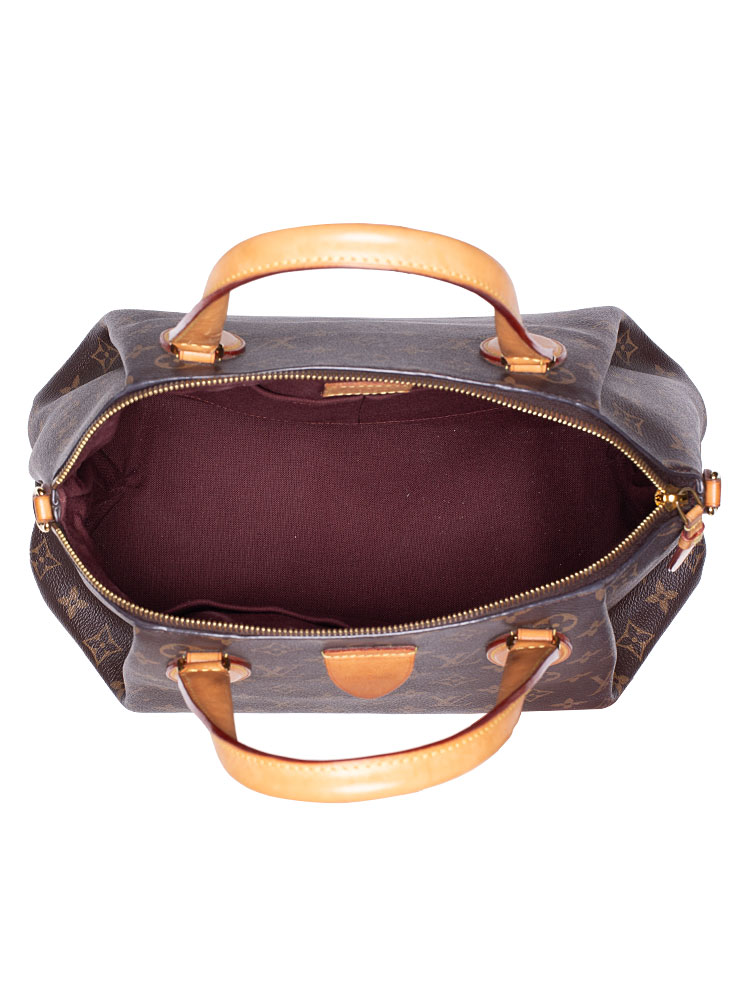 This bag is crafted of Louis Vuitton Monogram coated canvas. It features vachetta trim, double top handles, and an optional shoulder strap. The top zipper opens to a fabric interior with patch pockets.