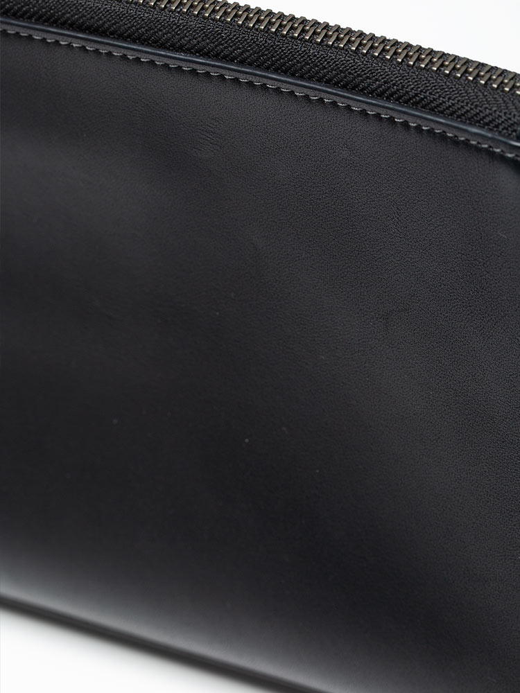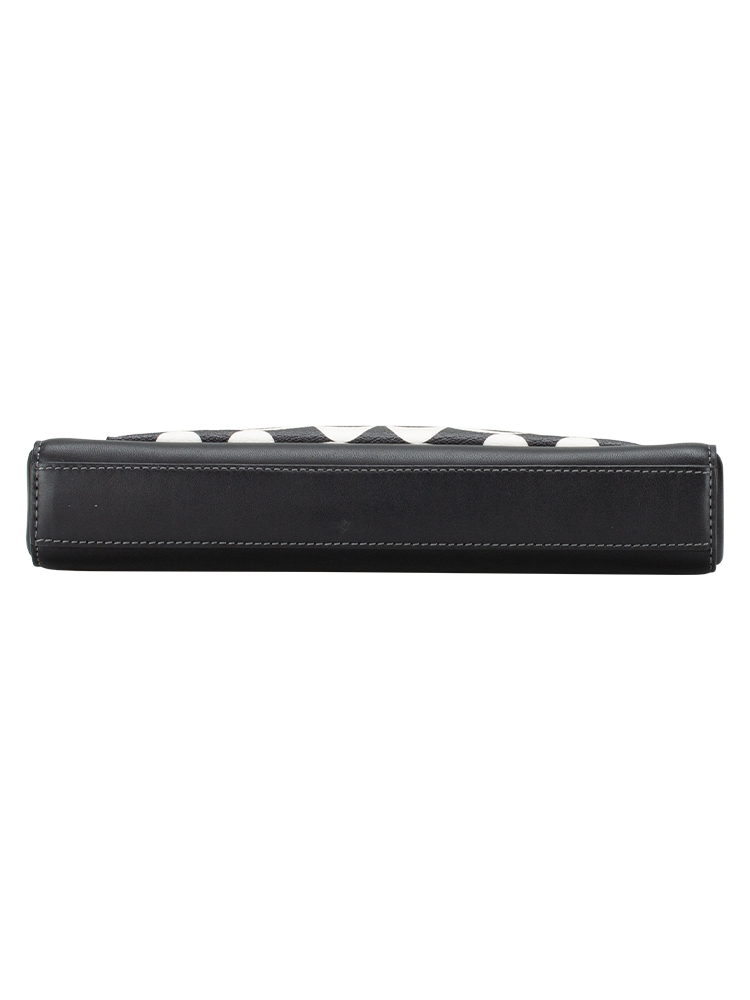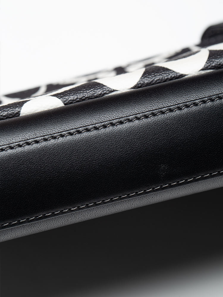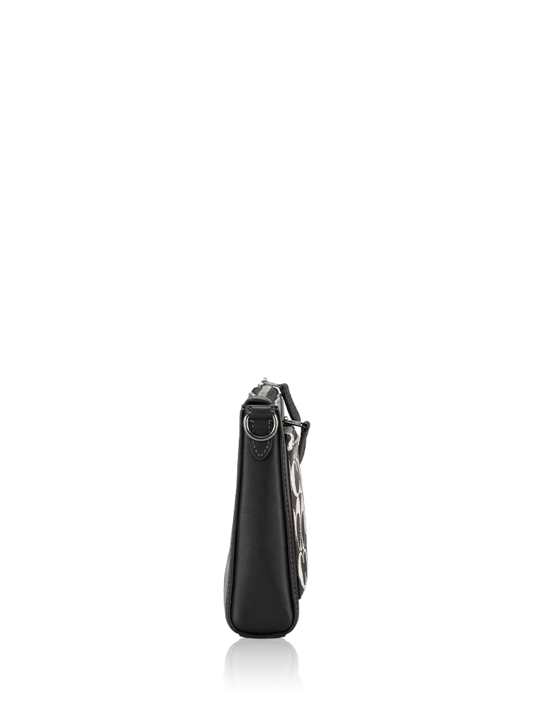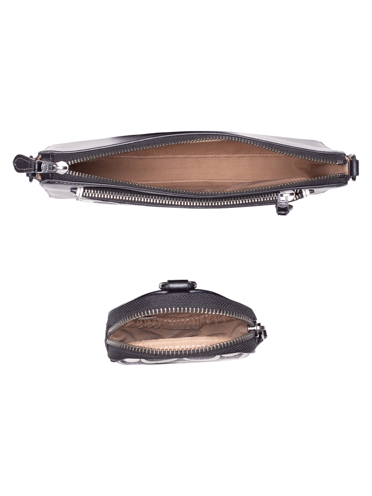 Made of signature coated canvas with smooth leather. The bag features a zip closure that opens to fabric lining with exterior one zip pocket at front.