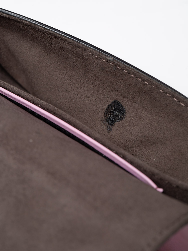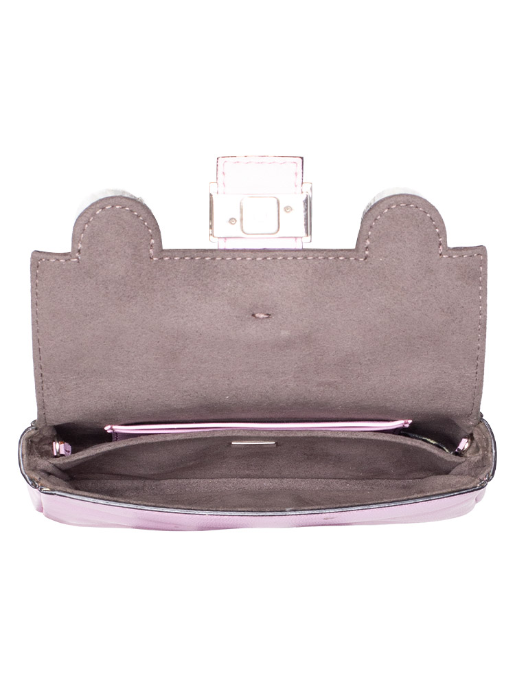 Crafted of nappa leather. It features an adjustable shoulder strap, a charming "Buggie" face with two mink fur, eyes and a facing flap with two crystals. The flap opens to a suede interior.